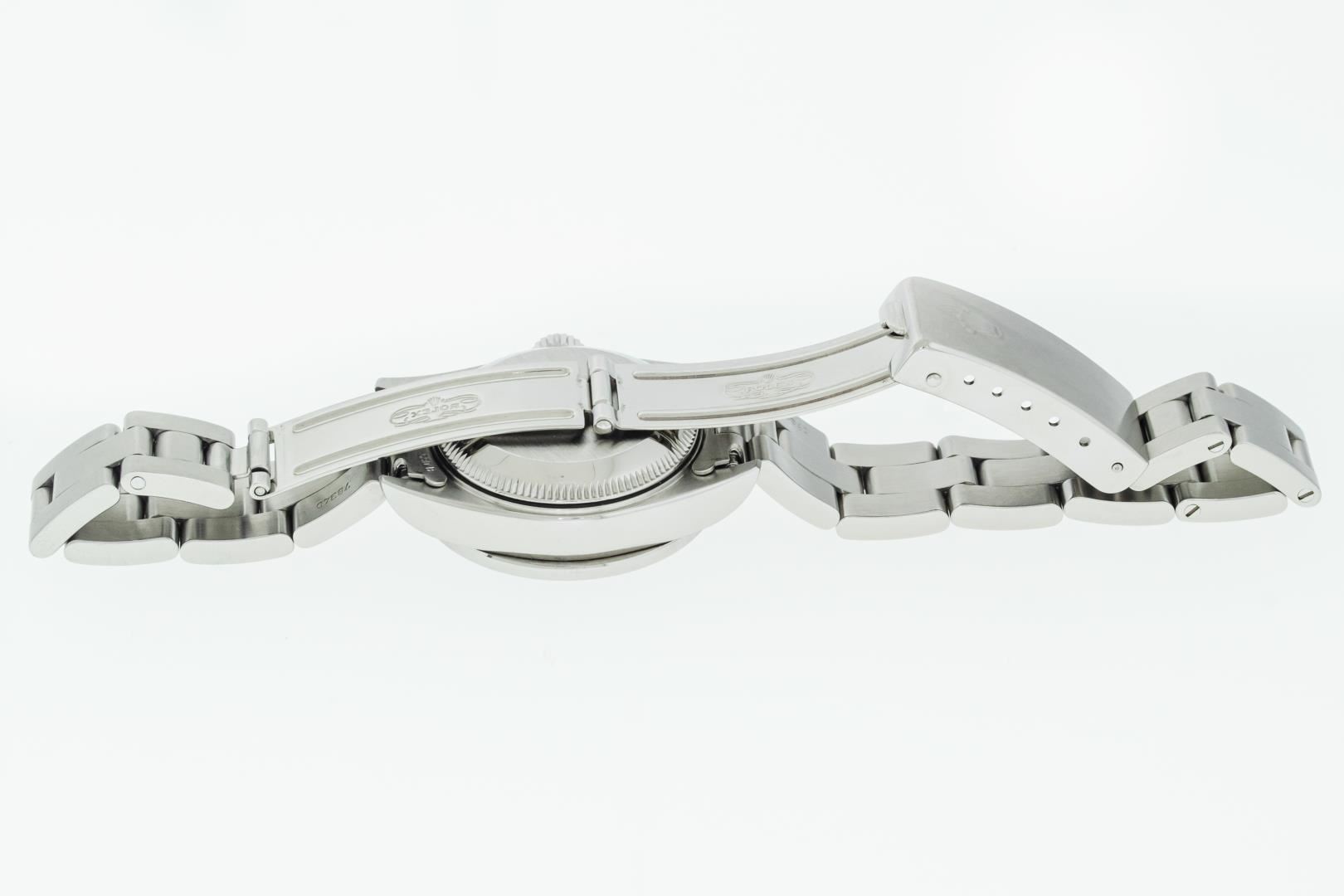 One Ladies Pre Owned Quickset Stainless Steel Rolex Datejust Polished Bright with Satin Finish, Serviced & Electronically Tested, Stainless Steel Case: 26mm, Rolex Stainless Steel Crown, Custom Bezel: New Stainless Steel Bead Set Diamond Bezel, Diamond Count: 40 Diamonds, Clarity: SI-VS, Color: G to H. Custom Crystal: New Sapphire With Magnified Date Window. Custom Hands: New Luminescent Hands. Rolex Movement: Automatic Winding Movement 2235. Rolex Dial: Black With Index Hour Markers & Dash Track. Date Window: 3 O'Clock Position Date Display, Model: Quickset Datejust. Condition: G-6 Extra Fine. Rolex Bracelet: Stainless Steel Oyster Band. Bright Polish & Satin Finish. 6.0 Inch Length, Adjustable. Standard Clasp, With Rolex Logo. This Watch Has Been Serviced Time Tested And Is In Excellent Condition It Is Free Of All Scratches And Dents.
