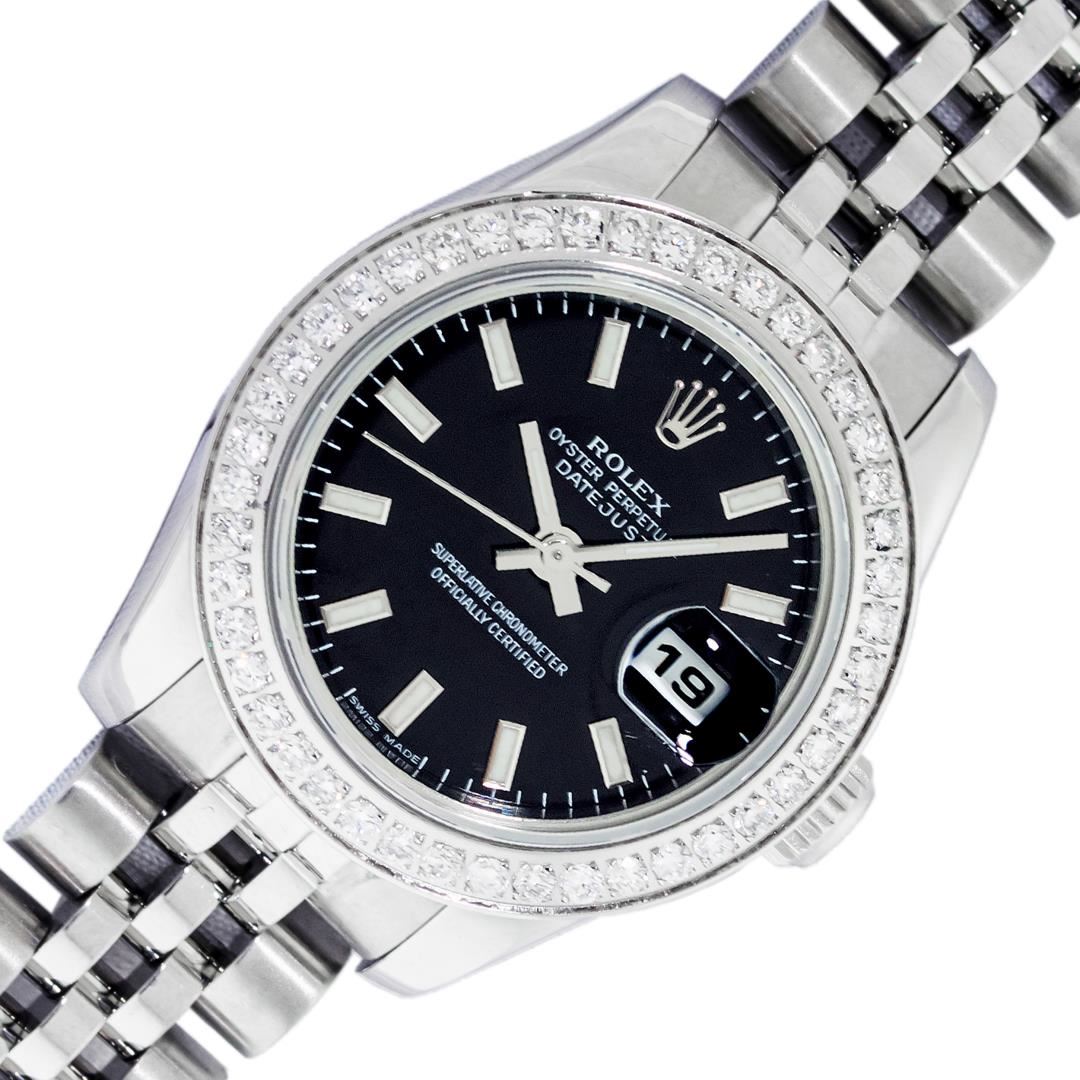 One Ladies Pre Owned Sapphire Quickset Stainless Steel Rolex Datejust Polished Bright with Satin Finish, Serviced & Electronically Tested, Rolex Stainless Steel Case: 26mm, Rolex Stainless Steel Crown, Custom Bezel: New Stainless Steel Beadset Diamond Bezel, Diamond Count: 40 Diamonds On Bezel. Crystal: Sapphire With Magnified Date Window. Hands: Luminescent Hands. Rolex Movement: Automatic Winding Movement 2235. Rolex Dial: Black Index With Dash Track. Date Window: 3 O'Clock Position Date Display, Model: Quickset Datejust. Condition: G-6 Extra Fine. Rolex Bracelet: Stainless Steel Jubilee Band. Bright Polish & Satin Finish. 6.0 Inch Length, Adjustable. Hidden Clap, With Rolex Logo. This Watch Has Been Serviced Time Tested And Is In Excellent Condition It Is Free Of All Scratches And Dents.