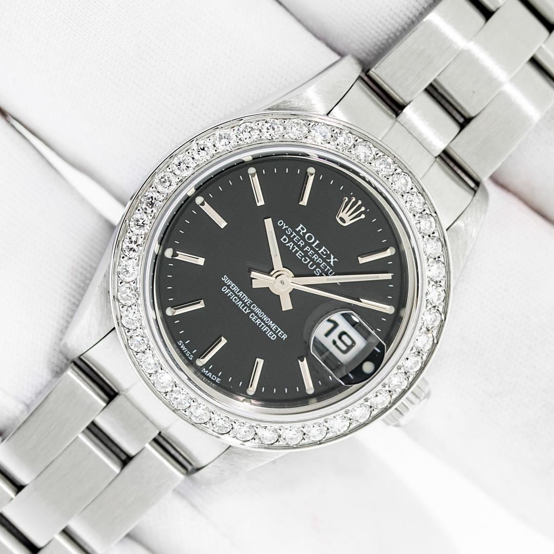 One Ladies Pre Owned Quickset Stainless Steel Rolex Datejust Polished Bright with Satin Finish, Serviced & Electronically Tested, Stainless Steel Case: 26mm, Rolex Stainless Steel Crown, Custom Bezel: New Stainless Steel Bead Set Diamond Bezel, Diamond Count: 40 Diamonds, Clarity: SI-VS, Color: G to H. Custom Crystal: New Sapphire With Magnified Date Window. Custom Hands: New Luminescent Hands. Rolex Movement: Automatic Winding Movement 2235. Rolex Dial: Black With Index Hour Markers & Dash Track. Date Window: 3 O'Clock Position Date Display, Model: Quickset Datejust. Condition: G-6 Extra Fine. Rolex Bracelet: Stainless Steel Oyster Band. Bright Polish & Satin Finish. 6.0 Inch Length, Adjustable. Standard Clasp, With Rolex Logo. This Watch Has Been Serviced Time Tested And Is In Excellent Condition It Is Free Of All Scratches And Dents.