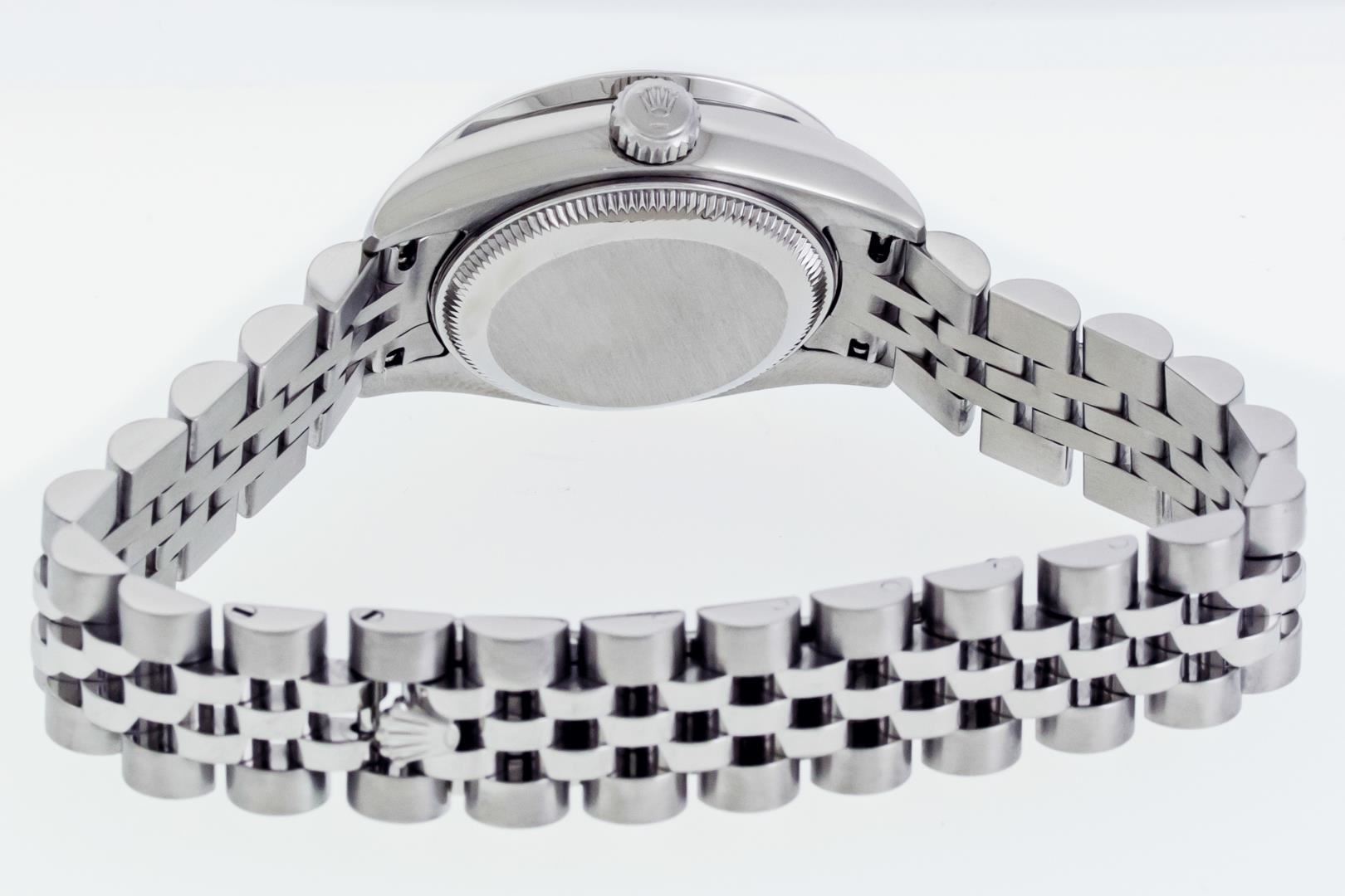 One Ladies Pre Owned Sapphire Quickset Stainless Steel Rolex Datejust Polished Bright with Satin Finish, Serviced & Electronically Tested, Rolex Stainless Steel Case: 26mm, Rolex Stainless Steel Crown, Custom Bezel: New Stainless Steel Beadset Diamond Bezel, Diamond Count: 40 Diamonds On Bezel. Crystal: Sapphire With Magnified Date Window. Hands: Luminescent Hands. Rolex Movement: Automatic Winding Movement 2235. Rolex Dial: Black Index With Dash Track. Date Window: 3 O'Clock Position Date Display, Model: Quickset Datejust. Condition: G-6 Extra Fine. Rolex Bracelet: Stainless Steel Jubilee Band. Bright Polish & Satin Finish. 6.0 Inch Length, Adjustable. Hidden Clap, With Rolex Logo. This Watch Has Been Serviced Time Tested And Is In Excellent Condition It Is Free Of All Scratches And Dents.