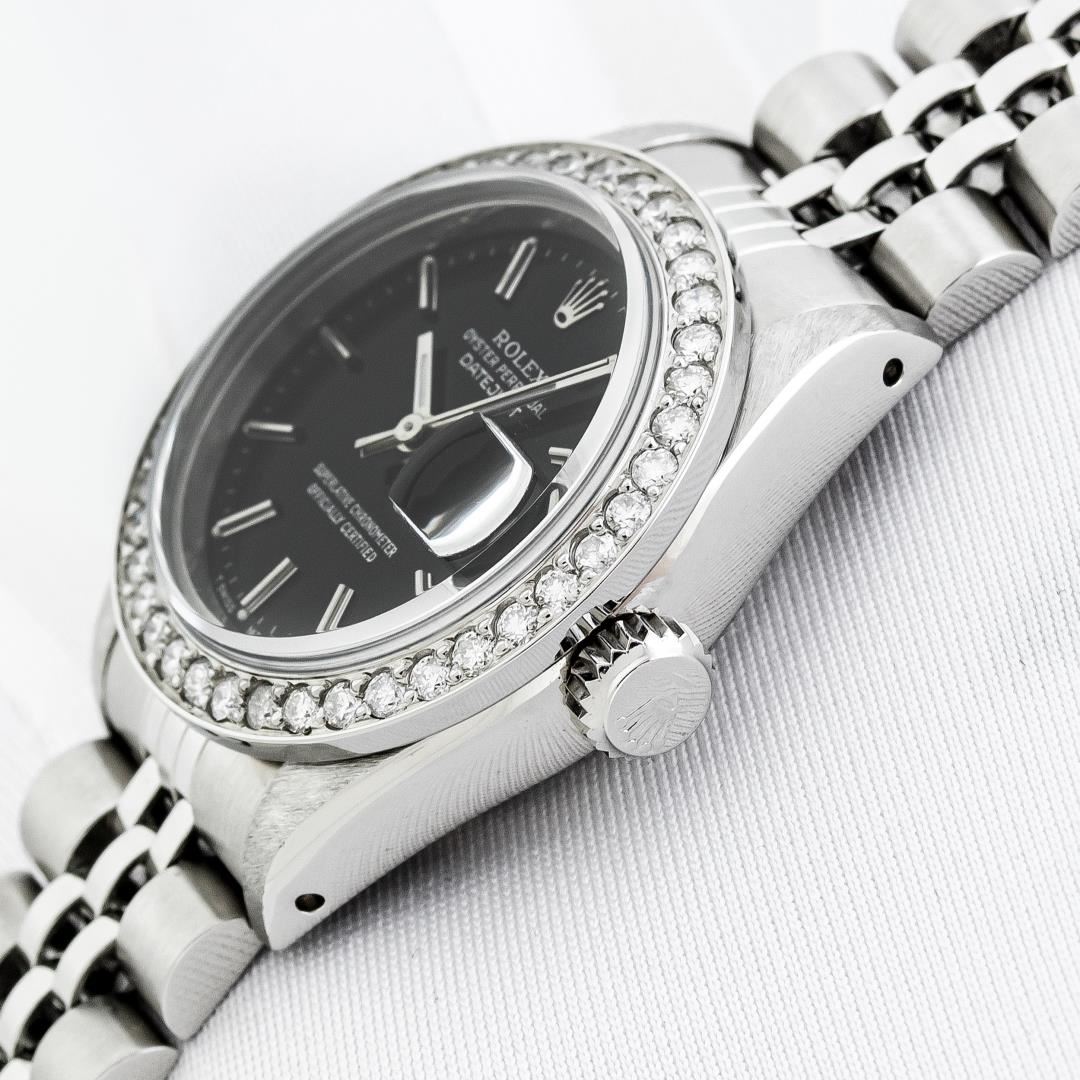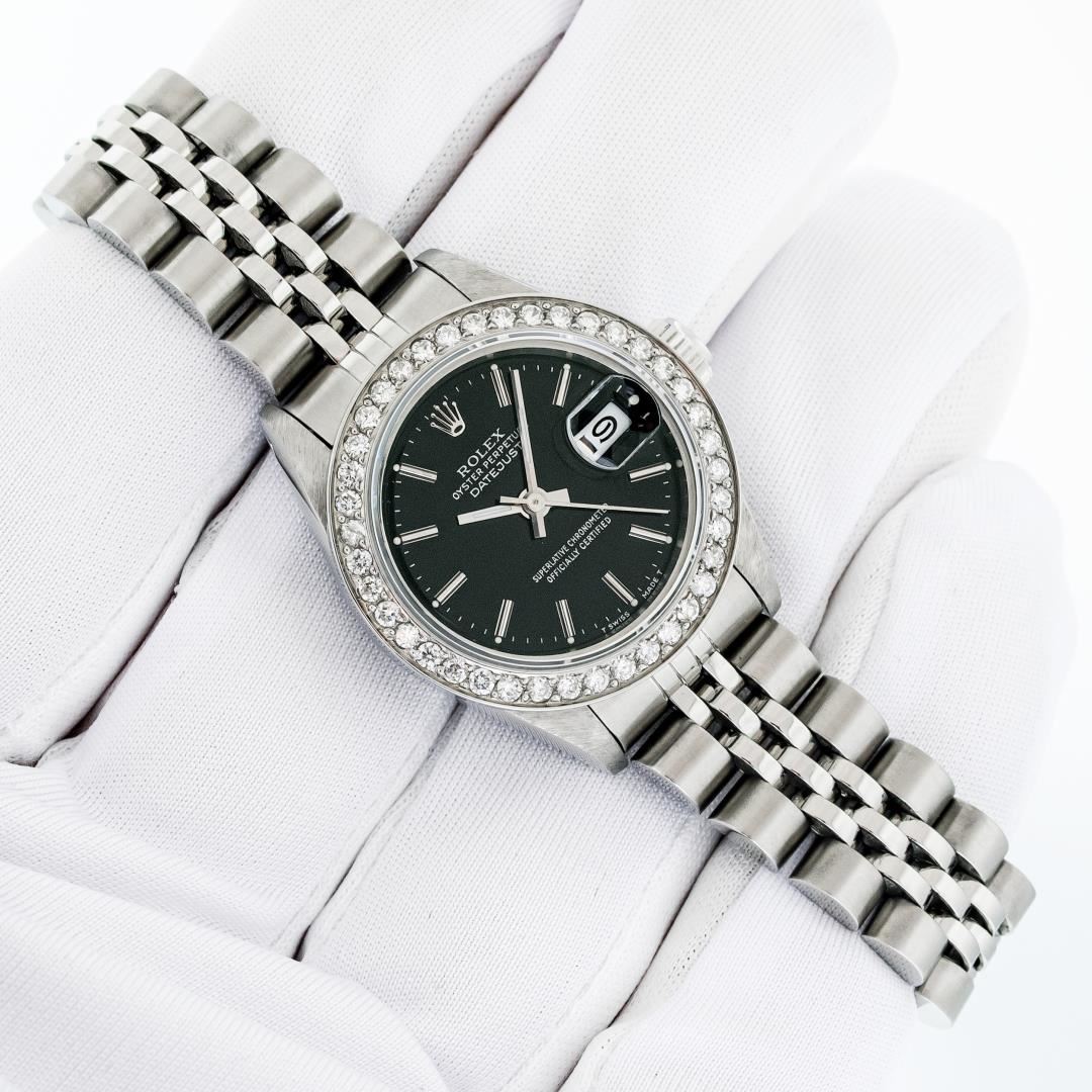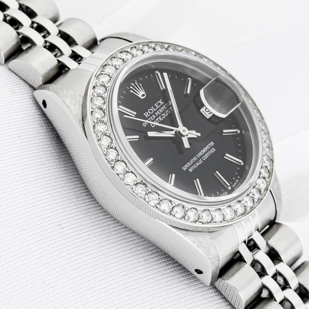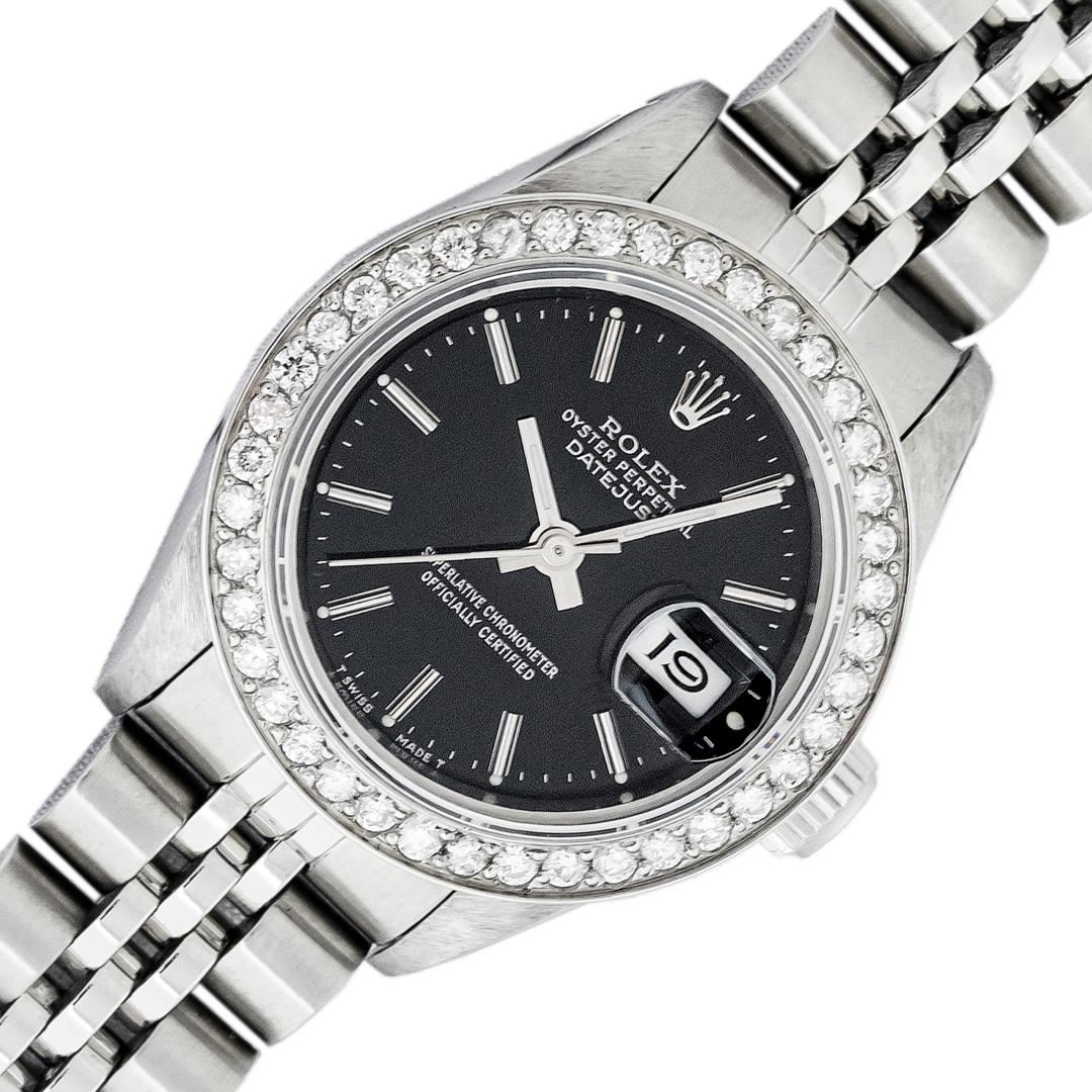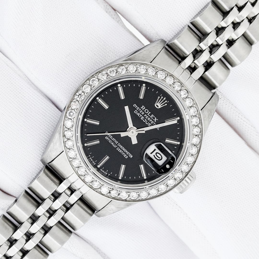 One Ladies Pre Owned Quickset Stainless Steel Rolex Datejust Polished Bright with Satin Finish Serviced & Electronically Tested, Rolex Stainless Steel Case: 26mm, Rolex Stainless Steel Crown, Custom Bezel: New Stainless Steel Diamond Pave Bezel, Diamond Count: 40 Diamonds, Color: G to H, Clarity: SI-VS, Custom Crystal: New Sapphire With Magnified Date Window. Custom Hands: New Luminescent Hands. Rolex Movement: Automatic Winding Movement. Rolex Dial: Black Index Dial With Dash Track And Lumi Dots. Date Window: 3 O'Clock Position Date Display, Model: Quickset Datejust. Condition: G-6 Extra Fine. Rolex Bracelet: Stainless Steel Jubilee Band With Rolex Crown On Buckle. Bright Polish & Satin Finish. Band Length: 6.0 Inch Length, Adjustable. Standard Clasp, With Rolex Logo. This Watch Has Been Serviced Time Tested And Is In Excellent Condition It Is Free Of All Scratches And Dents.