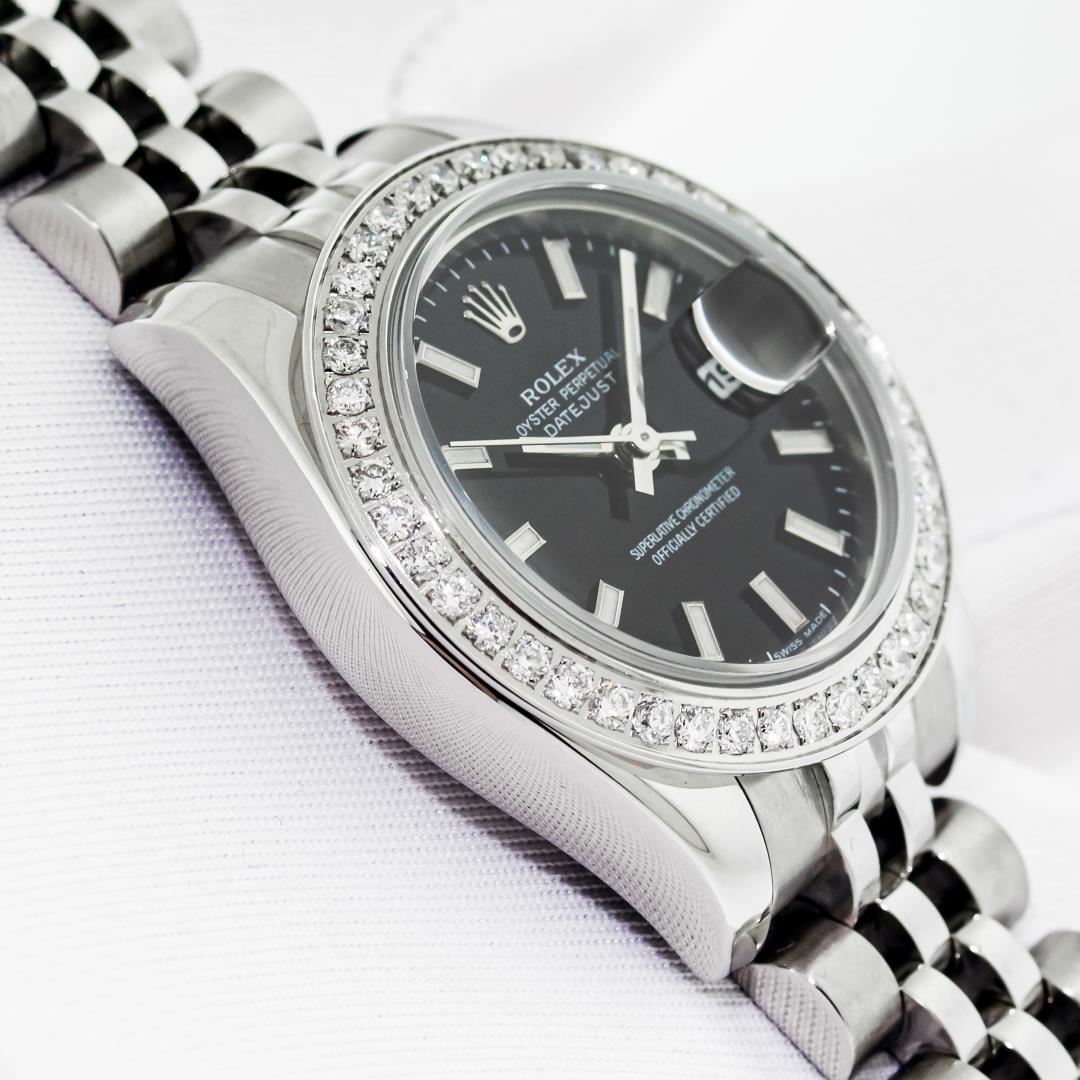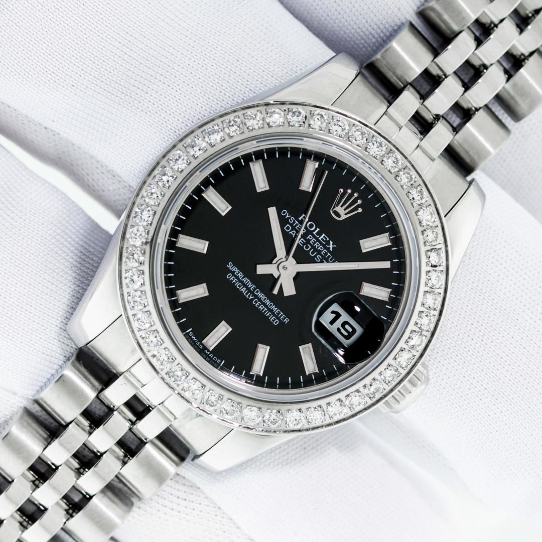 One Ladies Pre Owned Sapphire Quickset Stainless Steel Rolex Datejust Polished Bright with Satin Finish, Serviced & Electronically Tested, Rolex Stainless Steel Case: 26mm, Rolex Stainless Steel Crown, Custom Bezel: New Stainless Steel Beadset Diamond Bezel, Diamond Count: 40 Diamonds On Bezel. Crystal: Sapphire With Magnified Date Window. Hands: Luminescent Hands. Rolex Movement: Automatic Winding Movement 2235. Rolex Dial: Black Index With Dash Track. Date Window: 3 O'Clock Position Date Display, Model: Quickset Datejust. Condition: G-6 Extra Fine. Rolex Bracelet: Stainless Steel Jubilee Band. Bright Polish & Satin Finish. 6.0 Inch Length, Adjustable. Hidden Clap, With Rolex Logo. This Watch Has Been Serviced Time Tested And Is In Excellent Condition It Is Free Of All Scratches And Dents.