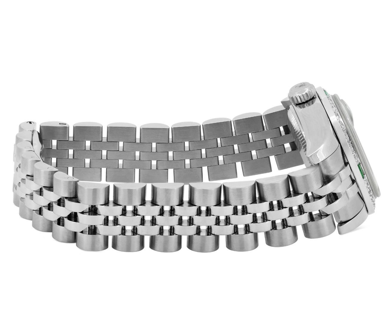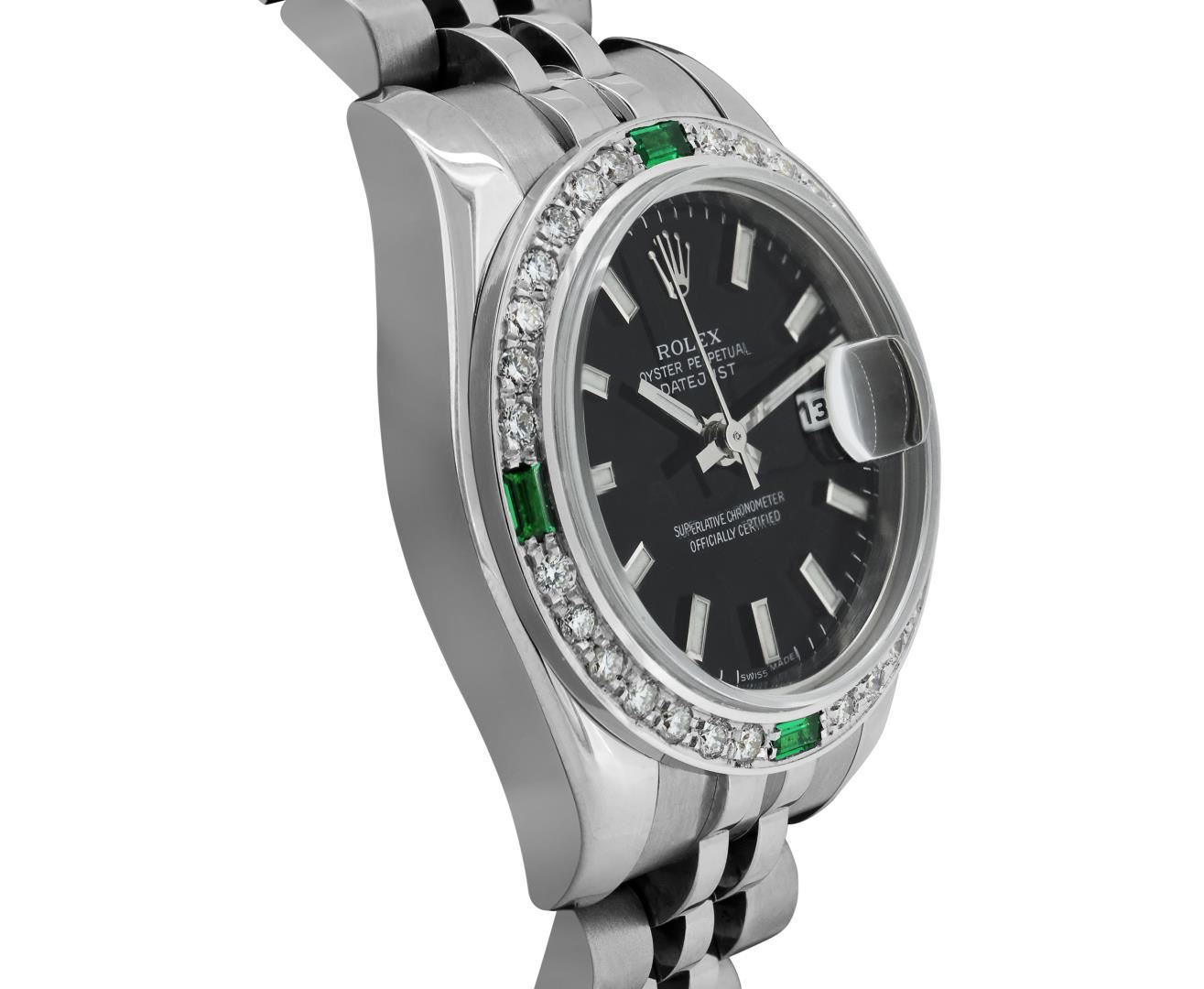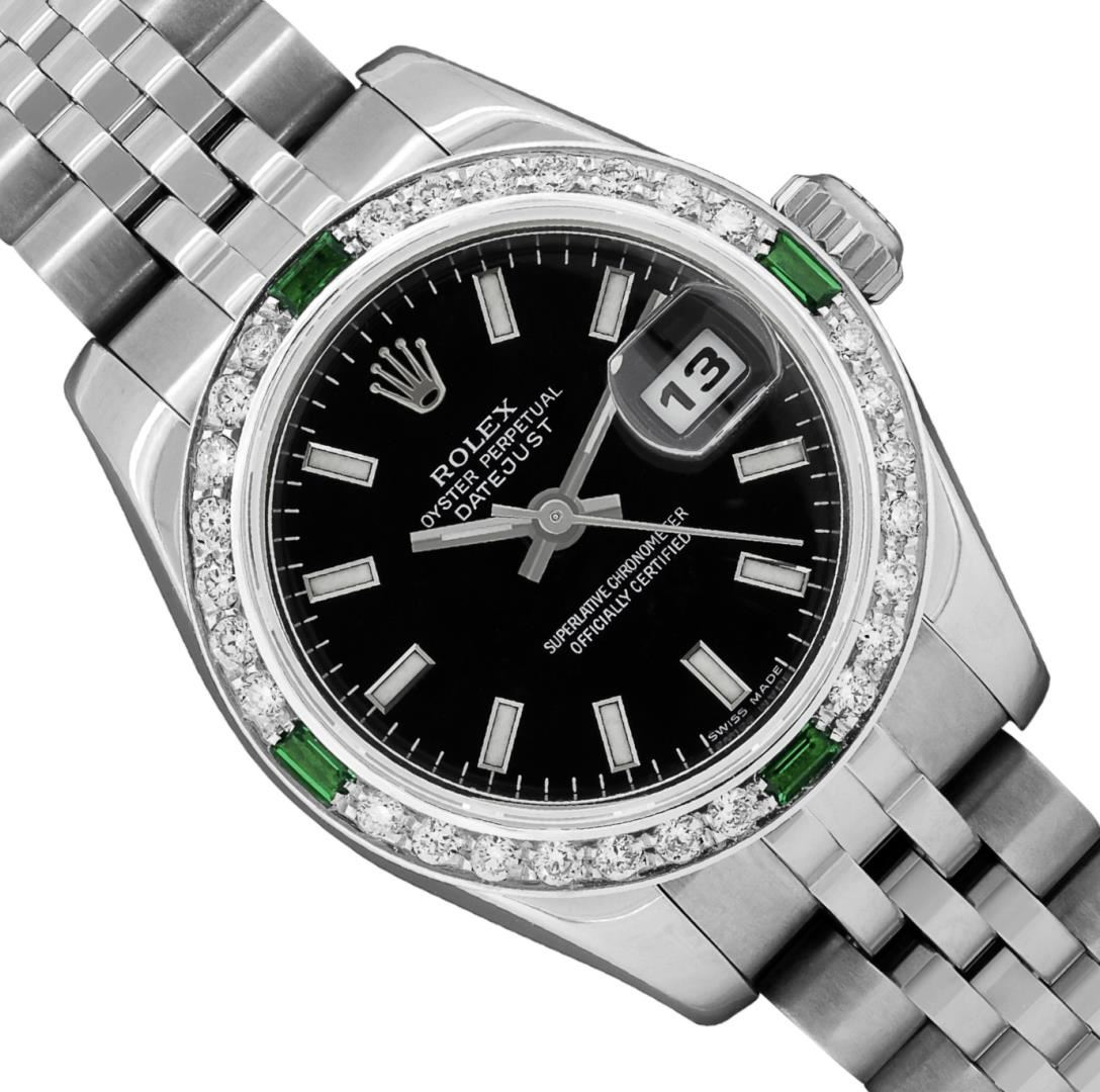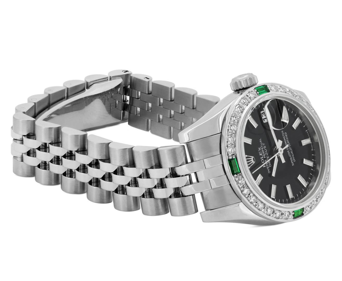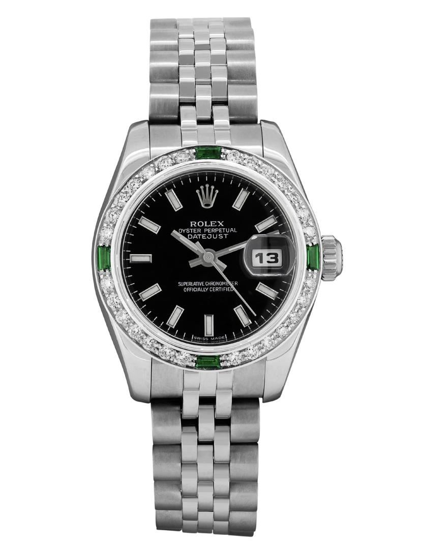 One Rolex Ladies Pre Owned Quickset Stainless Steel Date Wristwatch Polished Bright with Satin Finish, Serviced And Electronically Tested, Stainless Steel Case: 26mm, Stainless Steel Crown, Custom Bezel: New 18K White Gold Emerald Beadset Diamond Bezel, Diamond + Gem Count: 36 Diamonds + 4 Emeralds. Crystal: Sapphire With Magnified Date Window. Hands: Luminescent Hands. Rolex Movement: 2235 Automatic Winding Movement. Rolex Dial: Factory Black With Index Hour Markers And Dash Tracks. Date Window: 3 O'clock Position Date Display, Model: Sapphire Quickset Date. Condition: G-6 Extra Fine. Rolex Bracelet: Stainless Steel Jubilee Band. Bright Polish & Satin Finish. 6.0 Inch Length, Adjustable. Hidden Clasp, With Rolex Logo. This Watch Has Been Serviced And Time Tested. It Is In Excellent Condition, Free Of All Scratches And Dents. This Watch Comes With A Rolex Box.