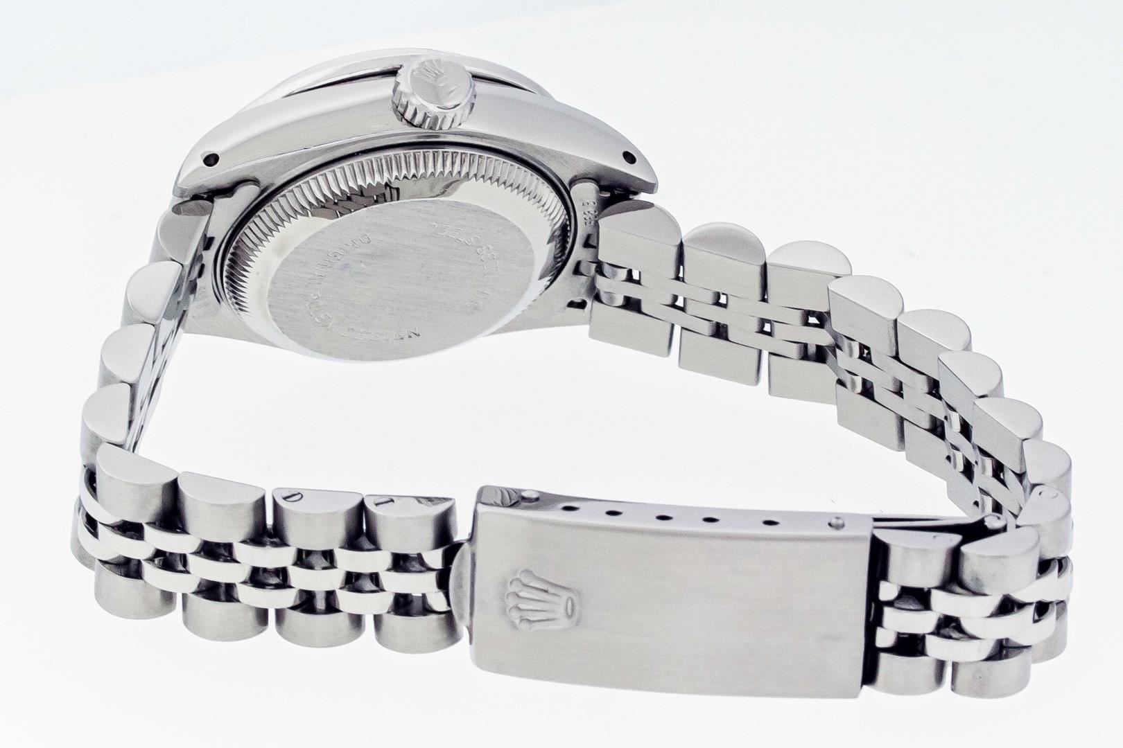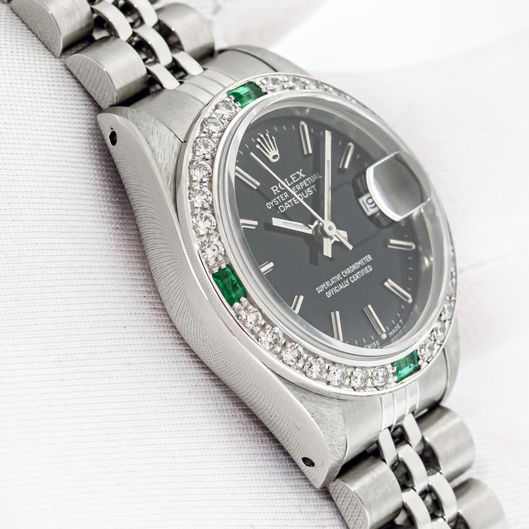 One Ladies Pre Owned Quickset Stainless Steel Rolex Datejust Polished Bright with Satin Finish Serviced & Electronically Tested, Rolex Stainless Steel Case: 26mm, Rolex Stainless Steel Crown, Custom Bezel: New 18K White Gold Beadset Diamond And Emerald Bezel, Diamond Count: 28 Diamonds + 4 Emeralds, Color: G to H, Clarity: SI-VS, Custom Crystal: New Sapphire With Magnified Date Window. Custom Hands: New Luminescent Hands. Rolex Movement: Automatic Winding Movement. Rolex Dial: Black Index Dial With Dash Track And Lumi Dots. Date Window: 3 O'Clock Position Date Display, Model: Quickset Datejust. Condition: G-6 Extra Fine. Rolex Bracelet: Stainless Steel Jubilee Band With Rolex Crown On Buckle. Bright Polish & Satin Finish. Band Length: 6.0 Inch Length, Adjustable. Standard Clasp, With Rolex Logo. This Watch Has Been Serviced Time Tested And Is In Excellent Condition It Is Free Of All Scratches And Dents.