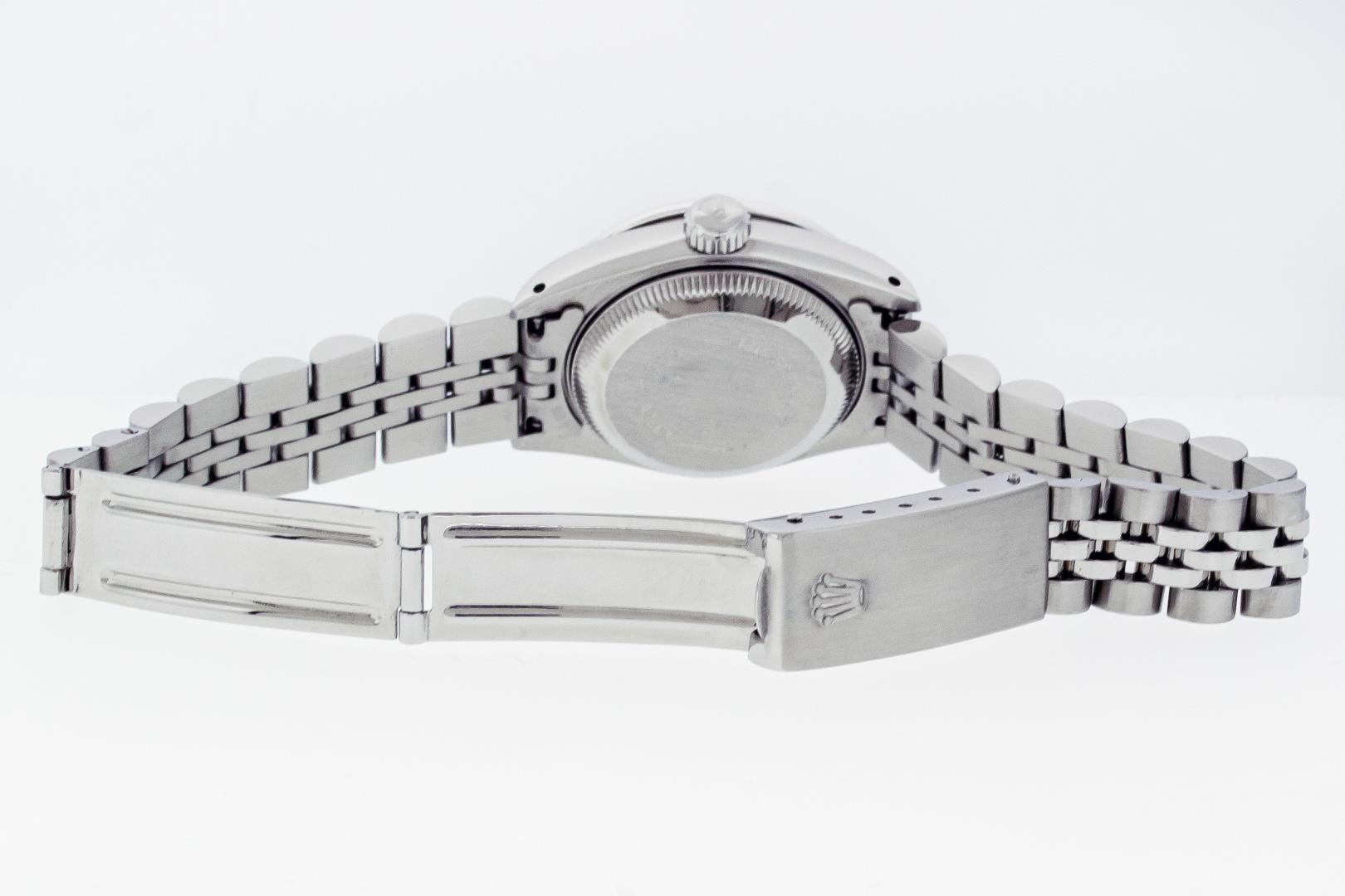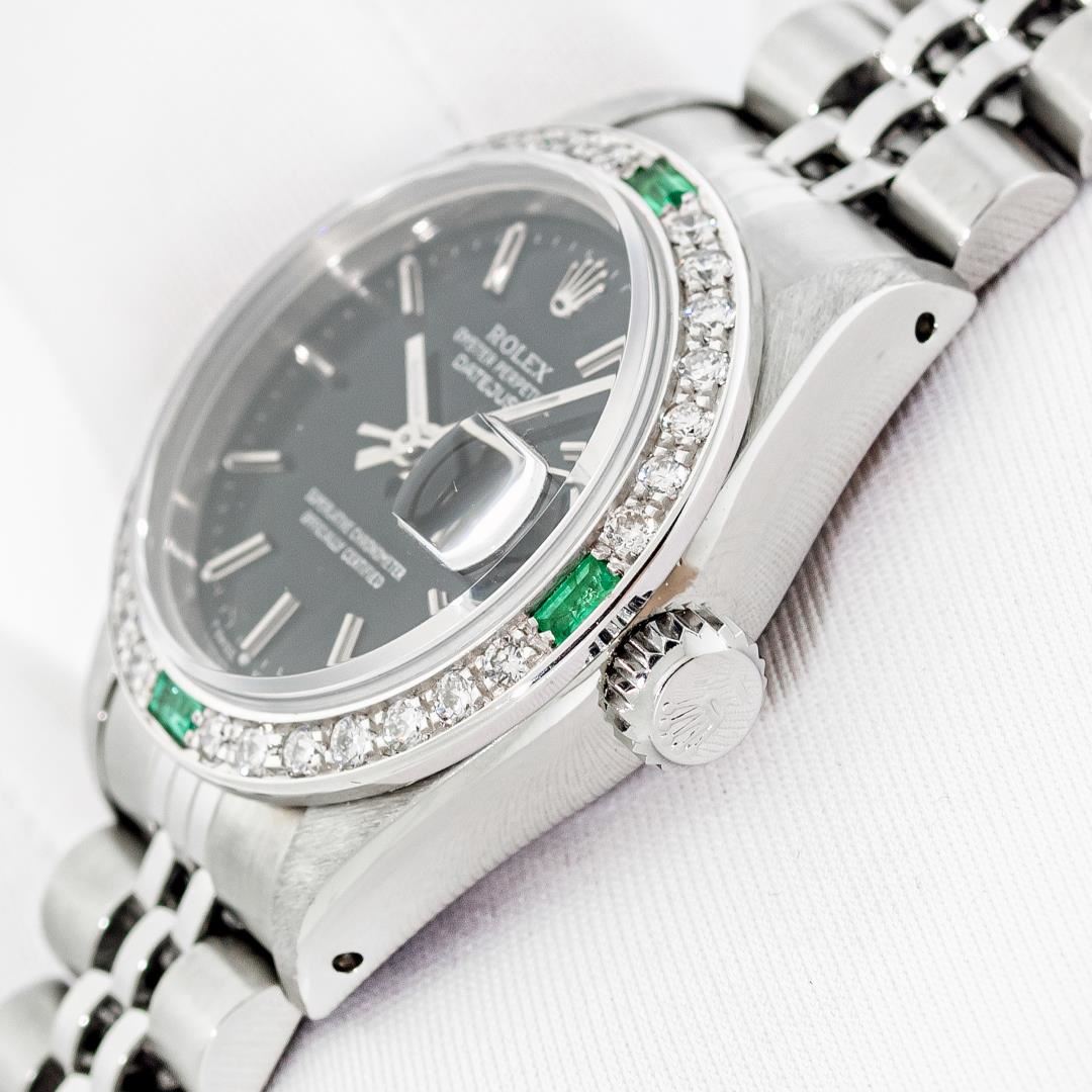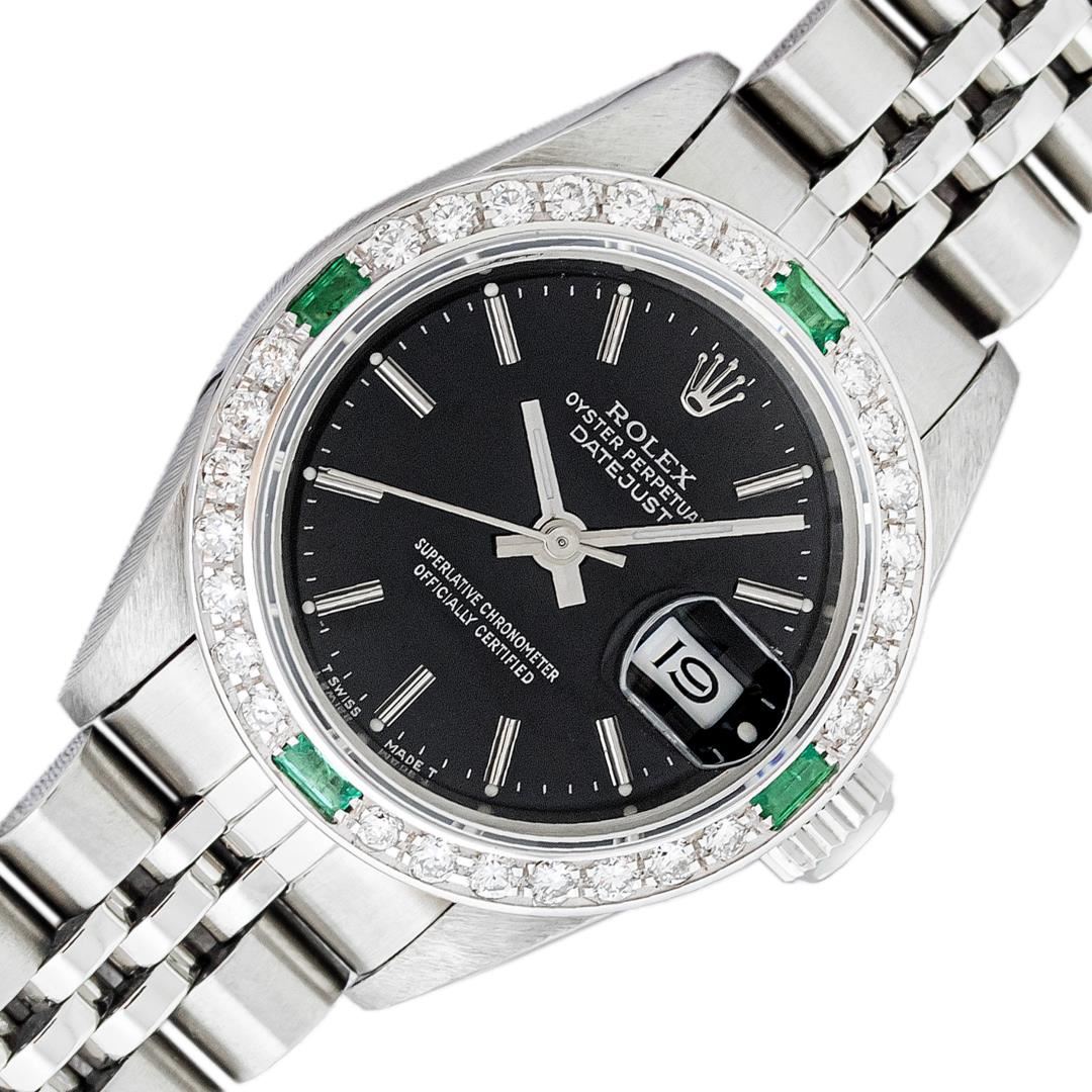 One Ladies Pre Owned Quickset Stainless Steel Rolex Datejust Polished Bright with Satin Finish Serviced & Electronically Tested, Rolex Stainless Steel Case: 26mm, Rolex Stainless Steel Crown, Custom Bezel: New 18K White Gold Beadset Diamond And Emerald Bezel, Diamond Count: 28 Diamonds + 4 Emeralds, Color: G to H, Clarity: SI-VS, Custom Crystal: New Sapphire With Magnified Date Window. Custom Hands: New Luminescent Hands. Rolex Movement: Automatic Winding Movement. Rolex Dial: Black Index Dial With Dash Track And Lumi Dots. Date Window: 3 O'Clock Position Date Display, Model: Quickset Datejust. Condition: G-6 Extra Fine. Rolex Bracelet: Stainless Steel Jubilee Band With Rolex Crown On Buckle. Bright Polish & Satin Finish. Band Length: 6.0 Inch Length, Adjustable. Standard Clasp, With Rolex Logo. This Watch Has Been Serviced Time Tested And Is In Excellent Condition It Is Free Of All Scratches And Dents.