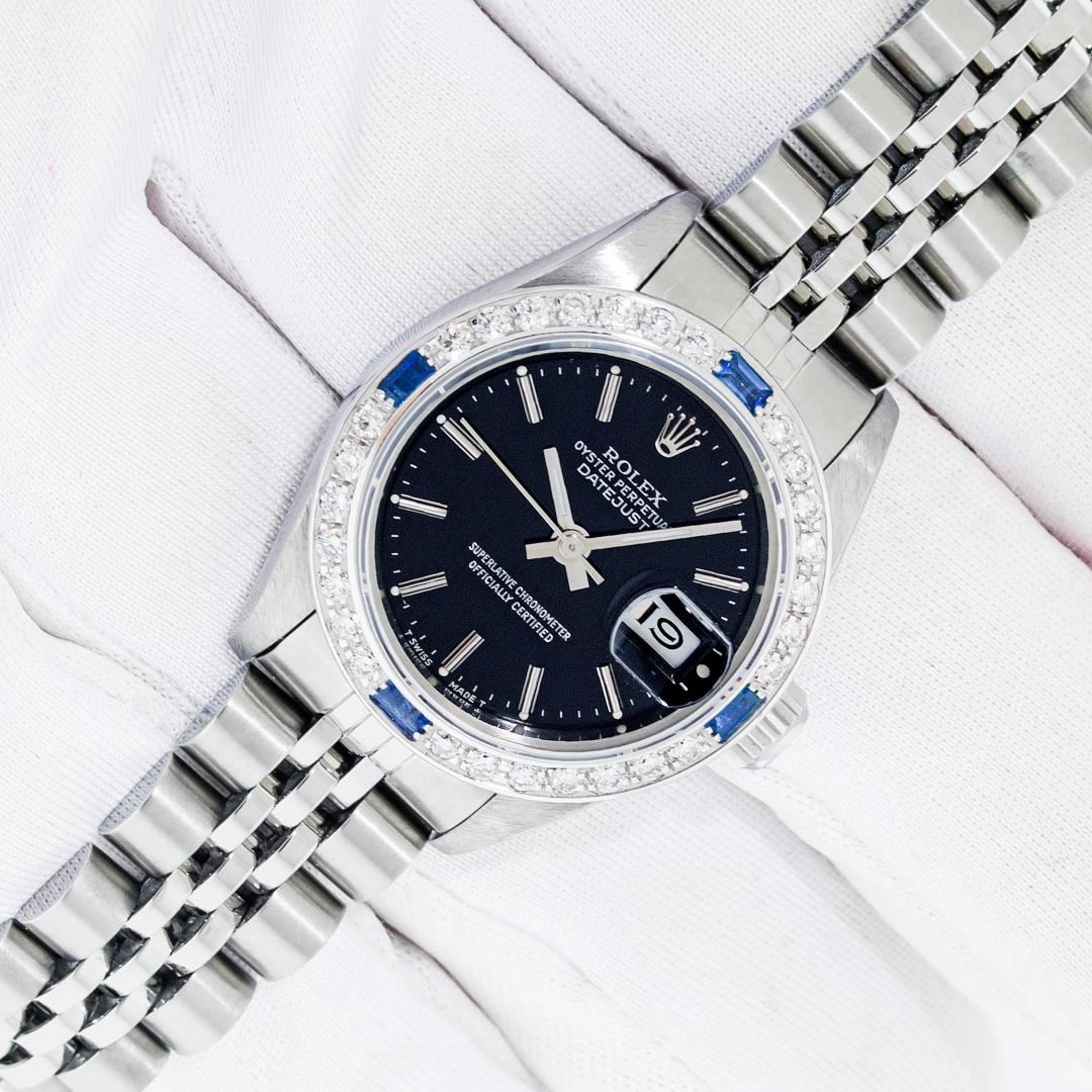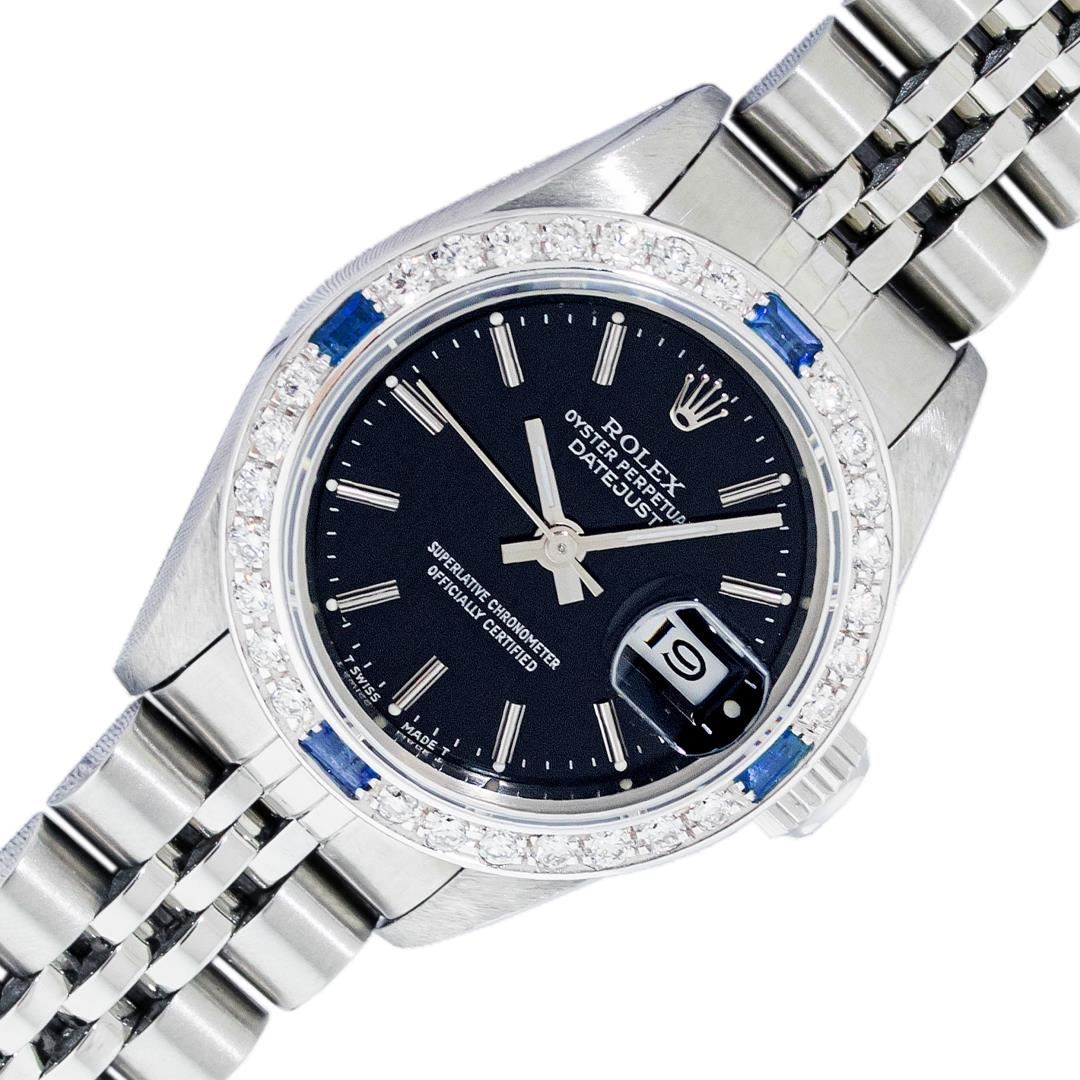 One Ladies Pre Owned Quickset Stainless Steel Rolex Datejust Polished Bright with Satin Finish Serviced & Electronically Tested, Rolex Stainless Steel Case: 26mm, Rolex Stainless Steel Crown, Custom Bezel: New 18K White Gold Beadset Diamond And Sapphire Bezel, Diamond Count: 28 Diamonds + 4 Sapphires, Color: G to H, Clarity: SI-VS, Custom Crystal: New Sapphire With Magnified Date Window. Custom Hands: New Luminescent Hands. Rolex Movement: Automatic Winding Movement. Rolex Dial: Black Index Dial With Dash Track And Lumi Dots. Date Window: 3 O'Clock Position Date Display, Model: Quickset Datejust. Condition: G-6 Extra Fine. Rolex Bracelet: Stainless Steel Jubilee Band With Rolex Crown On Buckle. Bright Polish & Satin Finish. Band Length: 6.0 Inch Length, Adjustable. Standard Clasp, With Rolex Logo. This Watch Has Been Serviced Time Tested And Is In Excellent Condition It Is Free Of All Scratches And Dents.