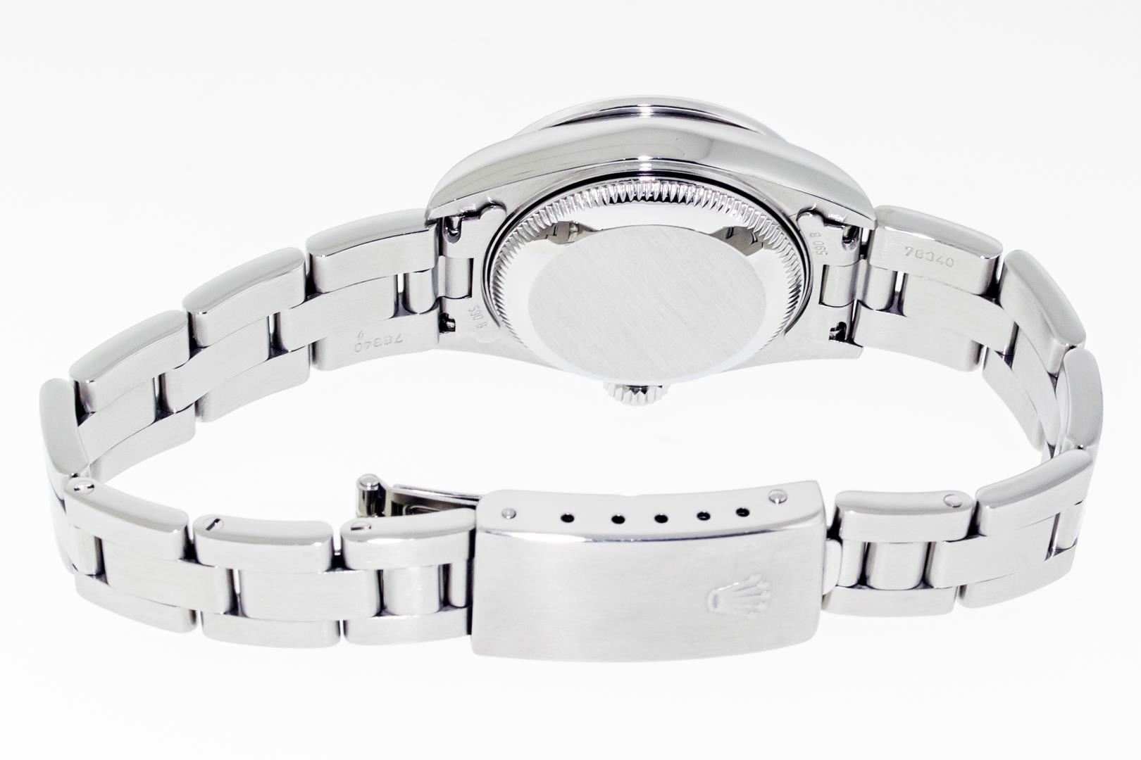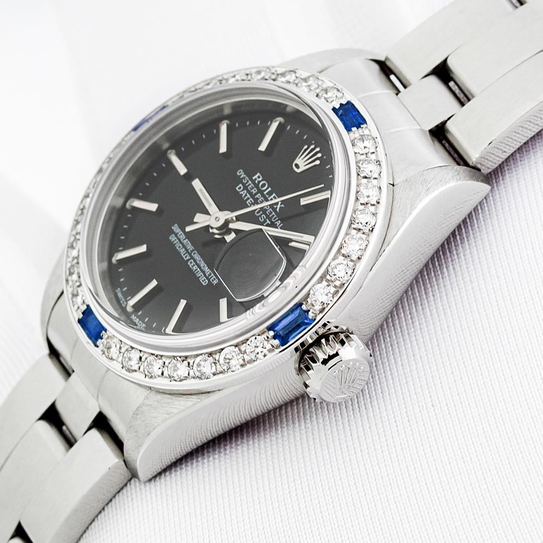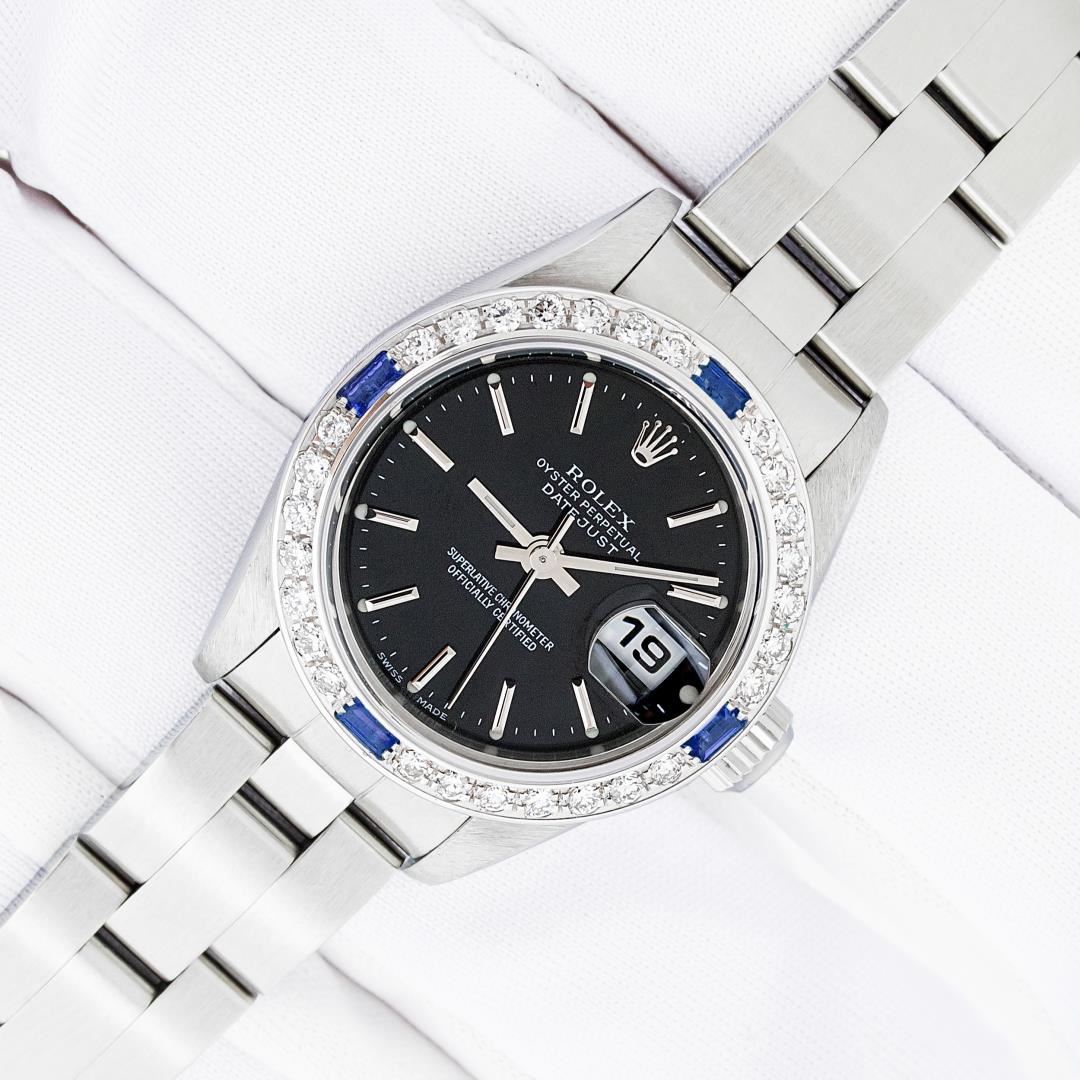 One Ladies Pre Owned Quickset Stainless Steel Rolex Datejust Polished Bright with Satin Finish, Serviced & Electronically Tested, Stainless Steel Case: 26mm, Rolex Stainless Steel Crown, Custom Bezel: New 18K White Gold Sapphire Bead Set Diamond Bezel, Diamond + Gem Count: 28 Diamonds + 4 Sapphires. Custom Crystal: New Sapphire With Magnified Date Window. Custom Hands: New Luminescent Hands. Rolex Movement: Automatic Winding Movement. Rolex Dial: Black With Index Hour Markers & Lumi Dots. Date Window: 3 O'Clock Position Date Display, Model: Datejust. Condition: G-6 Extra Fine. Rolex Bracelet: Stainless Steel Oyster Band. Bright Polish & Satin Finish. 6.0 Inch Length, Adjustable. Standard Clasp, With Rolex Logo. This Watch Has Been Serviced Time Tested And Is In Excellent Condition It Is Free Of All Scratches And Dents.