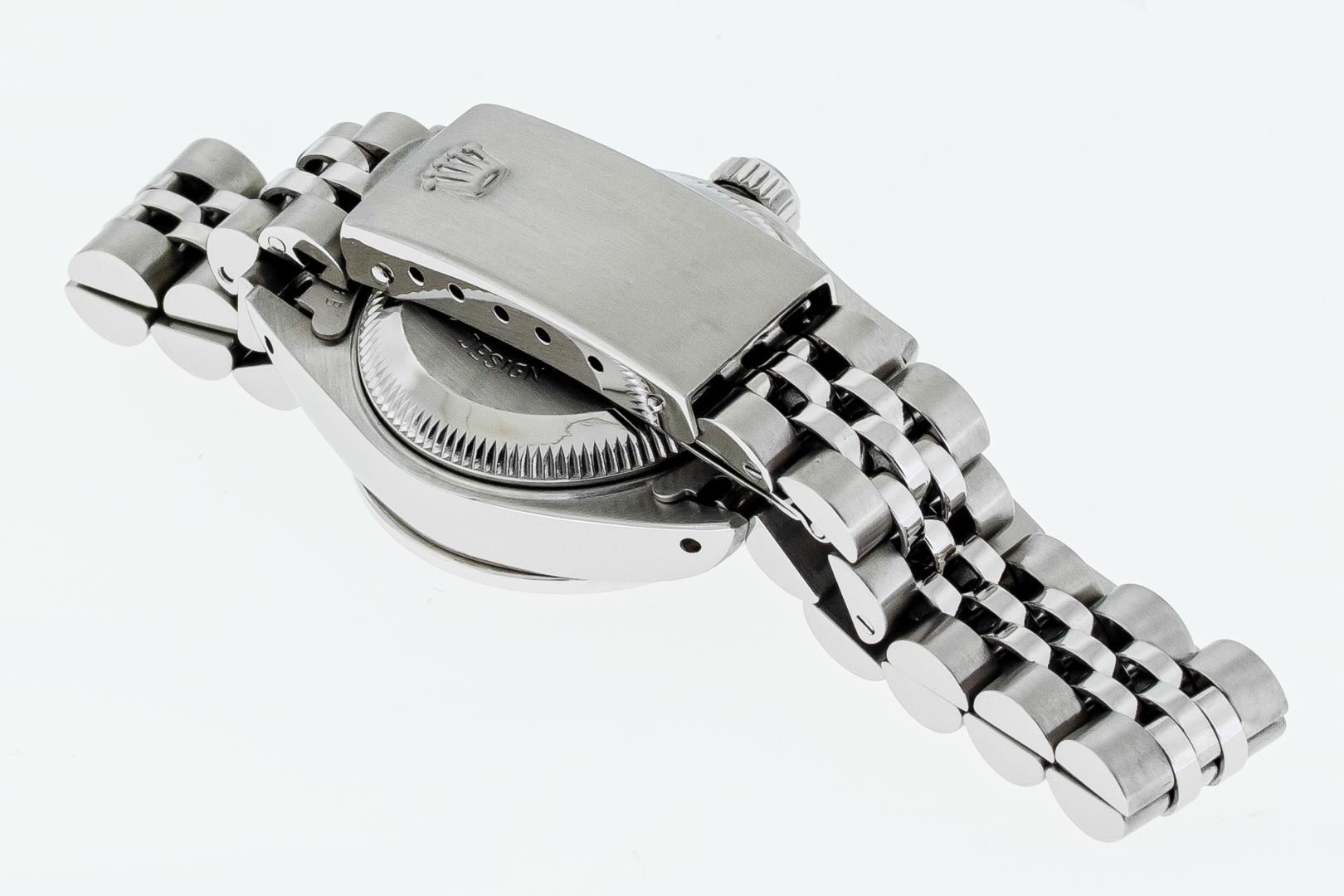 One Ladies Pre Owned Quickset Stainless Steel Rolex Datejust Polished Bright with Satin Finish Serviced & Electronically Tested, Rolex Stainless Steel Case: 26mm, Rolex Stainless Steel Crown, Custom Bezel: New 18K White Gold Beadset Diamond And Sapphire Bezel, Diamond Count: 28 Diamonds + 4 Sapphires, Color: G to H, Clarity: SI-VS, Custom Crystal: New Sapphire With Magnified Date Window. Custom Hands: New Luminescent Hands. Rolex Movement: Automatic Winding Movement. Rolex Dial: Black Index Dial With Dash Track And Lumi Dots. Date Window: 3 O'Clock Position Date Display, Model: Quickset Datejust. Condition: G-6 Extra Fine. Rolex Bracelet: Stainless Steel Jubilee Band With Rolex Crown On Buckle. Bright Polish & Satin Finish. Band Length: 6.0 Inch Length, Adjustable. Standard Clasp, With Rolex Logo. This Watch Has Been Serviced Time Tested And Is In Excellent Condition It Is Free Of All Scratches And Dents.