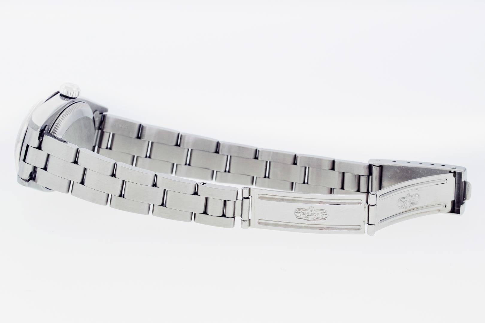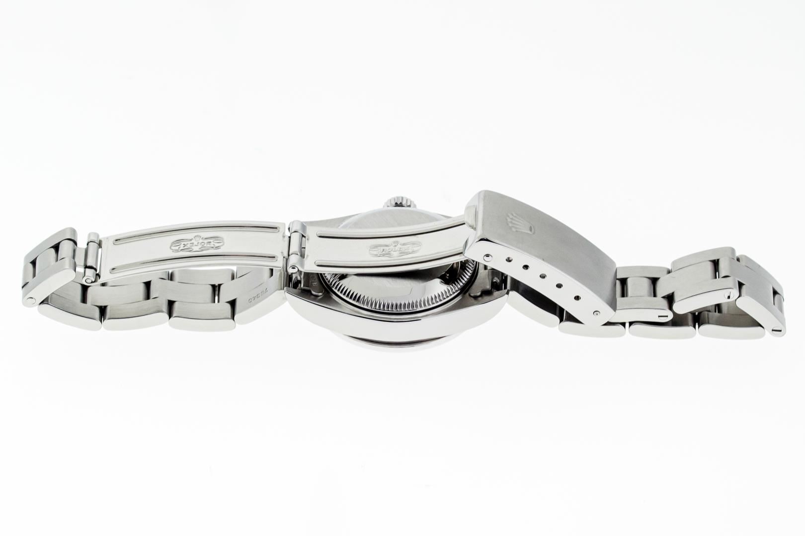 One Ladies Pre Owned Quickset Stainless Steel Rolex Datejust Polished Bright with Satin Finish, Serviced & Electronically Tested, Stainless Steel Case: 26mm, Rolex Stainless Steel Crown, Custom Bezel: New 18K White Gold Sapphire Bead Set Diamond Bezel, Diamond + Gem Count: 28 Diamonds + 4 Sapphires. Custom Crystal: New Sapphire With Magnified Date Window. Custom Hands: New Luminescent Hands. Rolex Movement: Automatic Winding Movement. Rolex Dial: Black With Index Hour Markers & Lumi Dots. Date Window: 3 O'Clock Position Date Display, Model: Datejust. Condition: G-6 Extra Fine. Rolex Bracelet: Stainless Steel Oyster Band. Bright Polish & Satin Finish. 6.0 Inch Length, Adjustable. Standard Clasp, With Rolex Logo. This Watch Has Been Serviced Time Tested And Is In Excellent Condition It Is Free Of All Scratches And Dents.