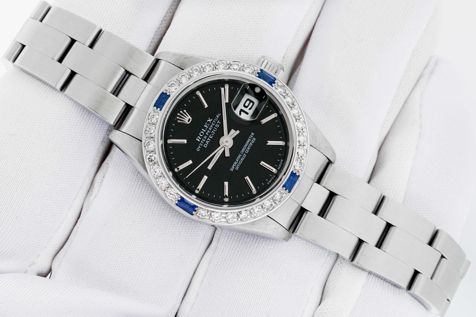 One Ladies Pre Owned Quickset Stainless Steel Rolex Datejust Polished Bright with Satin Finish, Serviced & Electronically Tested, Stainless Steel Case: 26mm, Rolex Stainless Steel Crown, Custom Bezel: New 18K White Gold Sapphire Bead Set Diamond Bezel, Diamond + Gem Count: 28 Diamonds + 4 Sapphires. Custom Crystal: New Sapphire With Magnified Date Window. Custom Hands: New Luminescent Hands. Rolex Movement: Automatic Winding Movement. Rolex Dial: Black With Index Hour Markers & Lumi Dots. Date Window: 3 O'Clock Position Date Display, Model: Datejust. Condition: G-6 Extra Fine. Rolex Bracelet: Stainless Steel Oyster Band. Bright Polish & Satin Finish. 6.0 Inch Length, Adjustable. Standard Clasp, With Rolex Logo. This Watch Has Been Serviced Time Tested And Is In Excellent Condition It Is Free Of All Scratches And Dents.