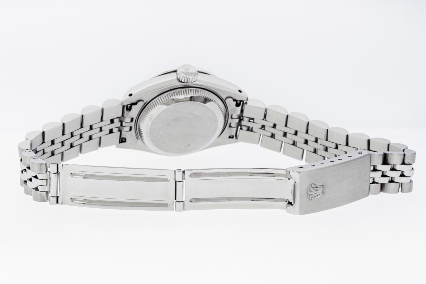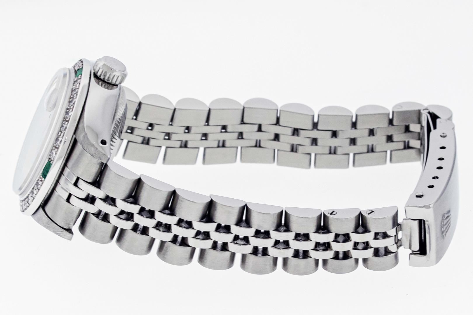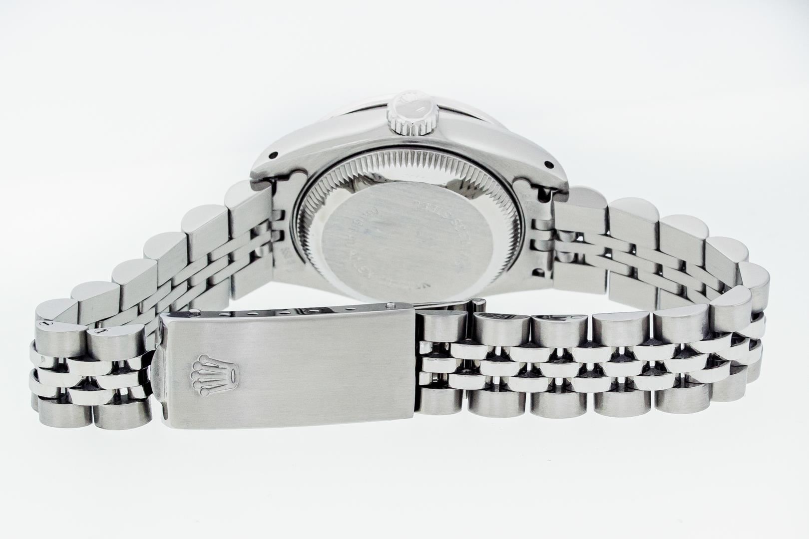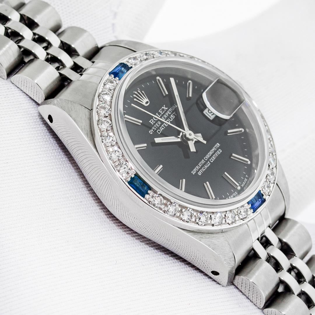 One Ladies Pre Owned Quickset Stainless Steel Rolex Datejust Polished Bright with Satin Finish Serviced & Electronically Tested, Rolex Stainless Steel Case: 26mm, Rolex Stainless Steel Crown, Custom Bezel: New 18K White Gold Beadset Diamond And Sapphire Bezel, Diamond Count: 28 Diamonds + 4 Sapphires, Color: G to H, Clarity: SI-VS, Custom Crystal: New Sapphire With Magnified Date Window. Custom Hands: New Luminescent Hands. Rolex Movement: Automatic Winding Movement. Rolex Dial: Black Index Dial With Dash Track And Lumi Dots. Date Window: 3 O'Clock Position Date Display, Model: Quickset Datejust. Condition: G-6 Extra Fine. Rolex Bracelet: Stainless Steel Jubilee Band With Rolex Crown On Buckle. Bright Polish & Satin Finish. Band Length: 6.0 Inch Length, Adjustable. Standard Clasp, With Rolex Logo. This Watch Has Been Serviced Time Tested And Is In Excellent Condition It Is Free Of All Scratches And Dents.