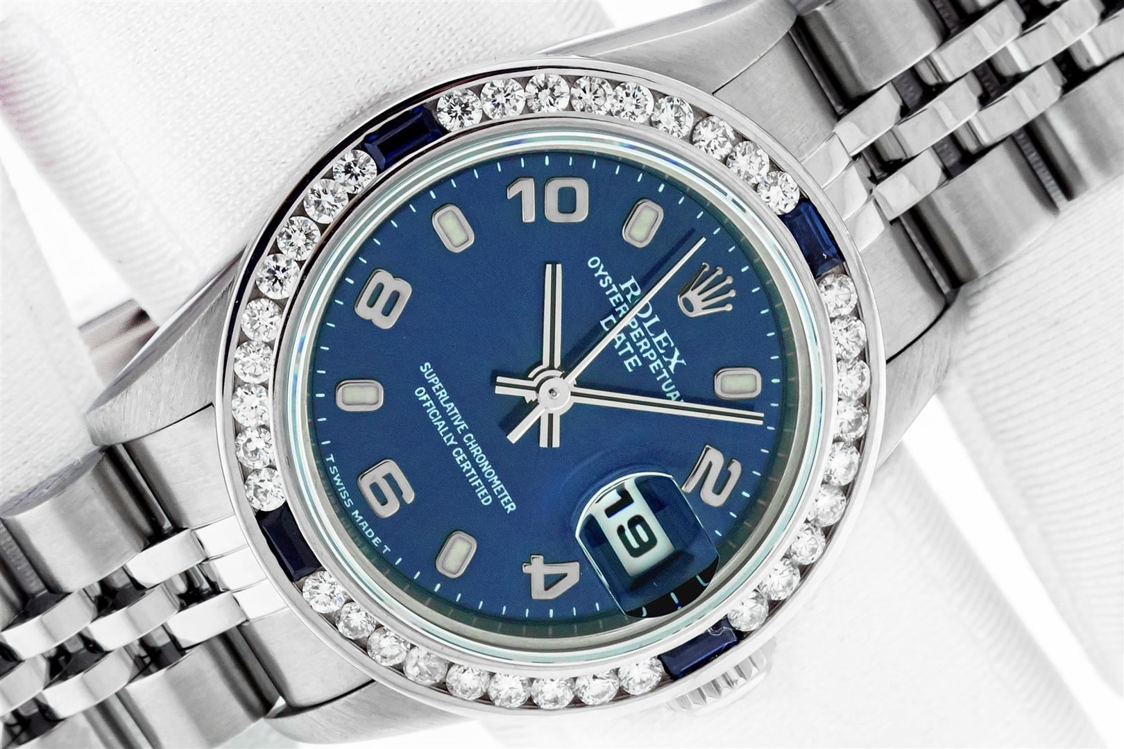 One Quickset Pre Owned Ladies Stainless Steel Rolex Oyster Perpetual Datejust Polished Bright with Satin Finish, Serviced & Electronically Tested, Rolex Stainless Steel Case: 26mm, Rolex Stainless Steel Crown, Custom Bezel: New 18K White Gold Diamond + Sapphire Channel Set Diamond Bezel, Stone Count: 36 Diamonds + 4 Sapphires, Total Weight 1.0 Carat, Clarity: SI-VS, Color: G to H. Custom Crystal: New Scratch Resistant Synthetic Sapphire Cyclops Lens. Custom Hands: New Luminescent Hands. Rolex Movement: Automatic Winding Movement. Rolex Dial: Blue Arabic Dial, 10 Diamonds in Dial G To H In Color, Clarity: VS. Date Window: 3 O'Clock Position Date Display, Model: Quickset 2230 Datejust. Condition: G-6 Extra Fine. Rolex Bracelet: Stainless Steel Jubilee Band. Bright Polish & Satin Finish. 6.0 Inch Length, Adjustable. Standard Clasp, With Rolex Logo. This Watch Has Been Serviced Time Tested And Is In Excellent Condition It Is Free Of All Scratches And Dents. This Watch Comes With A Rolex Box And Booklets.