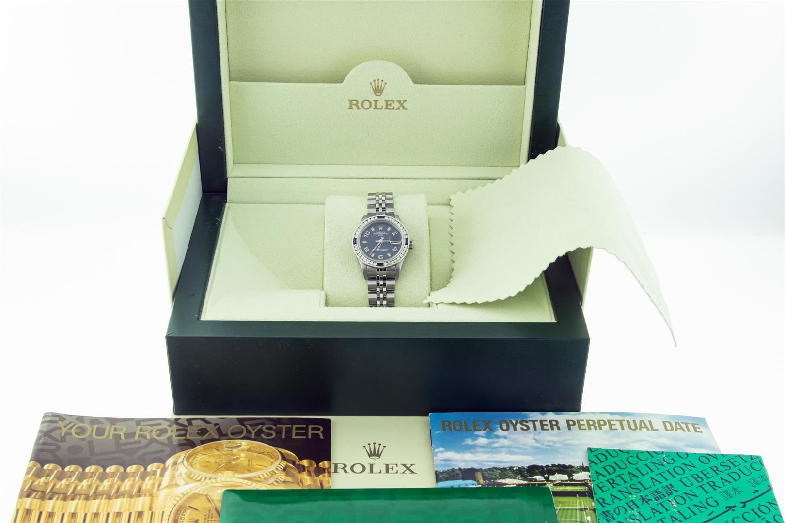 One Quickset Pre Owned Ladies Stainless Steel Rolex Oyster Perpetual Datejust Polished Bright with Satin Finish, Serviced & Electronically Tested, Rolex Stainless Steel Case: 26mm, Rolex Stainless Steel Crown, Custom Bezel: New 18K White Gold Diamond + Sapphire Channel Set Diamond Bezel, Stone Count: 36 Diamonds + 4 Sapphires, Total Weight 1.0 Carat, Clarity: SI-VS, Color: G to H. Custom Crystal: New Scratch Resistant Synthetic Sapphire Cyclops Lens. Custom Hands: New Luminescent Hands. Rolex Movement: Automatic Winding Movement. Rolex Dial: Blue Arabic Dial, 10 Diamonds in Dial G To H In Color, Clarity: VS. Date Window: 3 O'Clock Position Date Display, Model: Quickset 2230 Datejust. Condition: G-6 Extra Fine. Rolex Bracelet: Stainless Steel Jubilee Band. Bright Polish & Satin Finish. 6.0 Inch Length, Adjustable. Standard Clasp, With Rolex Logo. This Watch Has Been Serviced Time Tested And Is In Excellent Condition It Is Free Of All Scratches And Dents. This Watch Comes With A Rolex Box And Booklets.