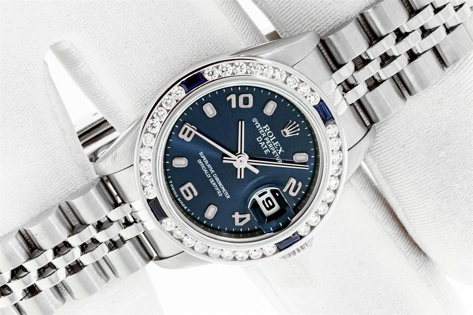 One Quickset Pre Owned Ladies Stainless Steel Rolex Oyster Perpetual Datejust Polished Bright with Satin Finish, Serviced & Electronically Tested, Rolex Stainless Steel Case: 26mm, Rolex Stainless Steel Crown, Custom Bezel: New 18K White Gold Diamond + Sapphire Channel Set Diamond Bezel, Stone Count: 36 Diamonds + 4 Sapphires, Total Weight 1.0 Carat, Clarity: SI-VS, Color: G to H. Custom Crystal: New Scratch Resistant Synthetic Sapphire Cyclops Lens. Custom Hands: New Luminescent Hands. Rolex Movement: Automatic Winding Movement. Rolex Dial: Blue Arabic Dial, 10 Diamonds in Dial G To H In Color, Clarity: VS. Date Window: 3 O'Clock Position Date Display, Model: Quickset 2230 Datejust. Condition: G-6 Extra Fine. Rolex Bracelet: Stainless Steel Jubilee Band. Bright Polish & Satin Finish. 6.0 Inch Length, Adjustable. Standard Clasp, With Rolex Logo. This Watch Has Been Serviced Time Tested And Is In Excellent Condition It Is Free Of All Scratches And Dents. This Watch Comes With A Rolex Box And Booklets.