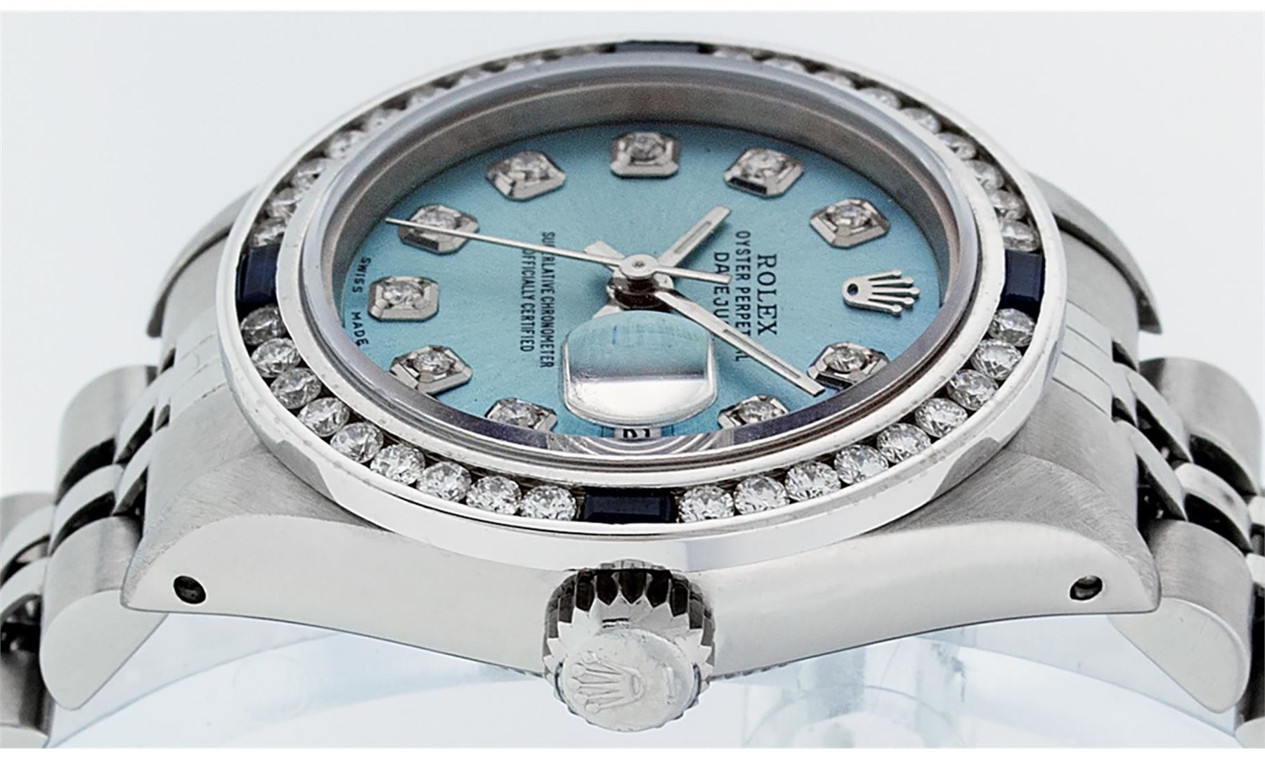 One Ladies Stainless Steel Rolex Datejust Polished Bright with Satin Finish, Serviced & Electronically Tested, Stainless Steel Case: 26mm, Stainless Steel Crown, Custom Bezel: New 18K White Gold Sapphire Channel Set Diamond Bezel, Diamond + Gem Count: 36 Diamonds + 4 Sapphires Total Weight 1.00 Carat, Clarity: SI-VS, Color: G to H. Custom Crystal: New Synthetic Sapphire Cyclops Lens. Custom Hands: New Luminescent Hands. Movement: Automatic Winding Movement Caliber 2030. Custom Dial: Refinished Ice Blue With Diamond Hour Markers. Date Window: 3 O'Clock Position Date Display, Model: Datejust. Condition: G-6 Extra Fine. Bracelet: Stainless Steel Jubilee. Bright Polish & Satin Finish. 6.0 Inch Length, Adjustable. Standard Clasp, With Rolex Logo. This Watch Has Been Serviced Time Tested And Is In Excellent Condition It Is Free Of All Scratches And Dents.