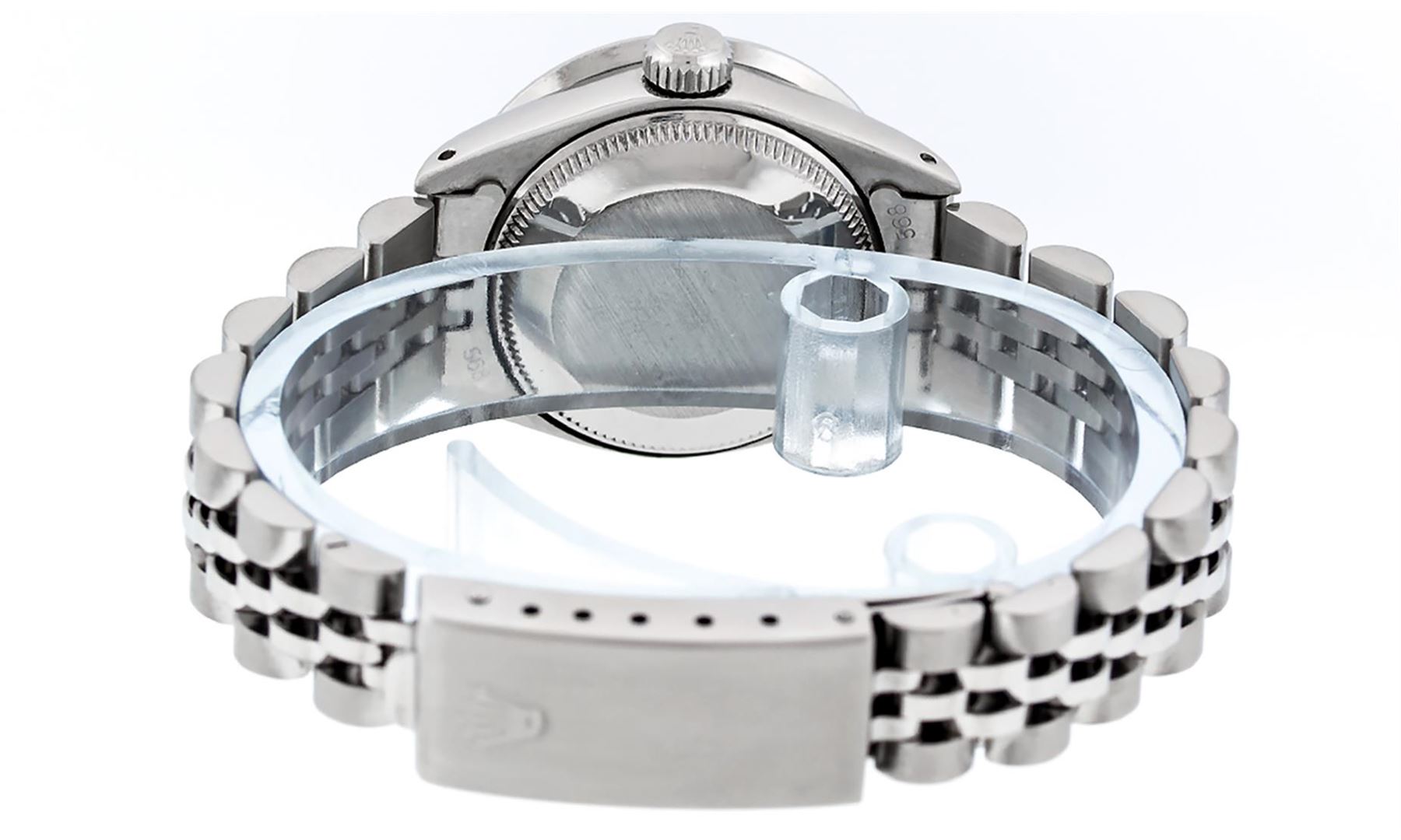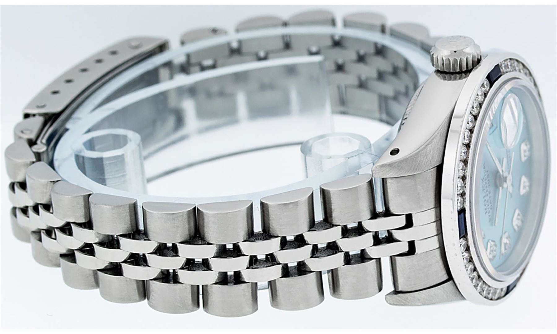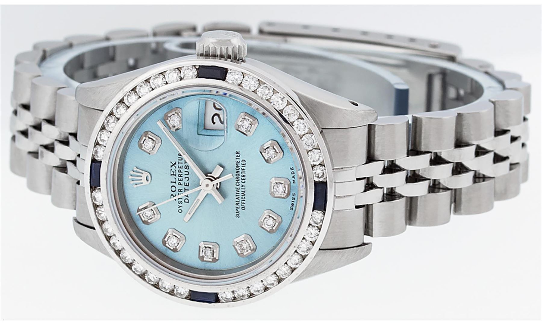 One Ladies Stainless Steel Rolex Datejust Polished Bright with Satin Finish, Serviced & Electronically Tested, Stainless Steel Case: 26mm, Stainless Steel Crown, Custom Bezel: New 18K White Gold Sapphire Channel Set Diamond Bezel, Diamond + Gem Count: 36 Diamonds + 4 Sapphires Total Weight 1.00 Carat, Clarity: SI-VS, Color: G to H. Custom Crystal: New Scratch Resistant Synthetic Sapphire Cyclops Lens. Custom Hands: New Luminescent Hands. Movement: Automatic Winding Movement. Custom Dial: Refinished Ice Blue With Diamond Hour Markers. Date Window: 3 O'clock Position Date Display, Model: Datejust. Condition: G-6 Extra Fine. Bracelet: Stainless Steel Jubilee. Bright Polish & Satin Finish. 6.0 Inch Length, Adjustable. Standard Clasp, With Rolex Logo. This Watch Has Been Serviced Time Tested And Is In Excellent Condition It Is Free Of All Scratches And Dents.