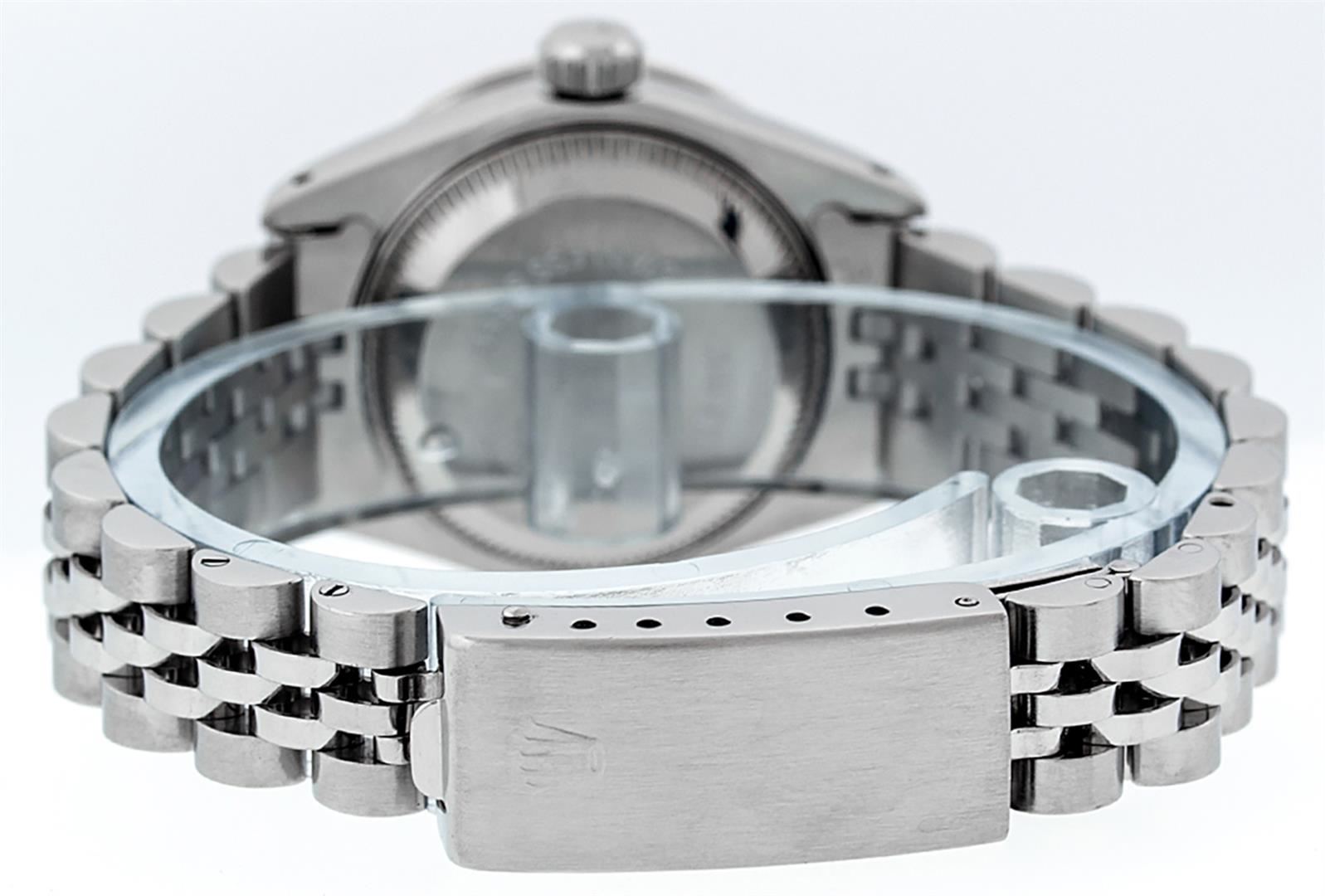 One Ladies Stainless Steel Rolex Datejust Polished Bright with Satin Finish, Serviced & Electronically Tested, Stainless Steel Case: 26mm, Stainless Steel Crown, Diamond Lugs: 24 Diamonds On Lugs, Clarity: SI-VS, Color: G to H. Custom Bezel: New 18K White Gold Diamond + Sapphire Beadset Diamond Bezel, Stone Count: 28 Diamonds + 4 Sapphires, Total Weight .70 Carat, Clarity: SI-VS, Color: G to H. Custom Crystal: New Synthetic Sapphire Cyclops Lens. Custom Hands: New Luminescent Hands. Movement: Automatic Winding Movement. Custom Dial: Refinished Blue String Diamond Dial, 43 Diamonds in Dial G To H In Color, Clarity: VS. Date Window: 3 O'clock Position Date Display, Model: Datejust. Condition: G-6 Extra Fine. Bracelet: Stainless Steel Jubilee Band. Bright Polish & Satin Finish. 6.0 Inch Length, Adjustable. Standard Clasp, With Rolex Logo. This Watch Has Been Serviced Time Tested And Is In Excellent Condition It Is Free Of All Scratches And Dents.