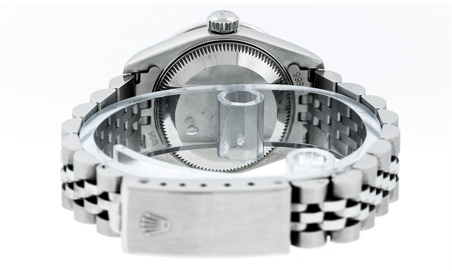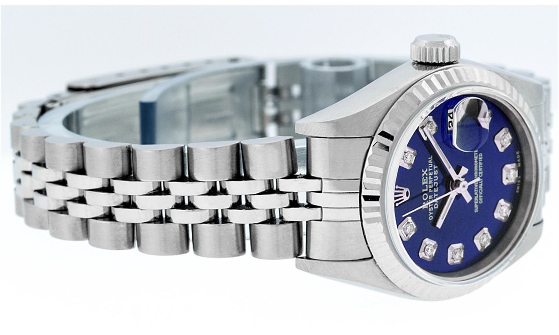 One Ladies Quickset Stainless Steel Rolex Datejust Polished Bright with Satin Finish, Serviced & Electronically Tested, Stainless Steel Case: 26mm, Stainless Steel Crown, Bezel: 18K White Gold Fluted Bezel. Custom Crystal: New Scratch Resistant Sapphire Cyclops Lens. Custom Hands: New Luminescent Hands. Movement: Automatic Winding Movement Caliber 2235. Custom Dial: Blue Diamond Dial, Diamond Count: 10 Diamonds In Dial, Color: G to H, Clarity: SI1 Date Window: 3 O'Clock Position Date Display, Model: 79174 Quickset Datejust. Condition: G-6 Extra Fine. Bracelet: Stainless Steel Jubilee Band. Bright Polish & Satin Finish. 6.0 Inch Length, Adjustable. Standard Clasp, With Rolex Logo. This Watch Has Been Serviced Time Tested And Is In Excellent Condition It Is Free Of All Scratches And Dents.