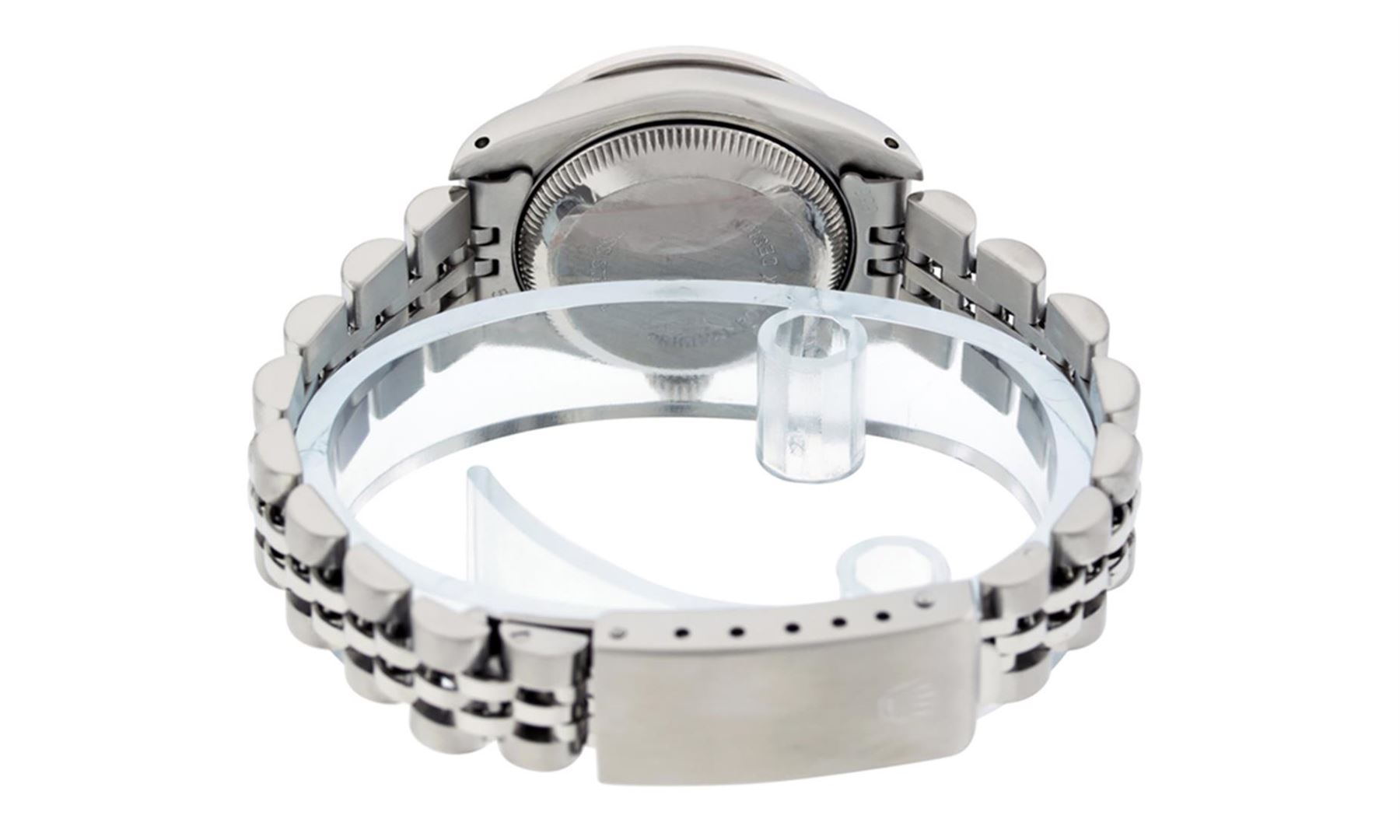 One Ladies Stainless Steel Rolex Datejust Polished Bright with Satin Finish, Serviced & Electronically Tested, Stainless Steel Case: 26mm, Stainless Steel Crown, Custom Bezel: New 18K White Gold Sapphire Beadset Diamond Bezel, Diamond + Gem Count: 28 Diam
