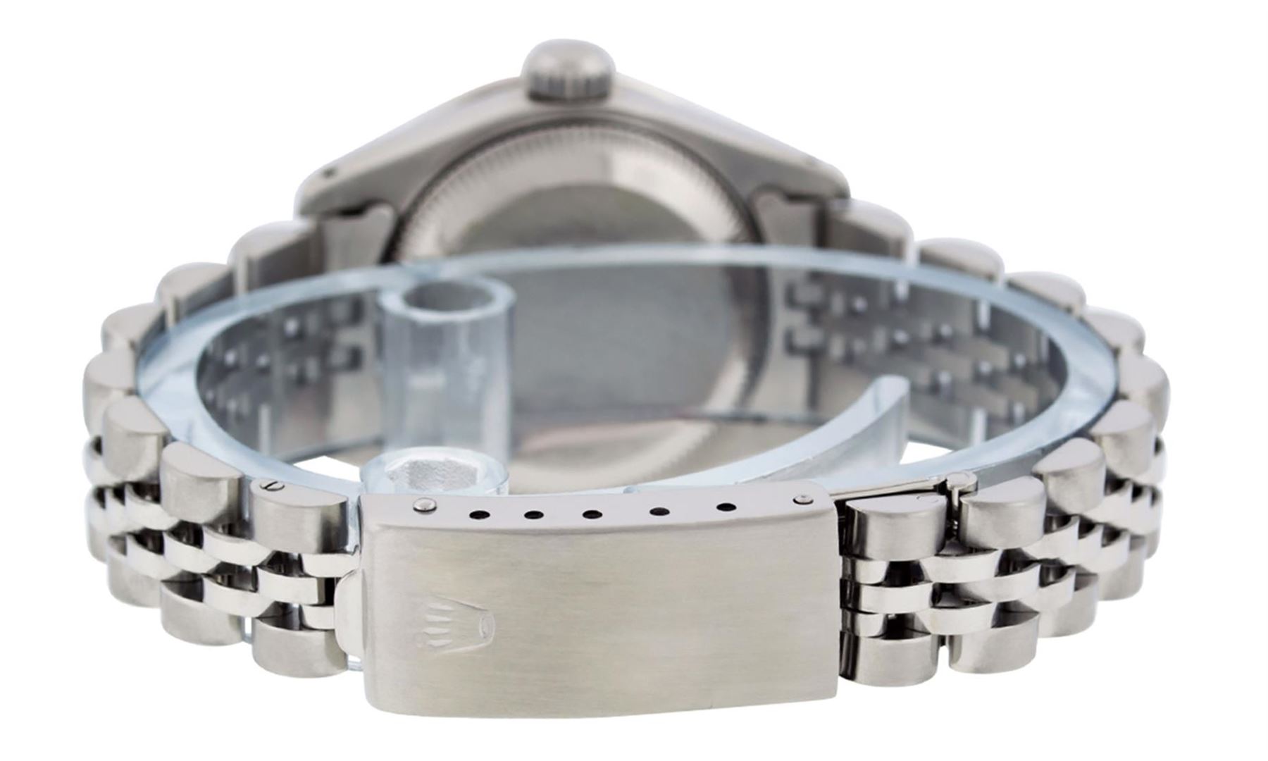 One Ladies Stainless Steel Rolex Datejust Polished Bright with Satin Finish, Serviced & Electronically Tested, Stainless Steel Case: 26mm, Stainless Steel Crown, Custom Bezel: New 18K White Gold Sapphire Beadset Diamond Bezel, Diamond + Gem Count: 28 Diamonds + 4 Sapphires Total Weight .70 Carat, Clarity: SI-VS, Color: G to H. Custom Crystal: New Synthetic Sapphire Cyclops Lens. Custom Hands: New Luminescent Hands. Movement: Automatic Winding Movement Caliber 2030. Custom Dial: Refinished Blue With Diamond Hour Markers, 10 Diamond in Dial G To H In Color, Clarity: SI-VS. Date Window: 3 O'Clock Position Date Display, Model: Datejust. Condition: G-6 Extra Fine. Bracelet: Stainless Steel Jubilee. Bright Polish & Satin Finish. 6.0 Inch Length, Adjustable. Standard Clasp, With Rolex Logo. This Watch Has Been Serviced Time Tested And Is In Excellent Condition It Is Free Of All Scratches And Dents.