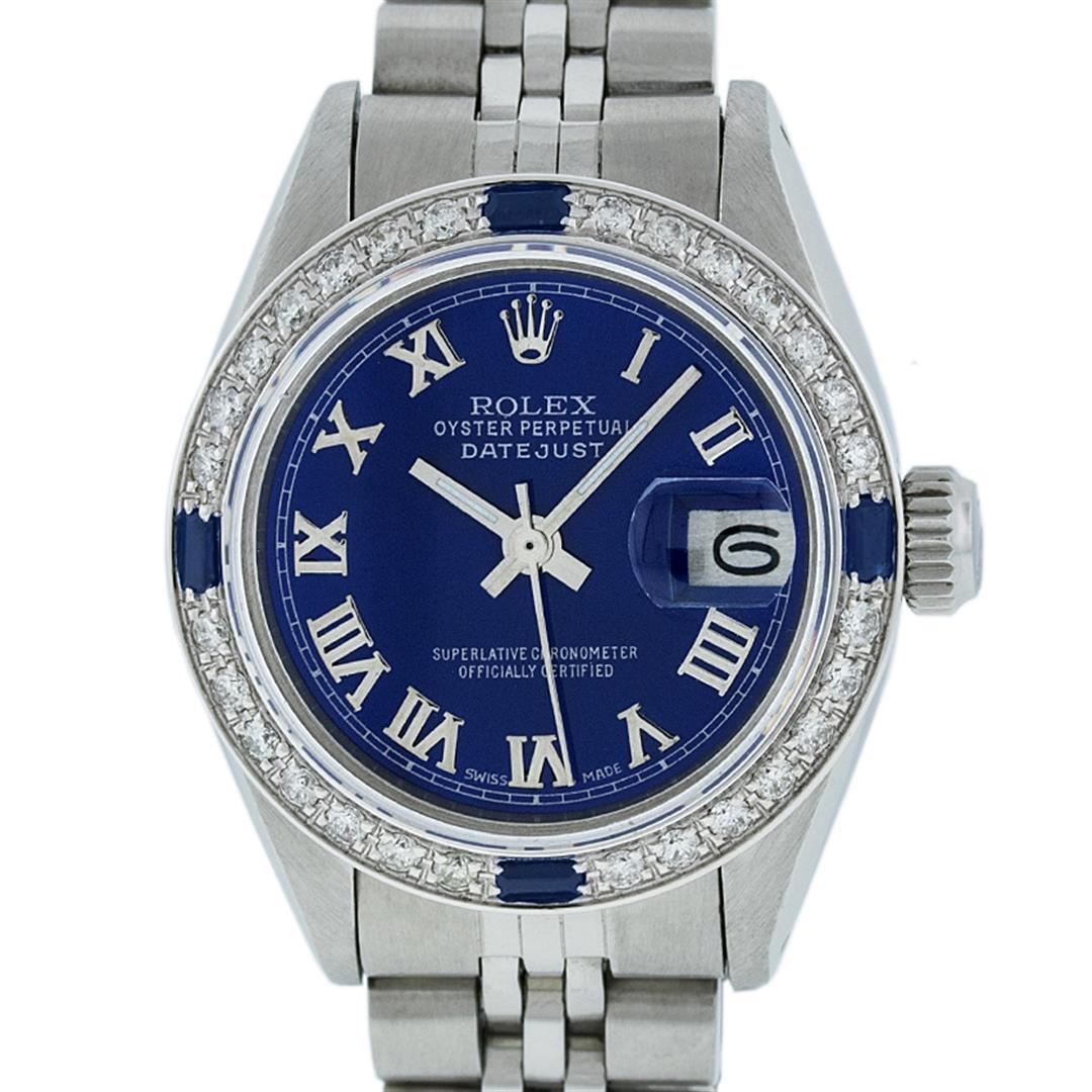 One Ladies Stainless Steel Rolex Datejust Polished Bright with Satin Finish, Serviced & Electronically Tested, Stainless Steel Case: 26mm, Stainless Steel Crown, Custom Bezel: New 18K White Gold Sapphire Beadset Diamond Bezel, Diamond + Gem Count: 28 Diamonds + 4 Sapphires, Total Weight .70 Carat, Clarity: SI-VS, Color: G to H. Custom Crystal: New Scratch Resistant Synthetic Sapphire Cyclops Lens. Custom Hands: New Luminescent Hands. Movement: Automatic Winding Movement Caliber 2030. Custom Dial: Blue Roman Dial With Square Track. Date Window: 3 O'Clock Position Date Display, Model: Datejust. Condition: G-6 Extra Fine. Bracelet: Stainless Steel Jubilee. Bright Polish & Satin Finish. 6.0 Inch Length, Adjustable. Standard Clasp, With Rolex Logo. This Watch Has Been Serviced Time Tested And Is In Excellent Condition It Is Free Of All Scratches And Dents.