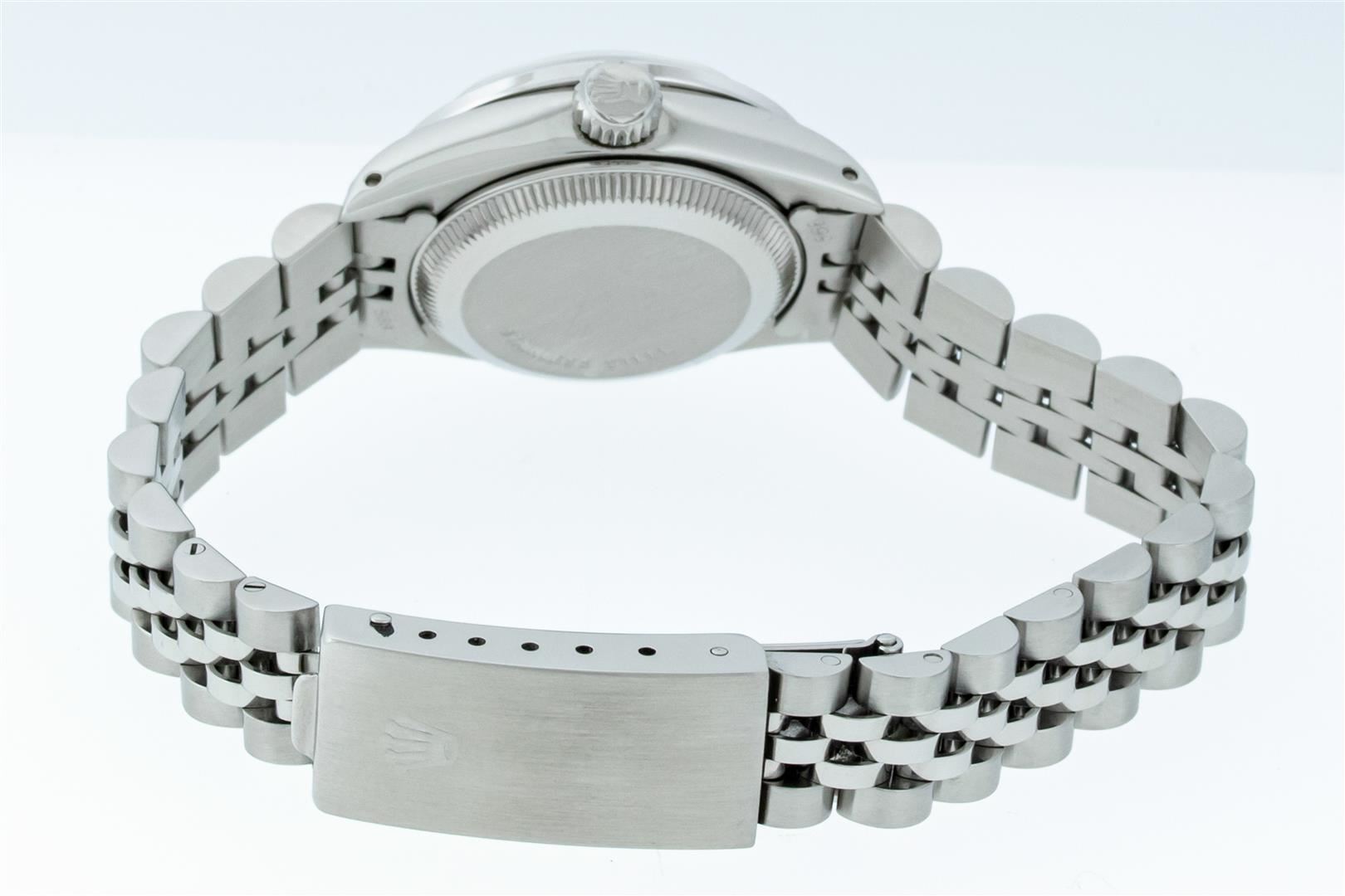 One Ladies Stainless Steel Rolex Datejust Polished Bright with Satin Finish, Serviced & Electronically Tested, Rolex Stainless Steel Case: 26mm, Rolex Stainless Steel Crown. Custom Bezel: New 18K White Gold Sapphire Beadset Bezel, Diamond Count: 28 Diamonds + 4 Sapphires, Clarity: SI-VS, Color: G to H. Custom Crystal: New Sapphire With Magnified Date Window. Custom Hands: New Luminescent Hands. Rolex Movement: Automatic Winding Movement. Custom Dial: Refinished To Blue With Custom Added Diamonds, 10 Diamonds in Dial G To H In Color, Clarity: VS. Date Window: 3 O'clock Position Date Display, Model: Datejust Condition: G-6 Extra Fine. Rolex Bracelet: Stainless Steel Jubilee Band. Bright Polish & Satin Finish. 6.0 Inch Length, Adjustable. Standard Clasp, With Rolex Logo. This Pre Owned Watch Has Been Serviced Time Tested And Is In Excellent Condition It Is Free Of All Scratches And Dents. This Watch Comes With A Rolex Box.