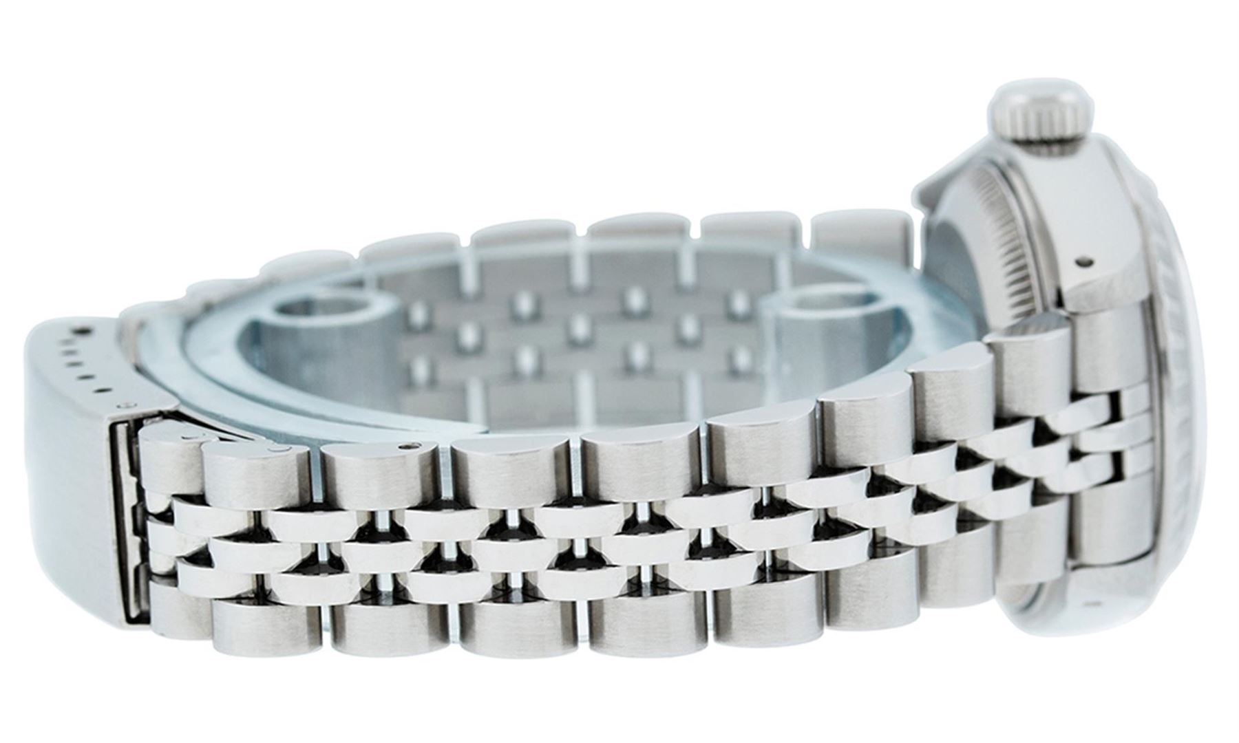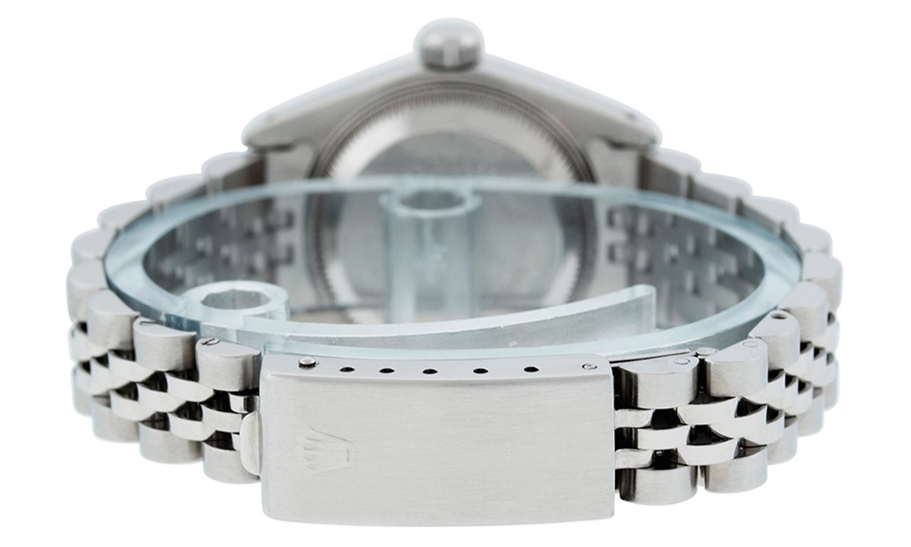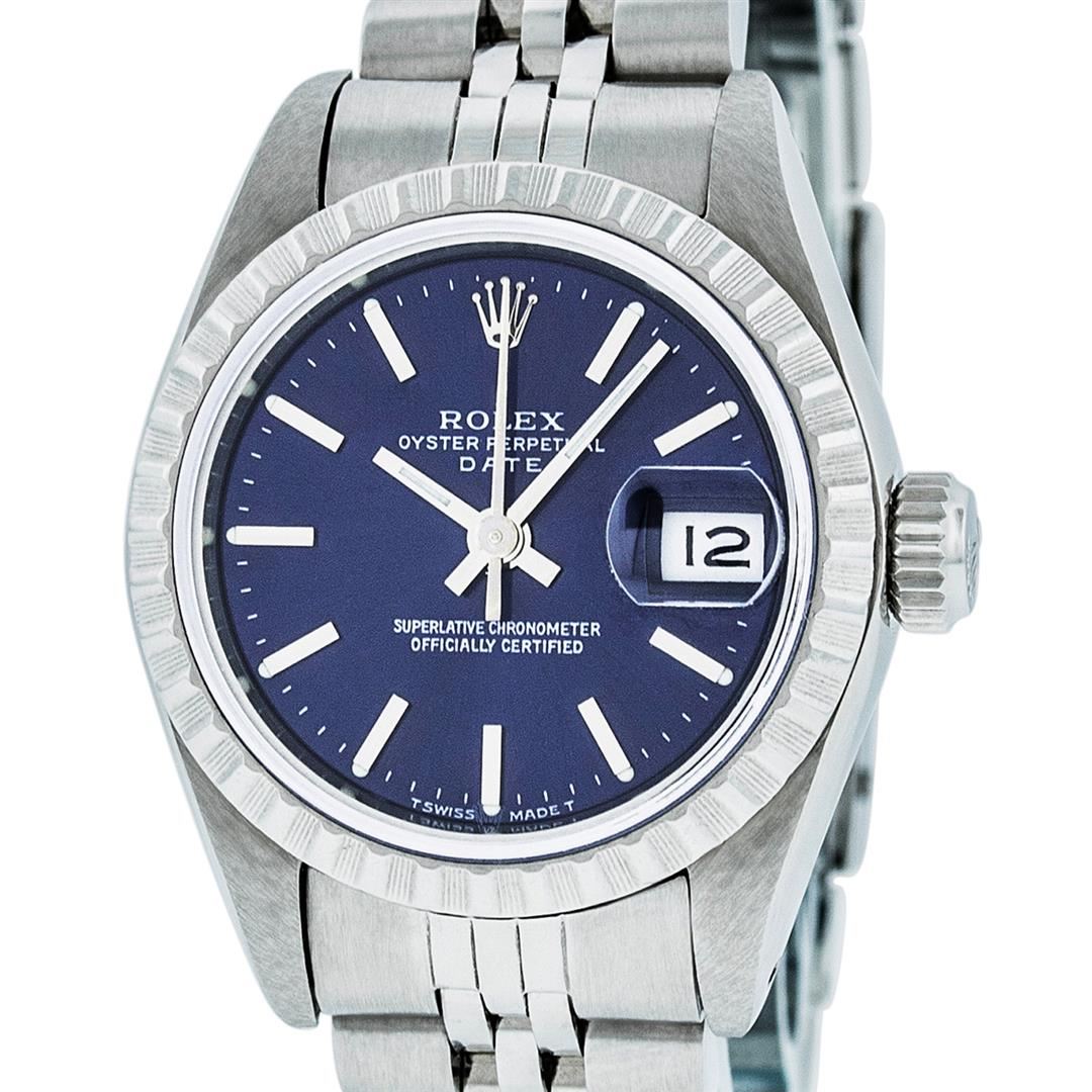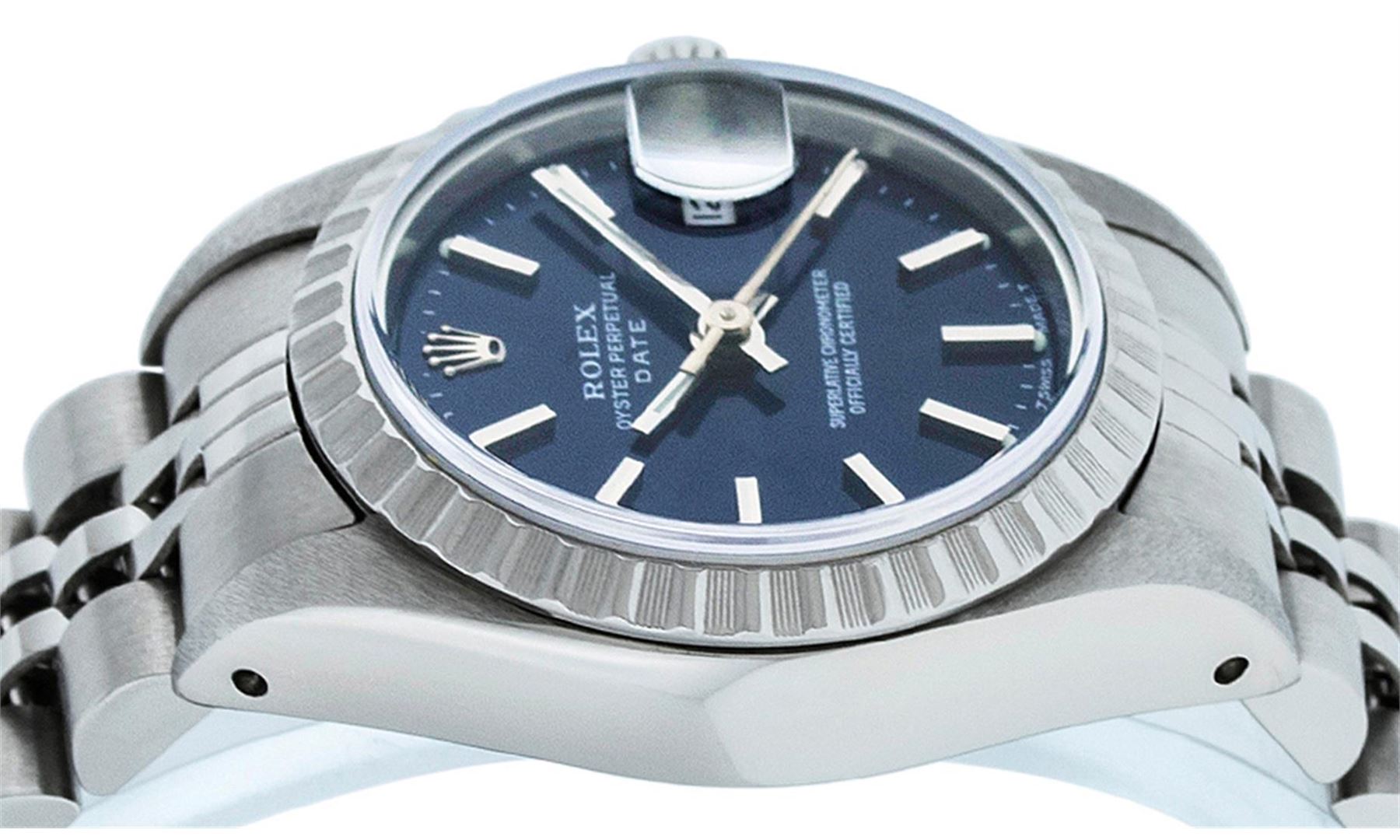 One Ladies Quickset Stainless Steel Rolex Datejust Polished Bright with Satin Finish, Serviced & Electronically Tested, Stainless Steel Case: 26mm, Stainless Steel Crown, Bezel: Stainless Steel Engine Turn Bezel. Custom Crystal: New Scratch Resistant Sapphire Cyclops Lens. Custom Hands: New Luminescent Hands. Movement: Automatic Winding Movement Caliber 2235. Custom Dial: Blue Index Dial With Luminescent Dots & Dash Track. Date Window: 3 O'Clock Position Date Display, Model: 79160 Quickset Datejust. Condition: G-6 Extra Fine. Bracelet: Stainless Steel Jubilee Band. Bright Polish & Satin Finish. 6.0 Inch Length, Adjustable. Standard Clasp, With Rolex Logo. This Watch Has Been Serviced Time Tested And Is In Excellent Condition It Is Free Of All Scratches And Dents.