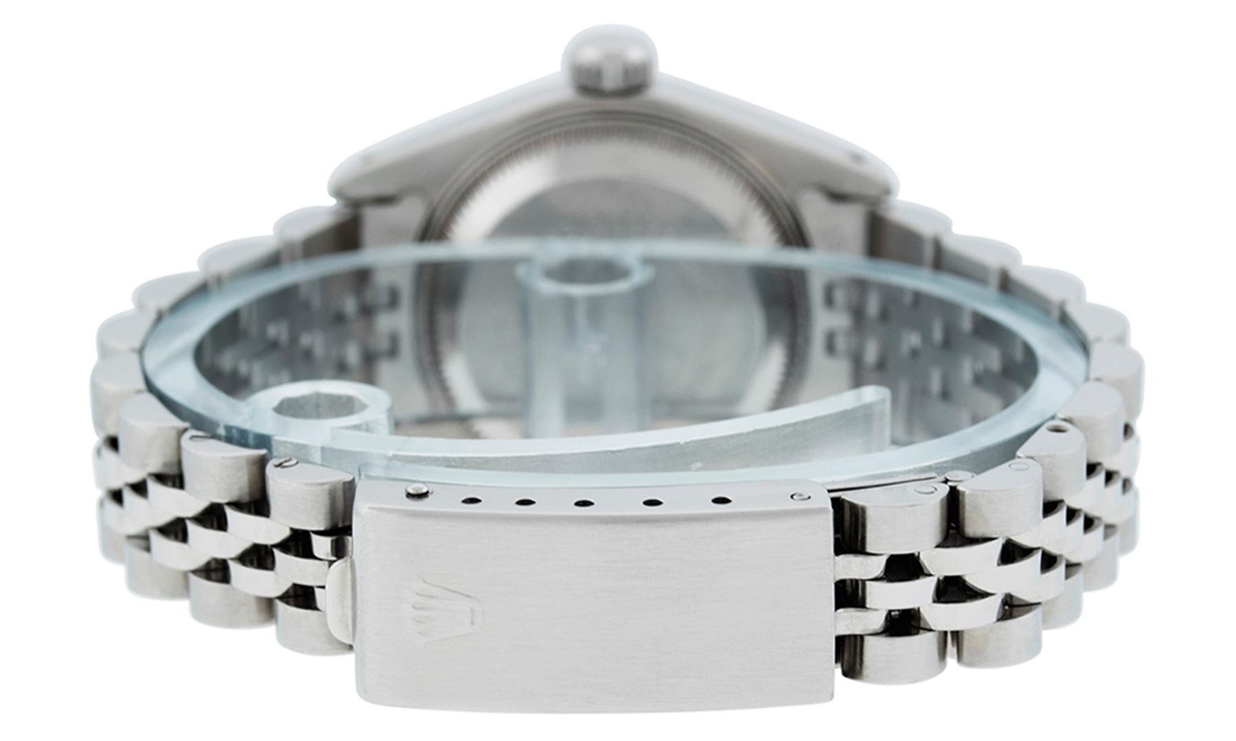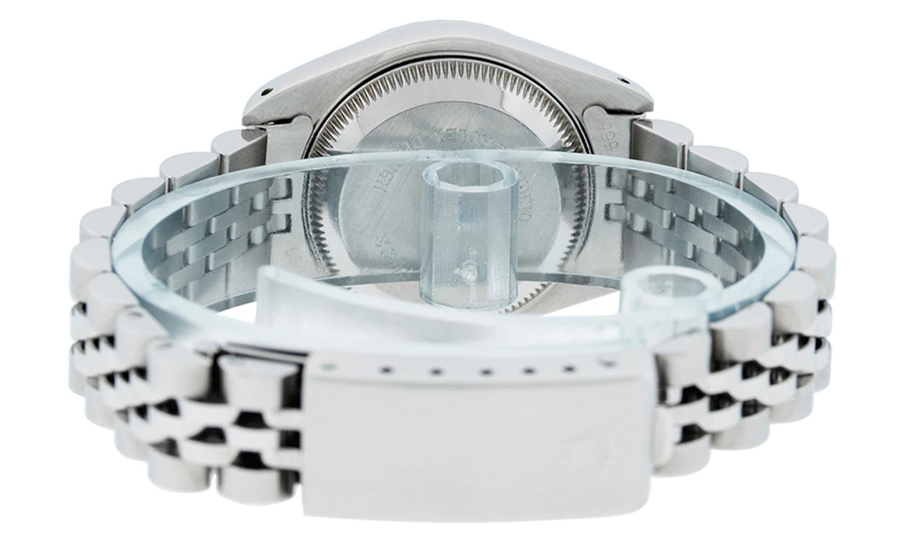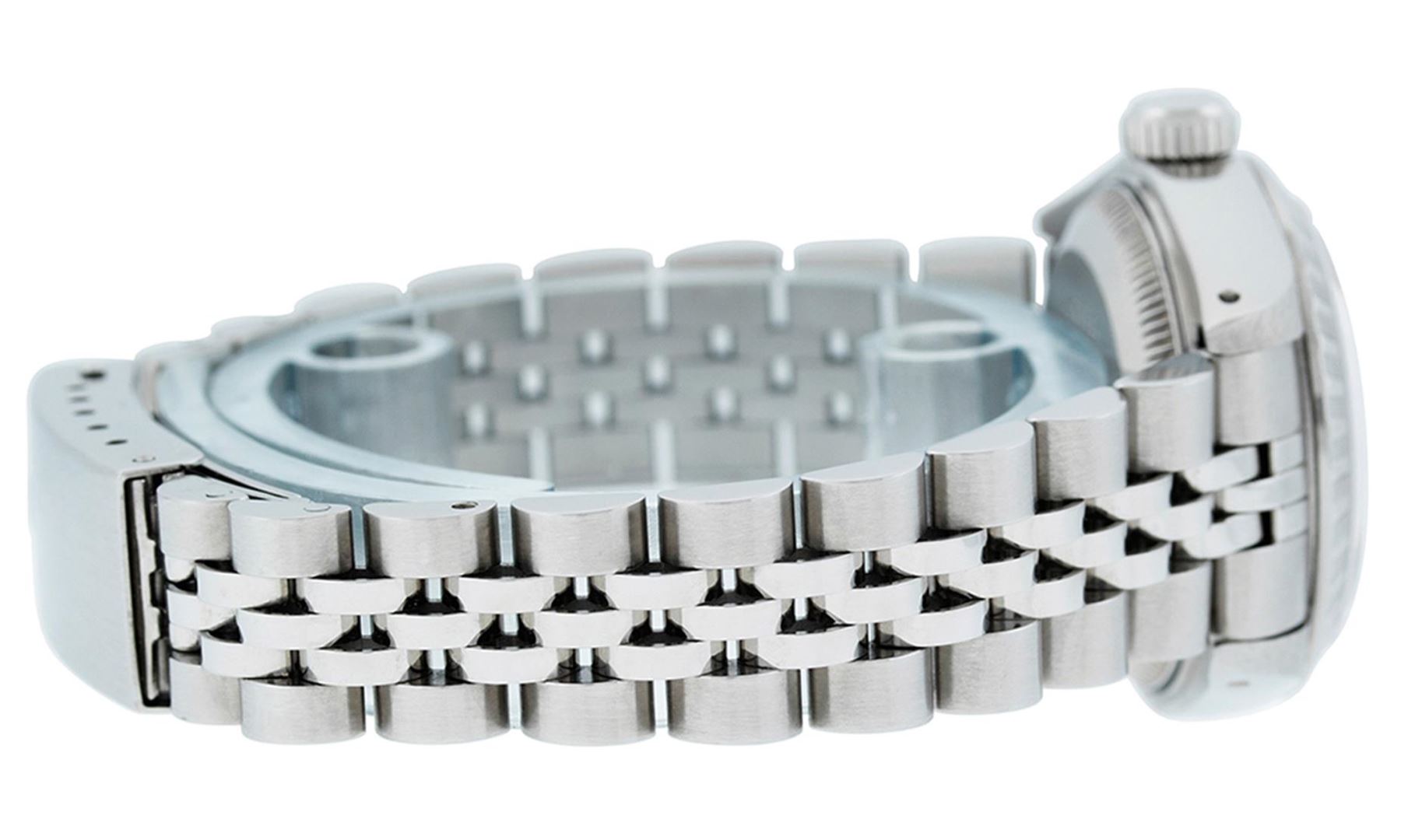 One Ladies Pre Owned Quickset Stainless Steel Rolex Date Polished Bright with Satin Finish, Serviced & Electronically Tested, Rolex Stainless Steel Case: 26mm, Rolex Stainless Steel Crown, Rolex Bezel: Stainless Steel Engine Turn Bezel. Crystal: Sapphire With Magnified Date Window. Hands: Luminescent Hands. Rolex Movement: Automatic Winding Movement 2230. Rolex Dial: Blue Index Dial With Luminescent Dots & Dash Track. Date Window: 3 O'Clock Position Date Display, Model: Sapphire Quickset Date Caliber 2230. Condition: G-6 Extra Fine. Rolex Bracelet: Stainless Steel Jubilee Band. Bright Polish & Satin Finish. 6.0 Inch Length, Adjustable. Standard Clasp, With Rolex Logo. This Watch Has Been Serviced Time Tested And Is In Excellent Condition It Is Free Of All Scratches And Dents.