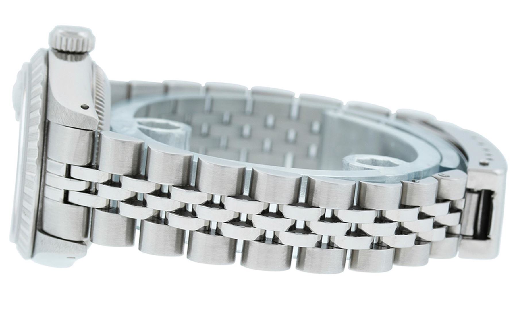 One Ladies Pre Owned Quickset Stainless Steel Rolex Date Polished Bright with Satin Finish, Serviced & Electronically Tested, Rolex Stainless Steel Case: 26mm, Rolex Stainless Steel Crown, Rolex Bezel: Stainless Steel Engine Turn Bezel. Crystal: Sapphire With Magnified Date Window. Hands: Luminescent Hands. Rolex Movement: Automatic Winding Movement 2230. Rolex Dial: Blue Index Dial With Luminescent Dots & Dash Track. Date Window: 3 O'Clock Position Date Display, Model: Sapphire Quickset Date Caliber 2230. Condition: G-6 Extra Fine. Rolex Bracelet: Stainless Steel Jubilee Band. Bright Polish & Satin Finish. 6.0 Inch Length, Adjustable. Standard Clasp, With Rolex Logo. This Watch Has Been Serviced Time Tested And Is In Excellent Condition It Is Free Of All Scratches And Dents.