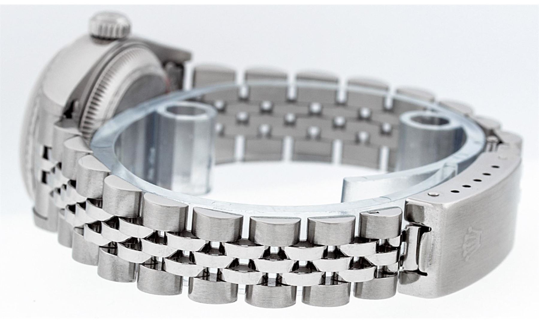 One Ladies Pre Owned Quickset Stainless Steel Rolex Datejust Polished Bright with Satin Finish, Serviced & Electronically Tested, Stainless Steel Case: 26mm, Stainless Steel Crown, Bezel: 18K White Gold Fluted Bezel. Custom Crystal: New Sapphire With Magnified Date Window. Custom Hands: New Luminescent Hands. Rolex Movement: Automatic Winding Movement. Custom Dial: Refinished To Blue With Custom Index Hour Markers And Dash Track . Date Window: 3 O'Clock Position Date Display, Model: Quickset Datejust. Condition: G-6 Extra Fine. Rolex Bracelet: Stainless Steel Jubilee Band. Bright Polish & Satin Finish. 6.0 Inch Length, Adjustable. Standard Clasp, With Rolex Logo. This Watch Has Been Serviced Time Tested And Is In Excellent Condition It Is Free Of All Scratches And Dents.