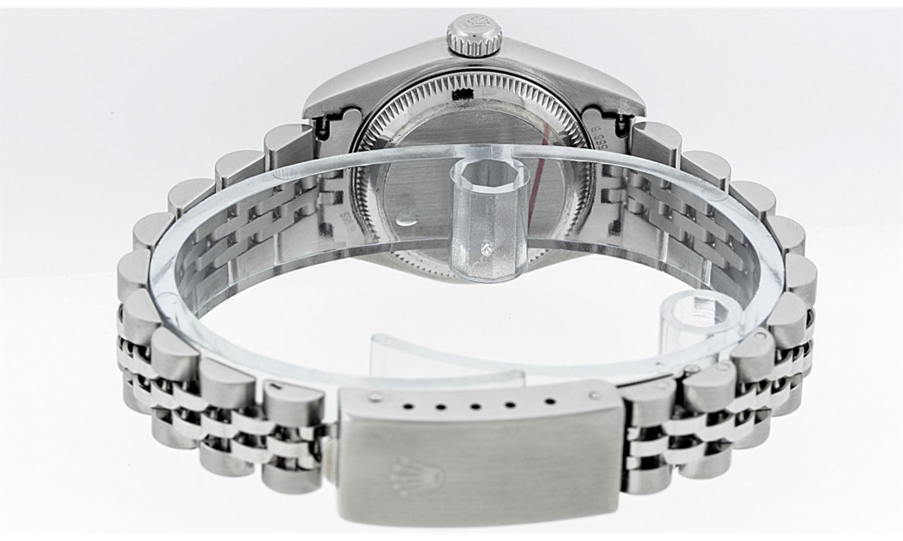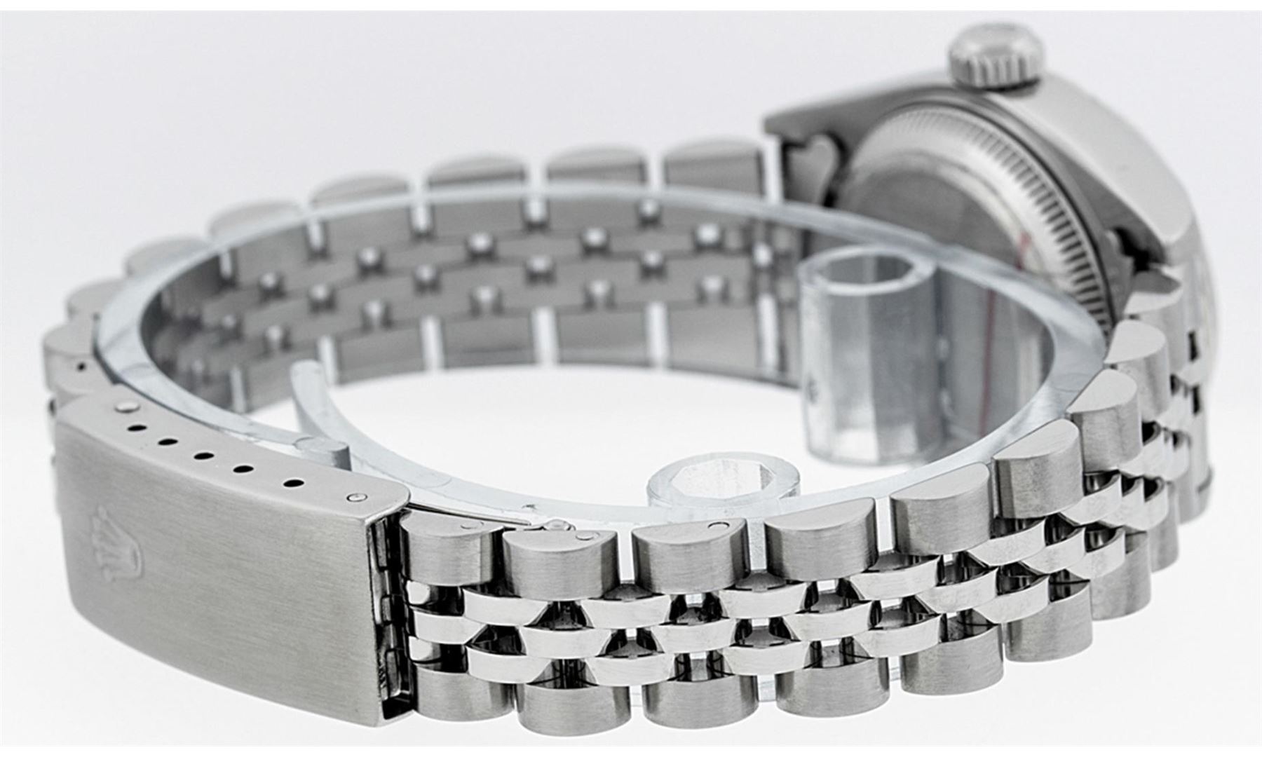 One Ladies Pre Owned Quickset Stainless Steel Rolex Datejust Polished Bright with Satin Finish, Serviced & Electronically Tested, Stainless Steel Case: 26mm, Stainless Steel Crown, Bezel: 18K White Gold Fluted Bezel. Custom Crystal: New Sapphire With Magnified Date Window. Custom Hands: New Luminescent Hands. Rolex Movement: Automatic Winding Movement. Custom Dial: Refinished To Blue With Custom Index Hour Markers And Dash Track . Date Window: 3 O'Clock Position Date Display, Model: Quickset Datejust. Condition: G-6 Extra Fine. Rolex Bracelet: Stainless Steel Jubilee Band. Bright Polish & Satin Finish. 6.0 Inch Length, Adjustable. Standard Clasp, With Rolex Logo. This Watch Has Been Serviced Time Tested And Is In Excellent Condition It Is Free Of All Scratches And Dents.