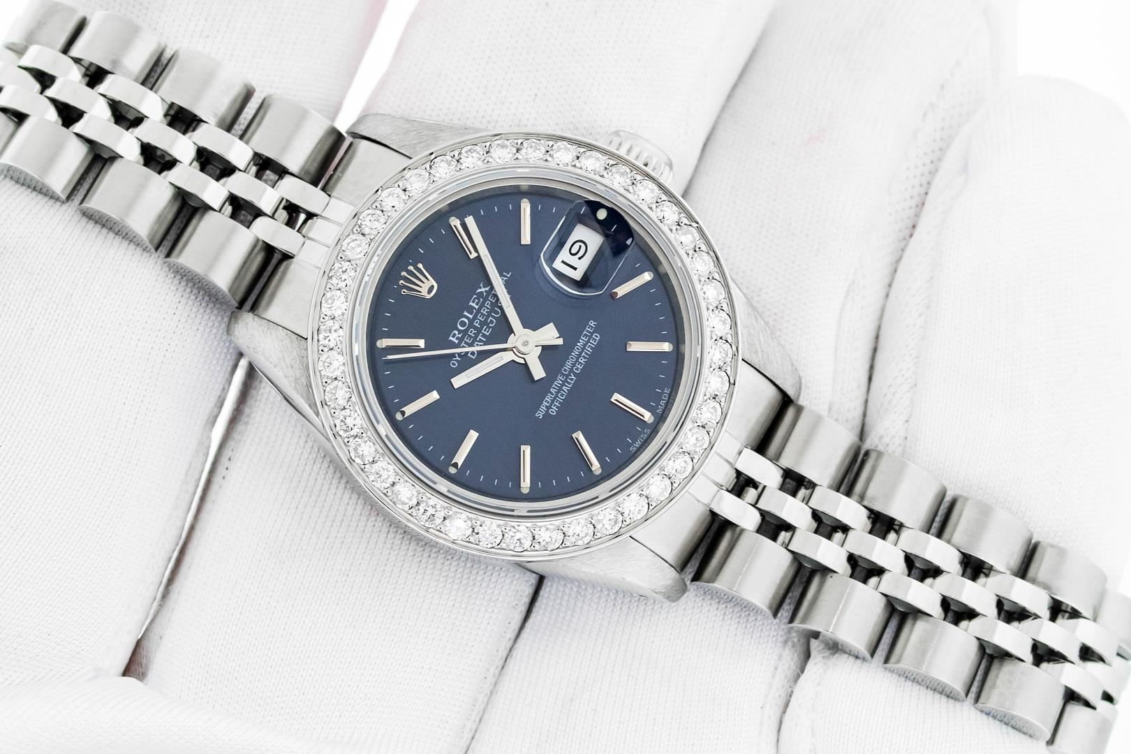 One Ladies Pre Owned Stainless Steel Rolex Datejust Polished Bright with Satin Finish Serviced & Electronically Tested, Rolex Stainless Steel Case: 26mm, Rolex Stainless Steel Crown, Custom Bezel: New Stainless Steel Beadset Diamond Bezel, Diamond Count: 40 Diamonds On Bezel Dial. Custom Crystal: New Sapphire With Date Window. Custom Hands: New Luminescent Hands. Rolex Movement: Automatic Winding Movement. Rolex Dial: Blue Index Dial With Dash Track. Date Window: 3 O'Clock Position Date Display, Model: Datejust. Condition: G-6 Extra Fine. Rolex Bracelet: Stainless Steel Jubilee Band With Rolex Crown On Buckle. Bright Polish & Satin Finish. Band Length: 6.0 Inch Length, Adjustable. Standard Clasp, With Rolex Logo. This Watch Has Been Serviced Time Tested And Is In Excellent Condition It Is Free Of All Scratches And Dents.