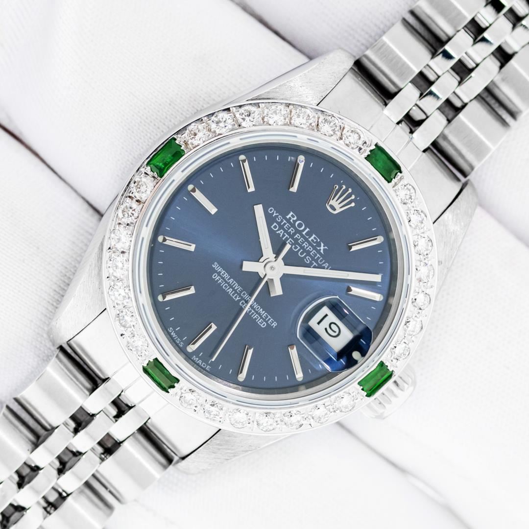 One Ladies Pre Owned Quickset Stainless Steel Rolex Datejust Polished Bright with Satin Finish Serviced & Electronically Tested, Rolex Stainless Steel Case: 26mm, Rolex Stainless Steel Crown, Custom Bezel: New White Gold Beadset + Emerald Diamond Bezel, Diamond Count: 28 Diamonds + 4 Emeralds. Custom Crystal: New Sapphire With Date Window. Custom Hands: New Luminescent Hands. Rolex Movement: Automatic Winding Movement. Rolex Dial: Blue Index Dial With Dash Track. Date Window: 3 O'Clock Position Date Display, Model: Datejust. Condition: G-6 Extra Fine. Rolex Bracelet: Stainless Steel Jubilee Band With Rolex Crown On Buckle. Bright Polish & Satin Finish. Band Length: 6.0 Inch Length, Adjustable. Standard Clasp, With Rolex Logo. This Watch Has Been Serviced Time Tested And Is In Excellent Condition It Is Free Of All Scratches And Dents.