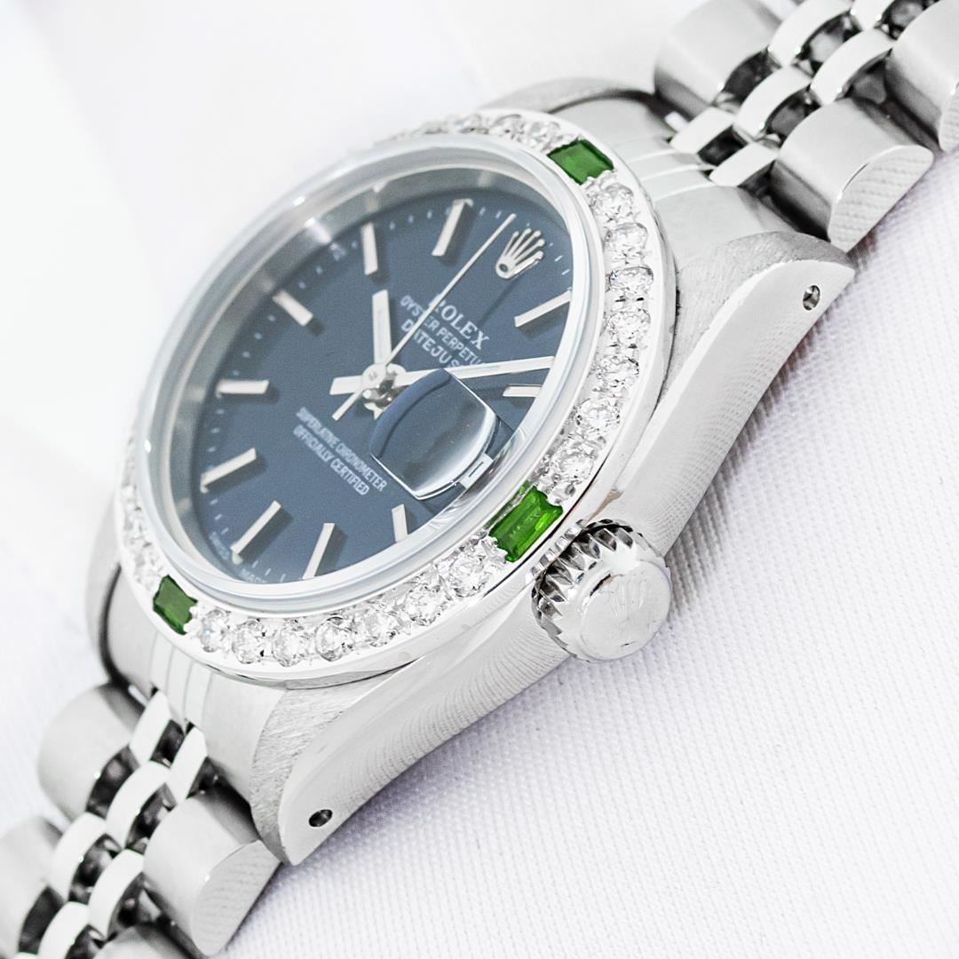 One Ladies Pre Owned Quickset Stainless Steel Rolex Datejust Polished Bright with Satin Finish Serviced & Electronically Tested, Rolex Stainless Steel Case: 26mm, Rolex Stainless Steel Crown, Custom Bezel: New White Gold Beadset + Emerald Diamond Bezel, Diamond Count: 28 Diamonds + 4 Emeralds. Custom Crystal: New Sapphire With Date Window. Custom Hands: New Luminescent Hands. Rolex Movement: Automatic Winding Movement. Rolex Dial: Blue Index Dial With Dash Track. Date Window: 3 O'Clock Position Date Display, Model: Datejust. Condition: G-6 Extra Fine. Rolex Bracelet: Stainless Steel Jubilee Band With Rolex Crown On Buckle. Bright Polish & Satin Finish. Band Length: 6.0 Inch Length, Adjustable. Standard Clasp, With Rolex Logo. This Watch Has Been Serviced Time Tested And Is In Excellent Condition It Is Free Of All Scratches And Dents.