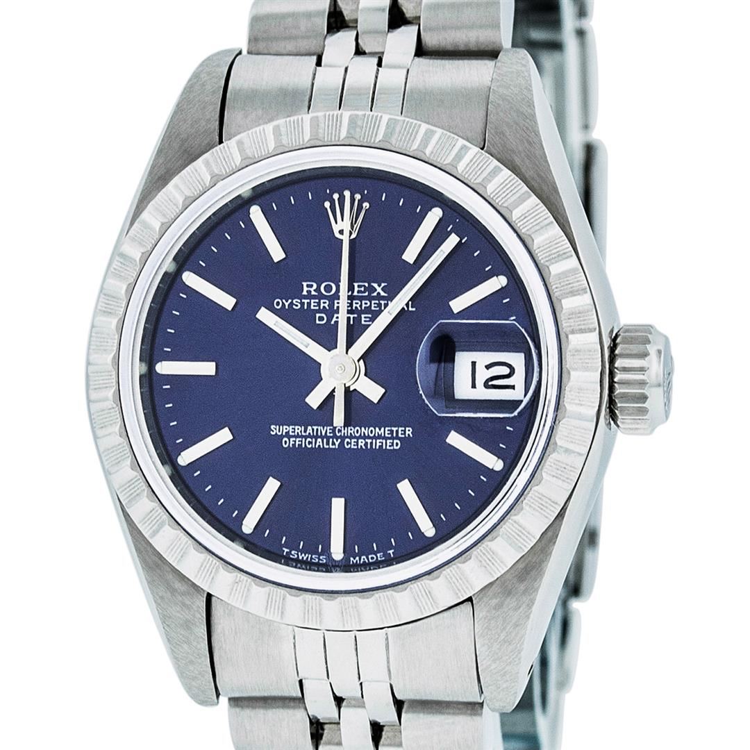One Ladies Pre Owned Quickset Stainless Steel Rolex Datejust Polished Bright with Satin Finish, Serviced & Electronically Tested, Rolex Stainless Steel Case: 26mm, Rolex Stainless Steel Crown, Rolex Bezel: Stainless Steel Engine Turn Bezel. Custom Crystal: New Scratch Resistant Sapphire Cyclops Lens. Custom Hands: New Luminescent Hands. Rolex Movement: Automatic Winding Movement. Rolex Dial: Blue Index Dial With Luminescent Dots & Dash Track. Date Window: 3 O'clock Position Date Display, Model: Sapphire Quickset Datejust Caliber 2230. Condition: G-6 Extra Fine. Rolex Bracelet: Stainless Steel Jubilee Band. Bright Polish & Satin Finish. 6.0 Inch Length, Adjustable. Standard Clasp, With Rolex Logo. This Watch Has Been Serviced Time Tested And Is In Excellent Condition It Is Free Of All Scratches And Dents.