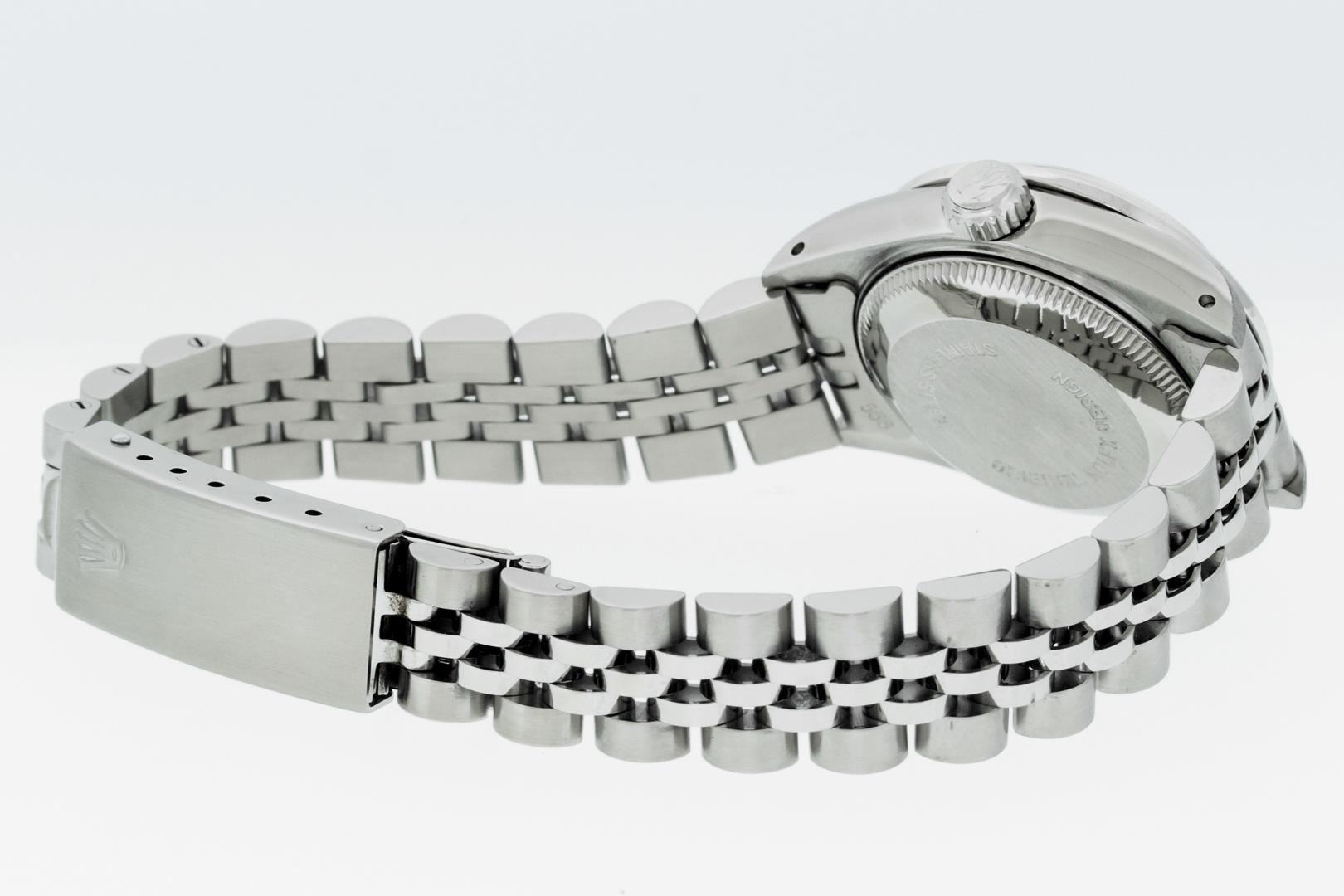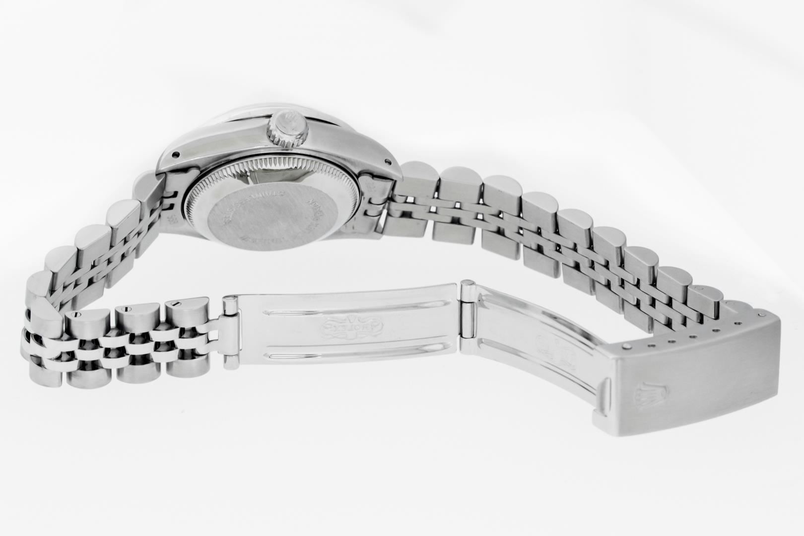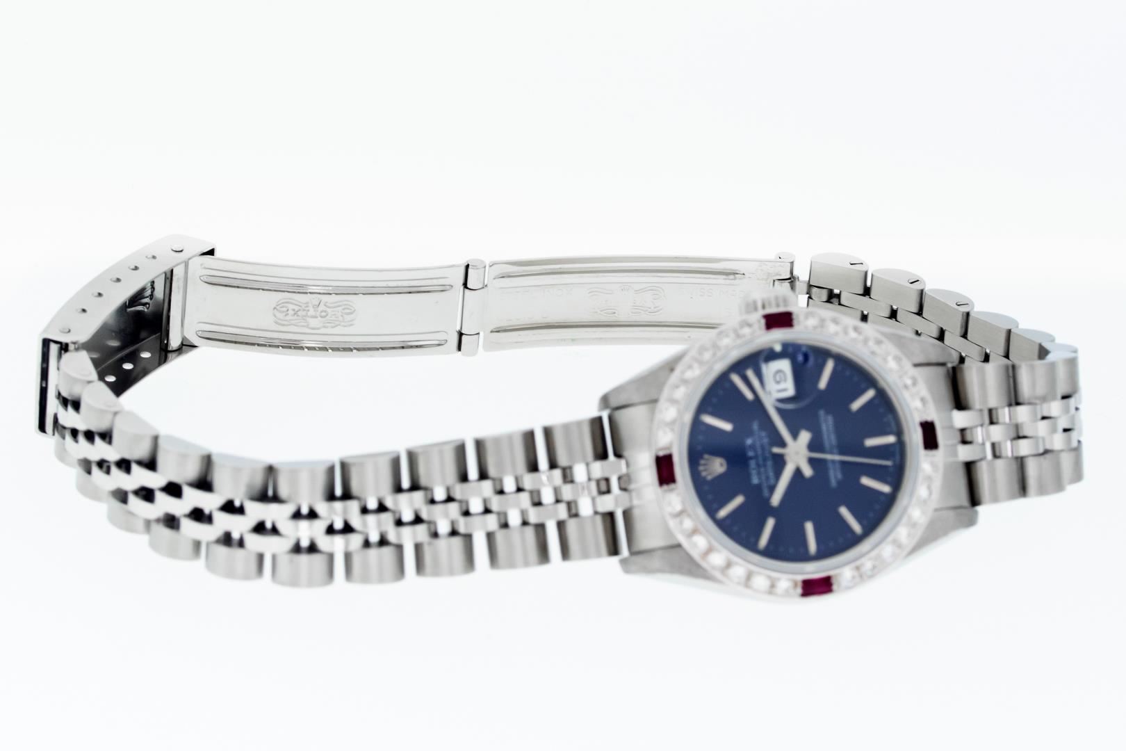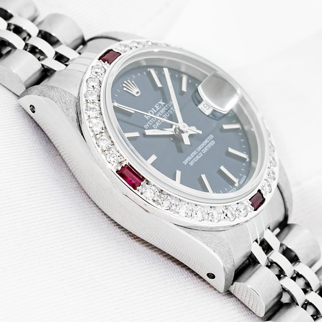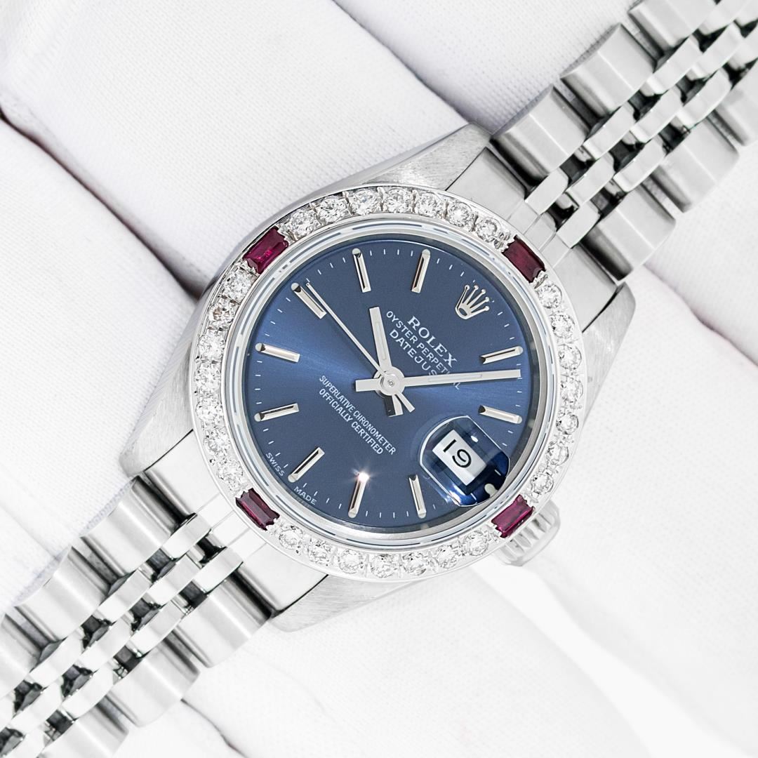 One Ladies Pre Owned Quickset Stainless Steel Rolex Datejust Polished Bright with Satin Finish Serviced & Electronically Tested, Rolex Stainless Steel Case: 26mm, Rolex Stainless Steel Crown, Custom Bezel: New White Gold Beadset + Ruby Diamond Bezel, Diamond Count: 28 Diamonds + 4 Rubies. Custom Crystal: New Sapphire With Date Window. Custom Hands: New Luminescent Hands. Rolex Movement: Automatic Winding Movement. Rolex Dial: Blue Index Dial With Dash Track. Date Window: 3 O'Clock Position Date Display, Model: Datejust. Condition: G-6 Extra Fine. Rolex Bracelet: Stainless Steel Jubilee Band With Rolex Crown On Buckle. Bright Polish & Satin Finish. Band Length: 6.0 Inch Length, Adjustable. Standard Clasp, With Rolex Logo. This Watch Has Been Serviced Time Tested And Is In Excellent Condition It Is Free Of All Scratches And Dents.