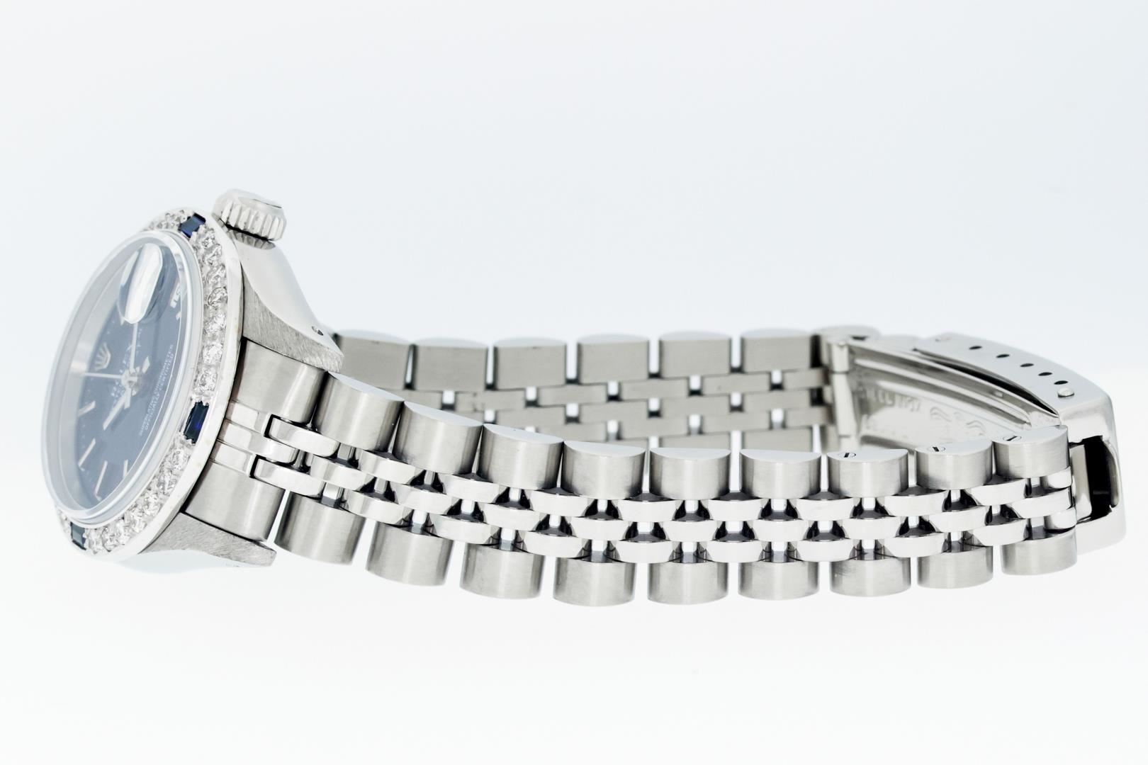 One Ladies Pre Owned Quickset Stainless Steel Rolex Datejust Polished Bright with Satin Finish Serviced & Electronically Tested, Rolex Stainless Steel Case: 26mm, Rolex Stainless Steel Crown, Custom Bezel: New White Gold Beadset + Sapphire Diamond Bezel, Diamond Count: 28 Diamonds + 4 Sapphire Bezels. Custom Crystal: New Sapphire With Date Window. Custom Hands: New Luminescent Hands. Rolex Movement: Automatic Winding Movement. Rolex Dial: Blue Index Dial With Dash Track. Date Window: 3 O'Clock Position Date Display, Model: Datejust. Condition: G-6 Extra Fine. Rolex Bracelet: Stainless Steel Jubilee Band With Rolex Crown On Buckle. Bright Polish & Satin Finish. Band Length: 6.0 Inch Length, Adjustable. Standard Clasp, With Rolex Logo. This Watch Has Been Serviced Time Tested And Is In Excellent Condition It Is Free Of All Scratches And Dents.
