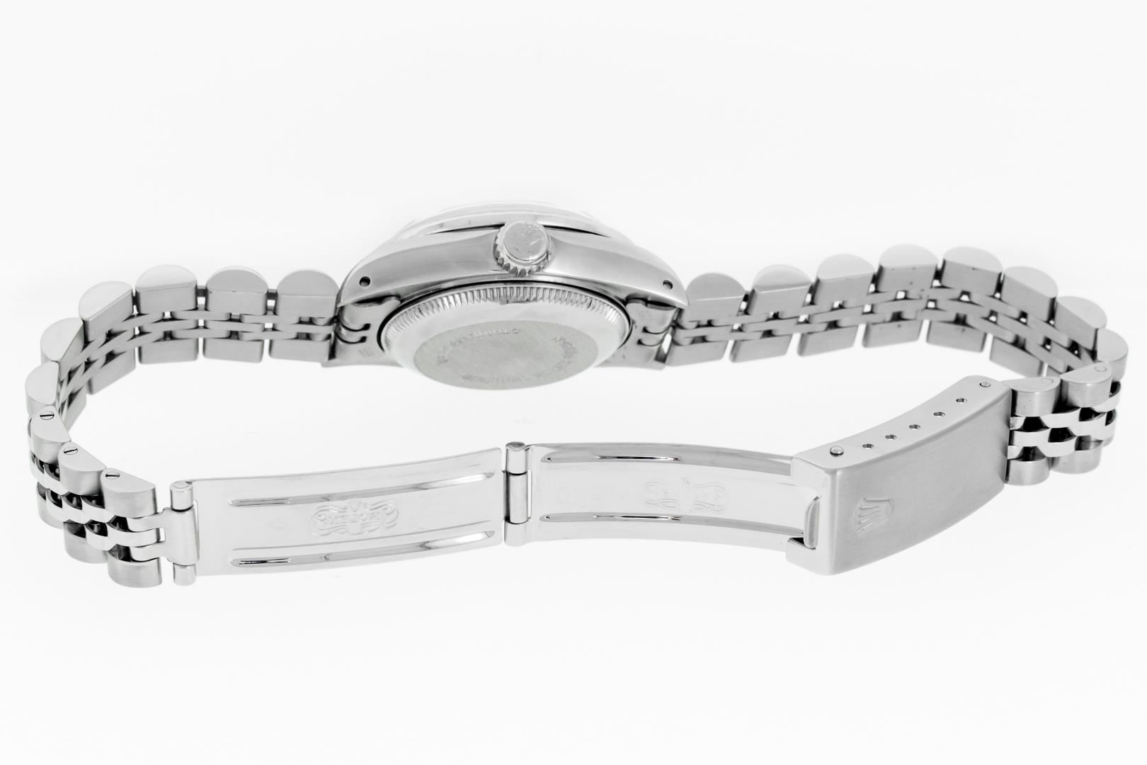 One Ladies Pre Owned Quickset Stainless Steel Rolex Datejust Polished Bright with Satin Finish Serviced & Electronically Tested, Rolex Stainless Steel Case: 26mm, Rolex Stainless Steel Crown, Custom Bezel: New White Gold Beadset + Sapphire Diamond Bezel, Diamond Count: 28 Diamonds + 4 Sapphire Bezels. Custom Crystal: New Sapphire With Date Window. Custom Hands: New Luminescent Hands. Rolex Movement: Automatic Winding Movement. Rolex Dial: Blue Index Dial With Dash Track. Date Window: 3 O'Clock Position Date Display, Model: Datejust. Condition: G-6 Extra Fine. Rolex Bracelet: Stainless Steel Jubilee Band With Rolex Crown On Buckle. Bright Polish & Satin Finish. Band Length: 6.0 Inch Length, Adjustable. Standard Clasp, With Rolex Logo. This Watch Has Been Serviced Time Tested And Is In Excellent Condition It Is Free Of All Scratches And Dents.