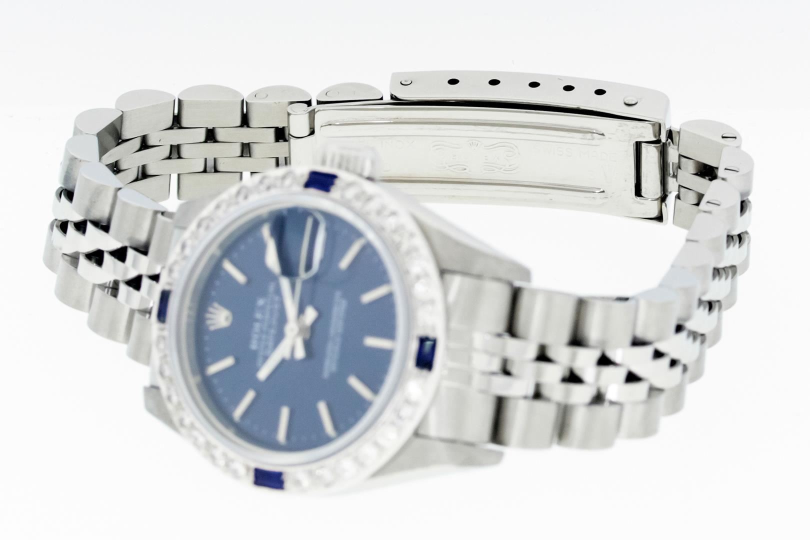 One Ladies Pre Owned Quickset Stainless Steel Rolex Datejust Polished Bright with Satin Finish Serviced & Electronically Tested, Rolex Stainless Steel Case: 26mm, Rolex Stainless Steel Crown, Custom Bezel: New White Gold Beadset + Sapphire Diamond Bezel, Diamond Count: 28 Diamonds + 4 Sapphire Bezels. Custom Crystal: New Sapphire With Date Window. Custom Hands: New Luminescent Hands. Rolex Movement: Automatic Winding Movement. Rolex Dial: Blue Index Dial With Dash Track. Date Window: 3 O'Clock Position Date Display, Model: Datejust. Condition: G-6 Extra Fine. Rolex Bracelet: Stainless Steel Jubilee Band With Rolex Crown On Buckle. Bright Polish & Satin Finish. Band Length: 6.0 Inch Length, Adjustable. Standard Clasp, With Rolex Logo. This Watch Has Been Serviced Time Tested And Is In Excellent Condition It Is Free Of All Scratches And Dents.