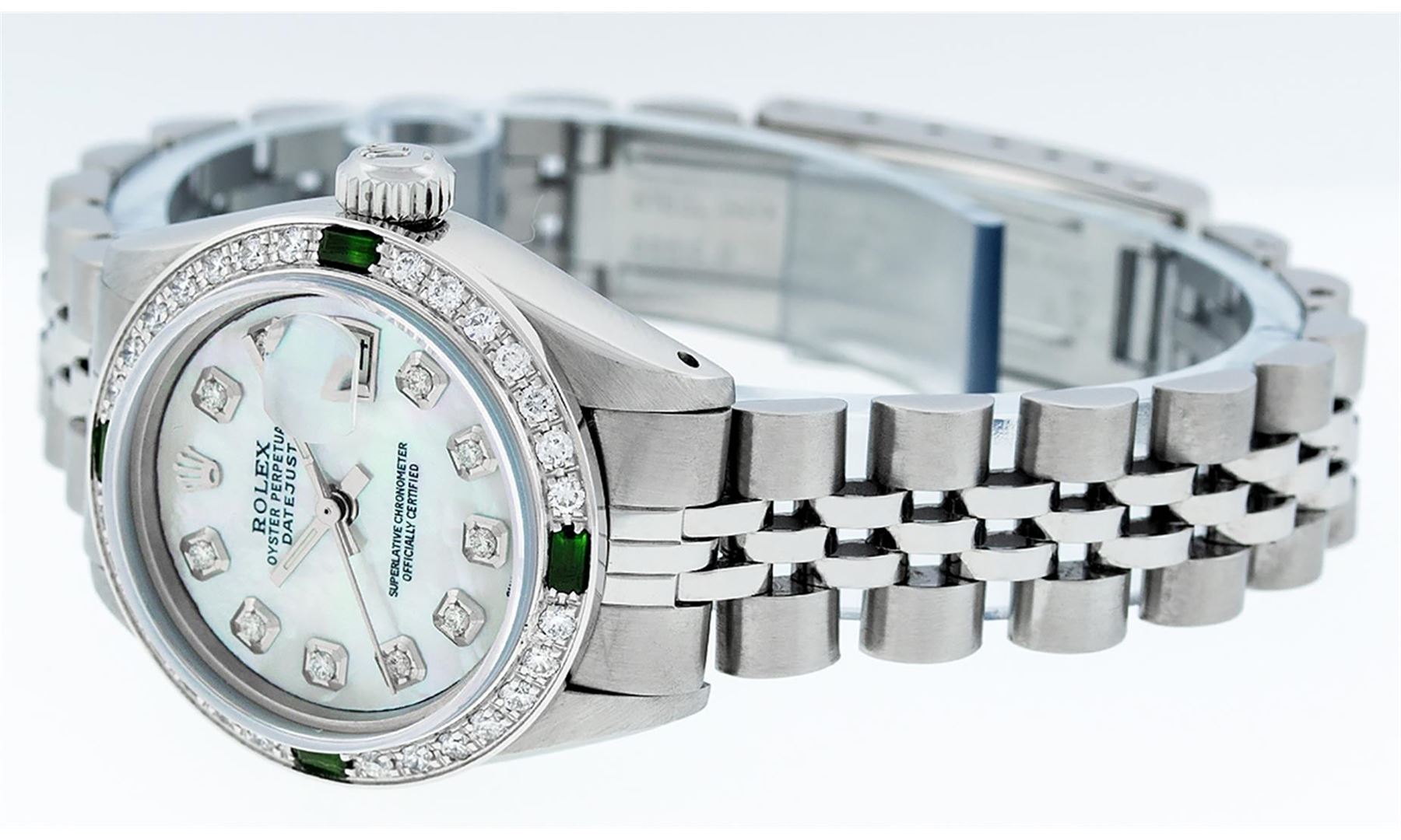 One Ladies Stainless Steel Rolex Datejust Polished Bright with Satin Finish, Serviced & Electronically Tested, Stainless Steel Case: 26mm, Stainless Steel Crown, Custom Bezel: New 18K White Gold Emerald Beadset Diamond Bezel, Diamond + Gem Count: 28 Diamonds + 4 Emeralds. Total Weight .70 Carat, Clarity: SI-VS, Color: G to H. Custom Crystal: New Scratch Resistant Synthetic Sapphire Cyclops Lens. Custom Hands: New Luminescent Hands. Movement: Automatic Winding Movement Caliber 2030. Custom Dial: Refinished Blue Mother Of Pearl With Diamond Hour Markers, 10 Diamonds in Dial, G To H In Color, Clarity: SI-VS. Date Window: 3 O'Clock Position Date Display, Model: Datejust. Condition: G-6 Extra Fine. Bracelet: Stainless Steel Jubilee. Bright Polish & Satin Finish. 6.0 Inch Length, Adjustable. Standard Clasp, With Rolex Logo. This Watch Has Been Serviced Time Tested And Is In Excellent Condition It Is Free Of All Scratches And Dents.