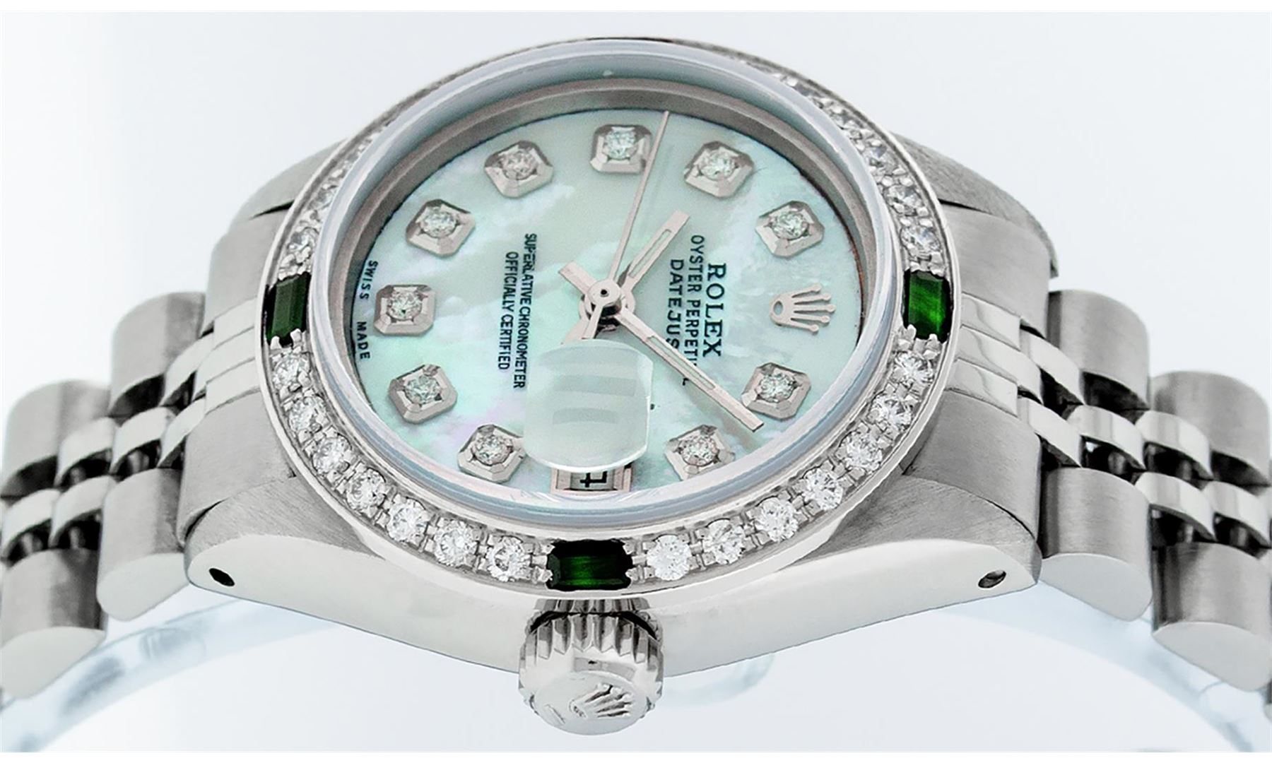 One Ladies Stainless Steel Rolex Datejust Polished Bright with Satin Finish, Serviced & Electronically Tested, Stainless Steel Case: 26mm, Stainless Steel Crown, Custom Bezel: New 18K White Gold Emerald Beadset Diamond Bezel, Diamond + Gem Count: 28 Diamonds + 4 Emeralds. Total Weight .70 Carat, Clarity: SI-VS, Color: G to H. Custom Crystal: New Scratch Resistant Synthetic Sapphire Cyclops Lens. Custom Hands: New Luminescent Hands. Movement: Automatic Winding Movement. Custom Dial: Refinished Blue Mother Of Pearl With Diamond Hour Markers, 10 Diamonds in Dial, G To H In Color, Clarity: SI-VS. Date Window: 3 O'clock Position Date Display, Model: Datejust. Condition: G-6 Extra Fine. Bracelet: Stainless Steel Jubilee Band. Bright Polish & Satin Finish. 6.0 Inch Length, Adjustable. Standard Clasp, With Rolex Logo. This Watch Has Been Serviced Time Tested And Is In Excellent Condition It Is Free Of All Scratches And Dents.