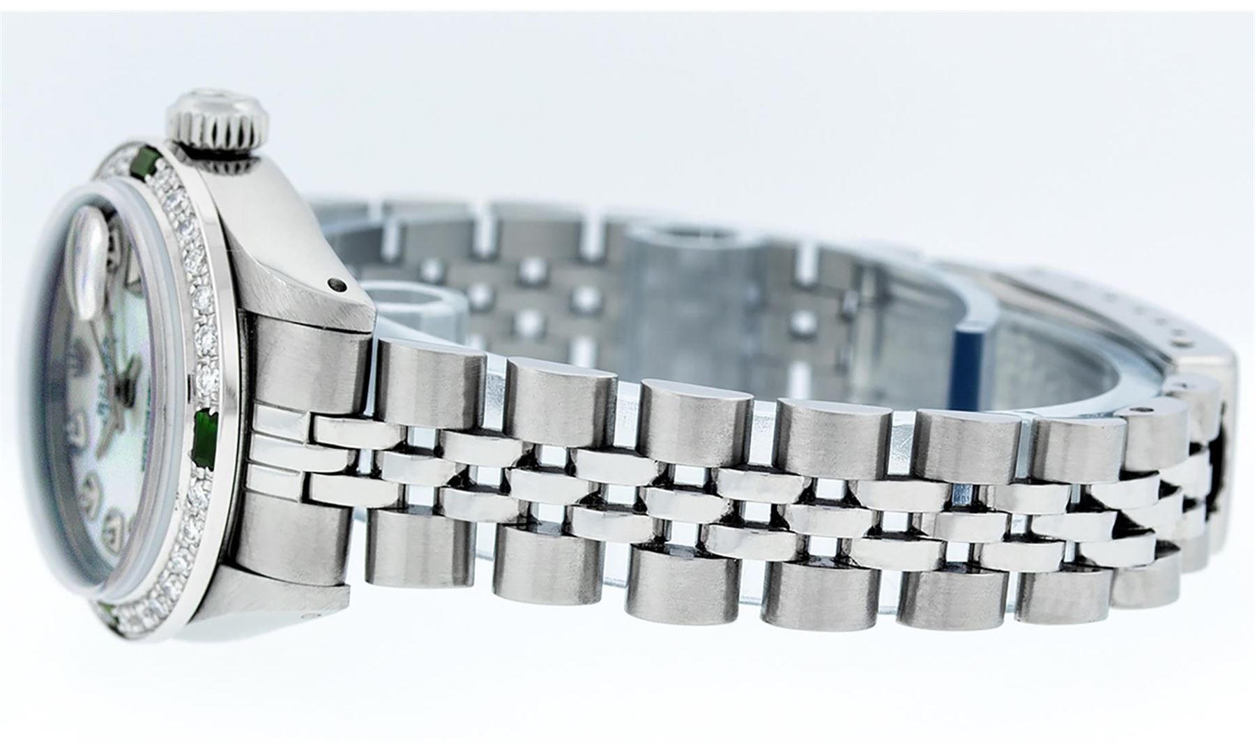 One Ladies Stainless Steel Rolex Datejust Polished Bright with Satin Finish, Serviced & Electronically Tested, Stainless Steel Case: 26mm, Stainless Steel Crown, Custom Bezel: New 18K White Gold Emerald Beadset Diamond Bezel, Diamond + Gem Count: 28 Diamonds + 4 Emeralds. Total Weight .70 Carat, Clarity: SI-VS, Color: G to H. Custom Crystal: New Scratch Resistant Synthetic Sapphire Cyclops Lens. Custom Hands: New Luminescent Hands. Movement: Automatic Winding Movement. Custom Dial: Refinished Blue Mother Of Pearl With Diamond Hour Markers, 10 Diamonds in Dial, G To H In Color, Clarity: SI-VS. Date Window: 3 O'clock Position Date Display, Model: Datejust. Condition: G-6 Extra Fine. Bracelet: Stainless Steel Jubilee Band. Bright Polish & Satin Finish. 6.0 Inch Length, Adjustable. Standard Clasp, With Rolex Logo. This Watch Has Been Serviced Time Tested And Is In Excellent Condition It Is Free Of All Scratches And Dents.