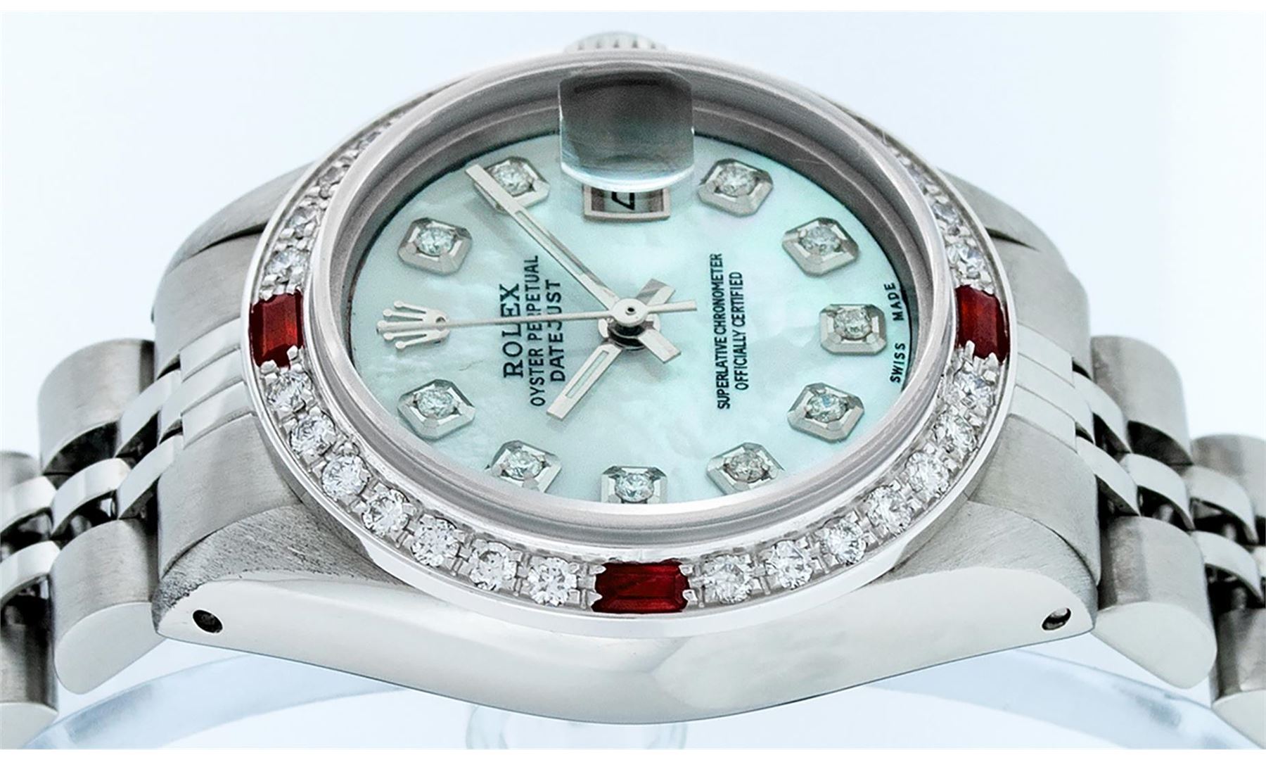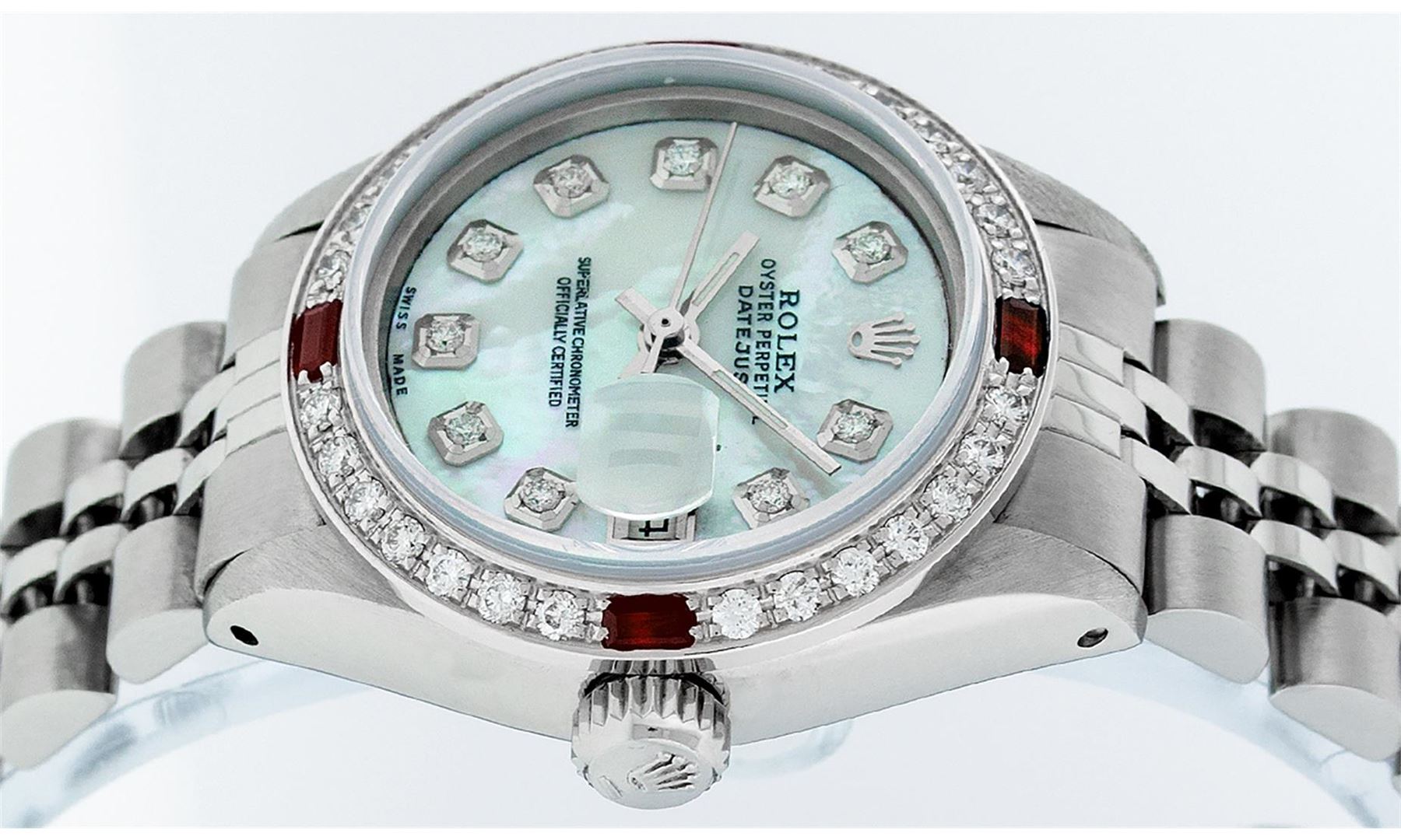 One Ladies Stainless Steel Rolex Datejust Polished Bright with Satin Finish, Serviced & Electronically Tested, Stainless Steel Case: 26mm, Stainless Steel Crown, Custom Bezel: New 18K White Gold Ruby Beadset Diamond Bezel, Diamond + Gem Count: 28 Diamonds + 4 Rubies. Total Weight .70 Carat, Clarity: SI-VS, Color: G to H. Custom Crystal: New Scratch Resistant Synthetic Sapphire Cyclops Lens. Custom Hands: New Luminescent Hands. Movement: Automatic Winding Movement Caliber 2030. Custom Dial: Refinished Blue Mother Of Pearl With Diamond Hour Markers, 10 Diamonds in Dial, G To H In Color, Clarity: SI-VS. Date Window: 3 O'Clock Position Date Display, Model: Datejust. Condition: G-6 Extra Fine. Bracelet: Stainless Steel Jubilee. Bright Polish & Satin Finish. 6.0 Inch Length, Adjustable. Standard Clasp, With Rolex Logo. This Watch Has Been Serviced Time Tested And Is In Excellent Condition It Is Free Of All Scratches And Dents.