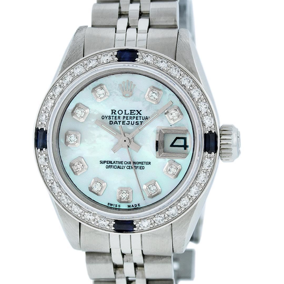 One Ladies Stainless Steel Rolex Datejust Polished Bright with Satin Finish, Serviced & Electronically Tested, Stainless Steel Case: 26mm, Stainless Steel Crown, Custom Bezel: New 18K White Gold Sapphire Beadset Diamond Bezel, Diamond + Gem Count: 28 Diamonds + 4 Sapphires. Total Weight .70 Carat, Clarity: SI-VS, Color: G to H. Custom Crystal: New Synthetic Sapphire Cyclops Lens. Custom Hands: New Luminescent Hands. Movement: Automatic Winding Movement Caliber 2030. Custom Dial: Refinished Blue Mother Of Pearl With Diamond Hour Markers, Diamond Count: 10 Diamond in Dial, G To H In Color, Clarity: SI-VS. Date Window: 3 O'Clock Position Date Display, Model: Datejust. Condition: G-6 Extra Fine. Bracelet: Stainless Steel Jubilee. Bright Polish & Satin Finish. 6.0 Inch Length, Adjustable. Standard Clasp, With Rolex Logo. This Watch Has Been Serviced Time Tested And Is In Excellent Condition It Is Free Of All Scratches And Dents.