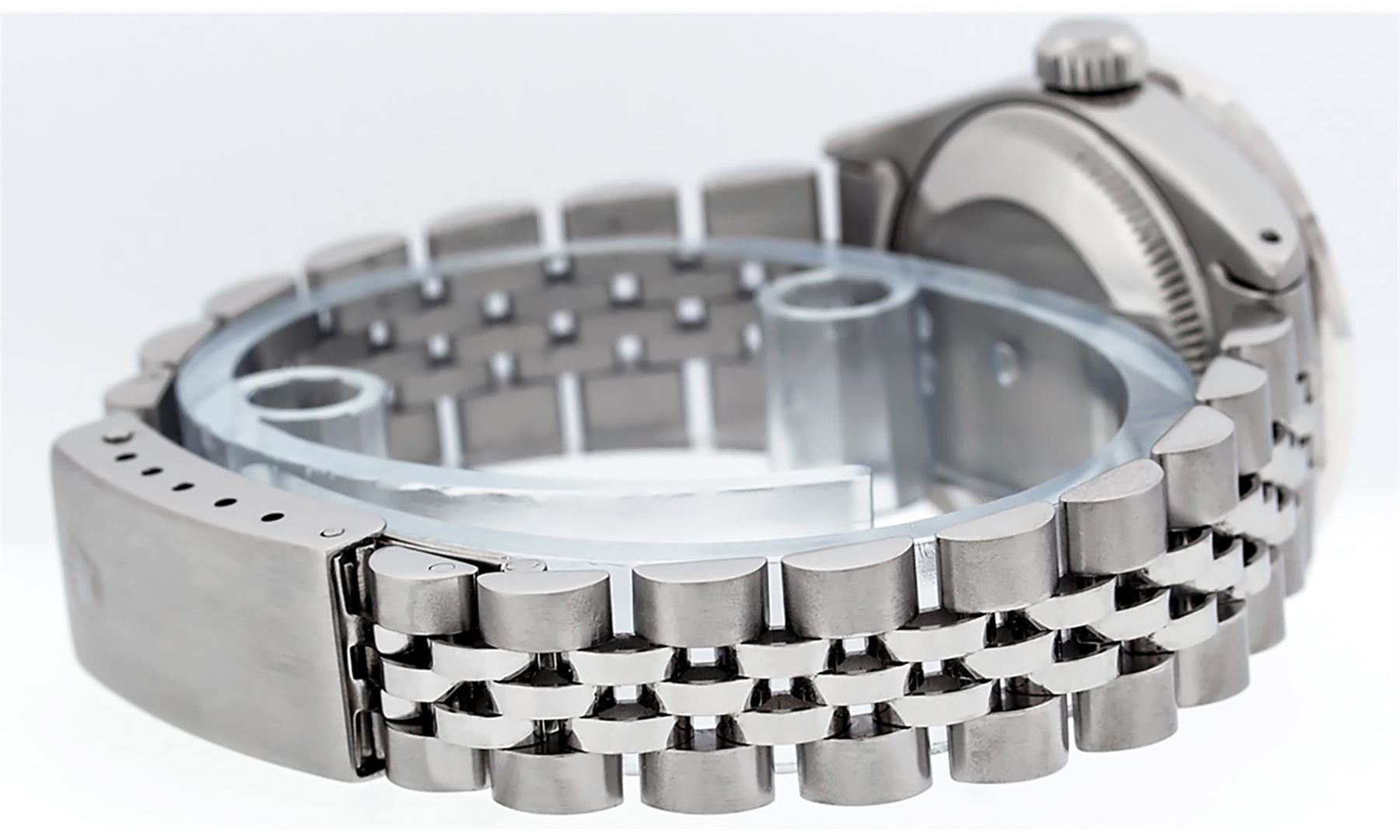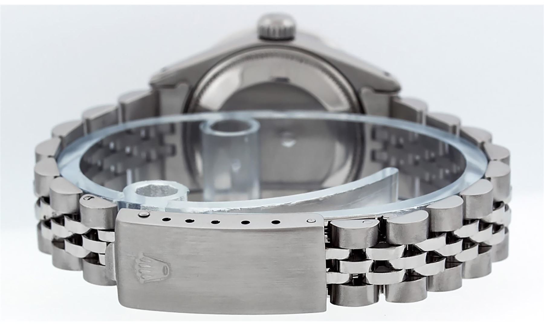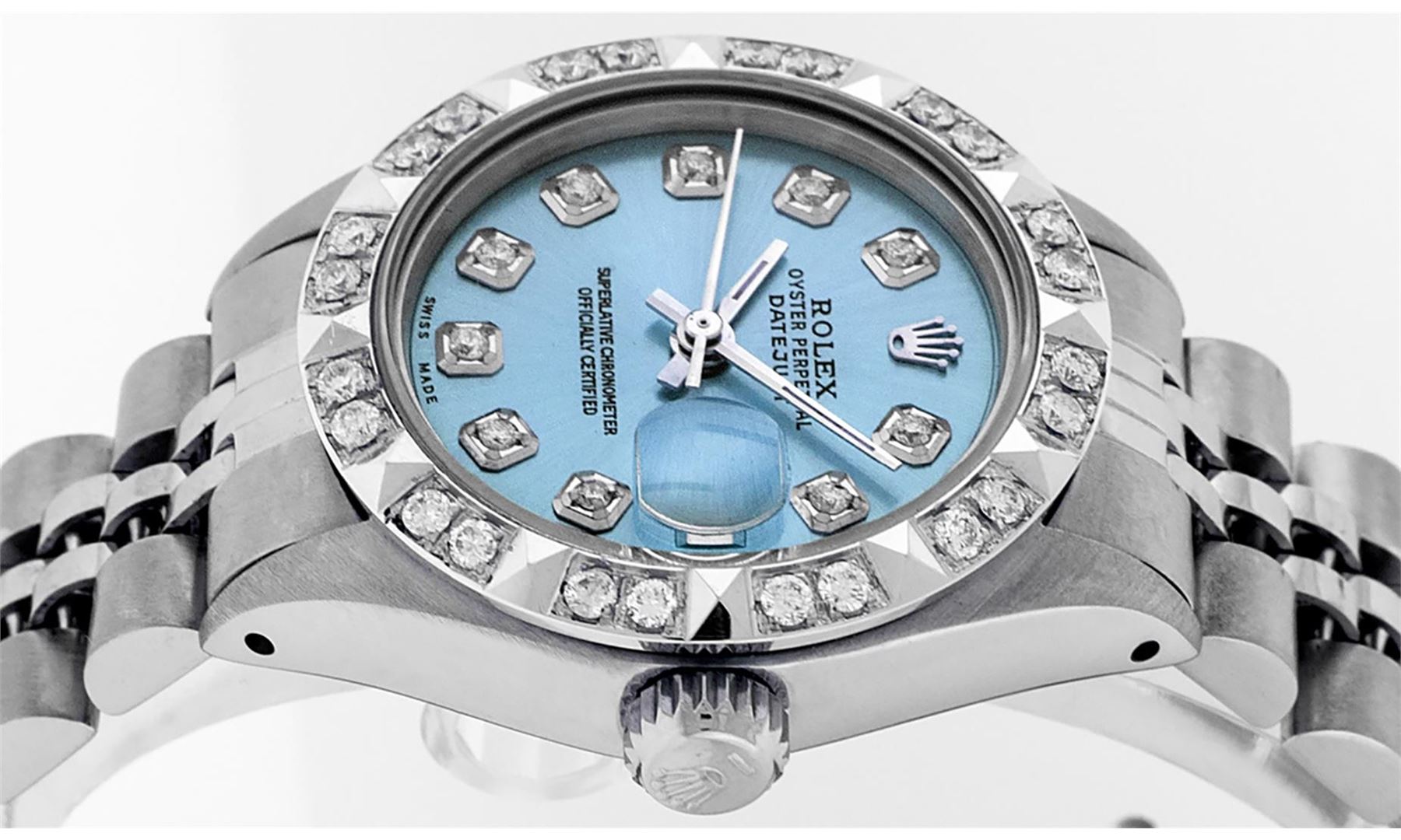 One Ladies Stainless Steel Rolex Datejust Polished Bright with Satin Finish, Serviced & Electronically Tested, Stainless Steel Case: 26mm, Stainless Steel Crown, Custom Bezel: New 18K White Gold Pyramid Diamond Bezel, Diamond Count: 24 Diamonds In Dial. Total Weight .50 Carat, Clarity: SI-VS, Color: G to H. Custom Crystal: New Scratch Resistant Synthetic Sapphire Cyclops Lens. Custom Hands: New Luminescent Hands. Movement: Automatic Winding Movement Caliber 2030. Custom Dial: Blue Diamond Dial. Diamond Count: 10 Diamonds In Dial. Clarity: SI-VS, Color: G to H. Date Window: 3 O'Clock Position Date Display, Model: Datejust. Condition: G-6 Extra Fine. Bracelet: Stainless Steel Jubilee Band With Rolex Crown On Buckle. Bright Polish & Satin Finish. Band Length: 6.0 Inch Length, Adjustable. Standard Clasp, With Rolex Logo. This Watch Has Been Serviced Time Tested And Is In Excellent Condition It Is Free Of All Scratches And Dents.