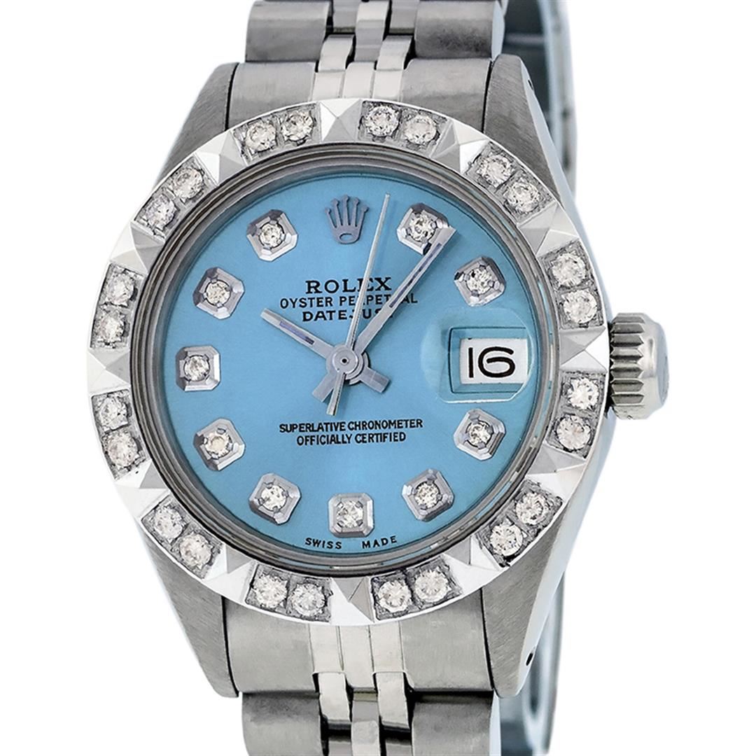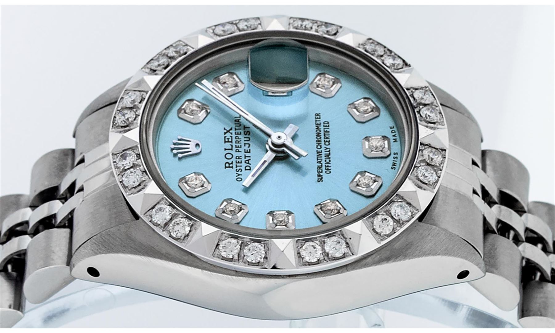 One Ladies Stainless Steel Rolex Datejust Polished Bright with Satin Finish, Serviced & Electronically Tested, Stainless Steel Case: 26mm, Stainless Steel Crown, Custom Bezel: New 18K White Gold Pyramid Diamond Bezel, Diamond Count: 24 Diamonds In Dial. Total Weight .50 Carat, Clarity: SI-VS, Color: G to H. Custom Crystal: New Scratch Resistant Synthetic Sapphire Cyclops Lens. Custom Hands: New Luminescent Hands. Movement: Automatic Winding Movement Caliber 2030. Custom Dial: Blue Diamond Dial. Diamond Count: 10 Diamonds In Dial. Clarity: SI-VS, Color: G to H. Date Window: 3 O'Clock Position Date Display, Model: Datejust. Condition: G-6 Extra Fine. Bracelet: Stainless Steel Jubilee Band With Rolex Crown On Buckle. Bright Polish & Satin Finish. Band Length: 6.0 Inch Length, Adjustable. Standard Clasp, With Rolex Logo. This Watch Has Been Serviced Time Tested And Is In Excellent Condition It Is Free Of All Scratches And Dents.