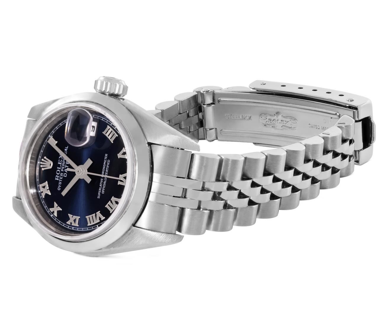 One Rolex Ladies Pre Owned Stainless Steel Date Wristwatch Polished Bright with Satin Finish, Serviced & Electronically Tested, Stainless Steel Case: 26mm, Stainless Steel Crown, Rolex Stainless Steel Smooth bezel. Crystal: Sapphire With Magnified Date Window. Custom Hands: New Solid Hands. Rolex Movement: 2235 Automatic Winding Movement. Rolex Dial: Factory Blue Dial With Roman Hour Markers, Square Track. Date Window: 3 O'Clock Position Date Display, Model: Quickset Sapphire Date. Condition: G-6 Extra Fine. Rolex Bracelet: Stainless Steel Jubilee Band. Bright Polish & Satin Finish. 6.0 Inch Length, Adjustable. Standard Clasp, With Rolex Logo. This Watch Has Been Serviced And Time Tested. It Is In Excellent Condition, Free Of All Scratches And Dents.