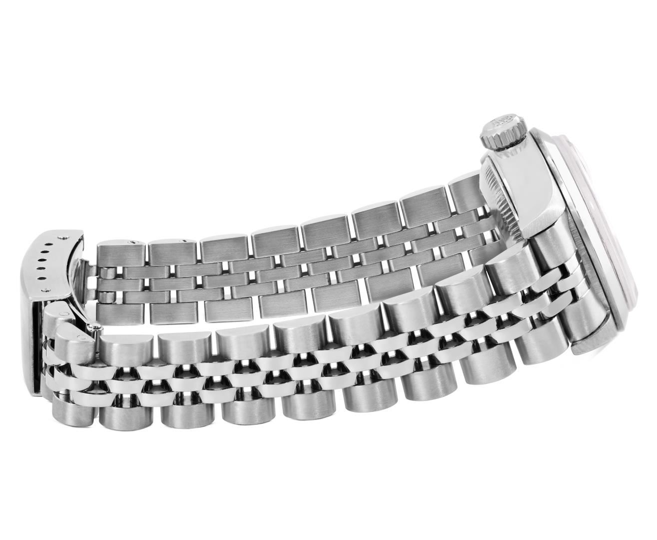 One Rolex Ladies Pre Owned Stainless Steel Date Wristwatch Polished Bright with Satin Finish, Serviced & Electronically Tested, Stainless Steel Case: 26mm, Stainless Steel Crown, Rolex Stainless Steel Smooth bezel. Crystal: Sapphire With Magnified Date Window. Custom Hands: New Solid Hands. Rolex Movement: 2235 Automatic Winding Movement. Rolex Dial: Factory Blue Dial With Roman Hour Markers, Square Track. Date Window: 3 O'Clock Position Date Display, Model: Quickset Sapphire Date. Condition: G-6 Extra Fine. Rolex Bracelet: Stainless Steel Jubilee Band. Bright Polish & Satin Finish. 6.0 Inch Length, Adjustable. Standard Clasp, With Rolex Logo. This Watch Has Been Serviced And Time Tested. It Is In Excellent Condition, Free Of All Scratches And Dents.