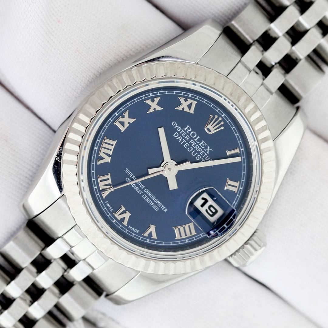 One Ladies Pre Owned Quickset Sapphire Stainless Steel Rolex Datejust Polished Bright with Satin Finish, Serviced & Electronically Tested, Rolex Stainless Steel Case: 26mm, Rolex Stainless Steel Crown, Rolex Bezel: 18K White Gold Fluted Bezel. Crystal: Sapphire With Magnified Date Window. Hands: Luminescent Hands. Rolex Movement: Automatic Winding Movement 2235. Rolex Dial: Blue With Roman Hour Markers With Square Track. Date Window: 3 O'Clock Position Date Display, Model: Sapphire Quickset Datejust. Condition: G-6 Extra Fine. Rolex Bracelet: Stainless Steel Jubilee Band. Bright Polish & Satin Finish. 6.0 Inch Length, Adjustable. Hidden Clap, With Rolex Logo. This Watch Has Been Serviced Time Tested And Is In Excellent Condition It Is Free Of All Scratches And Dents.