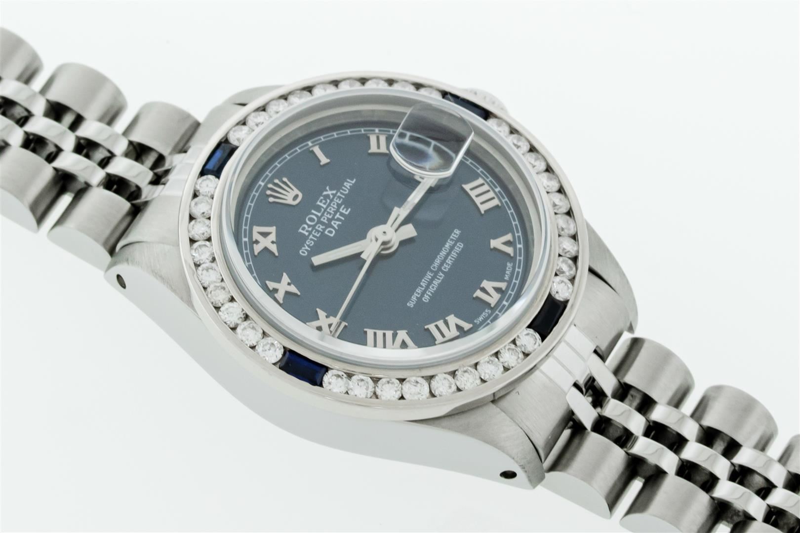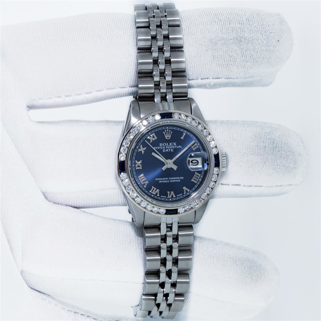 One Ladies Stainless Steel Rolex Datejust Polished Bright with Satin Finish, Serviced & Electronically Tested, Rolex Stainless Steel Case: 26mm, Rolex Stainless Steel Crown, Custom Bezel: New 18K White Gold Sapphire Channel Set Diamond Bezel, Diamond + Gem Count: 36 Diamonds + 4 Sapphires, Clarity: SI-VS, Color: G to H. Custom Crystal: New Sapphire With Magnified Date Window. Custom Hands: New Luminescent Hands. Rolex Movement: Automatic Winding Rolex Movement. Rolex Dial: Blue Roman Dial With Square Track. Date Window: 3 O'clock Position Date Display, Model: Datejust. Condition: G-6 Extra Fine. Rolex Bracelet: Stainless Steel Jubilee Band. Bright Polish & Satin Finish. 6.0 Inch Length, Adjustable. Standard Clasp, With Rolex Logo. This Pre Owned Watch Has Been Serviced Time Tested And Is In Excellent Condition It Is Free Of All Scratches And Dents.